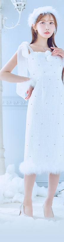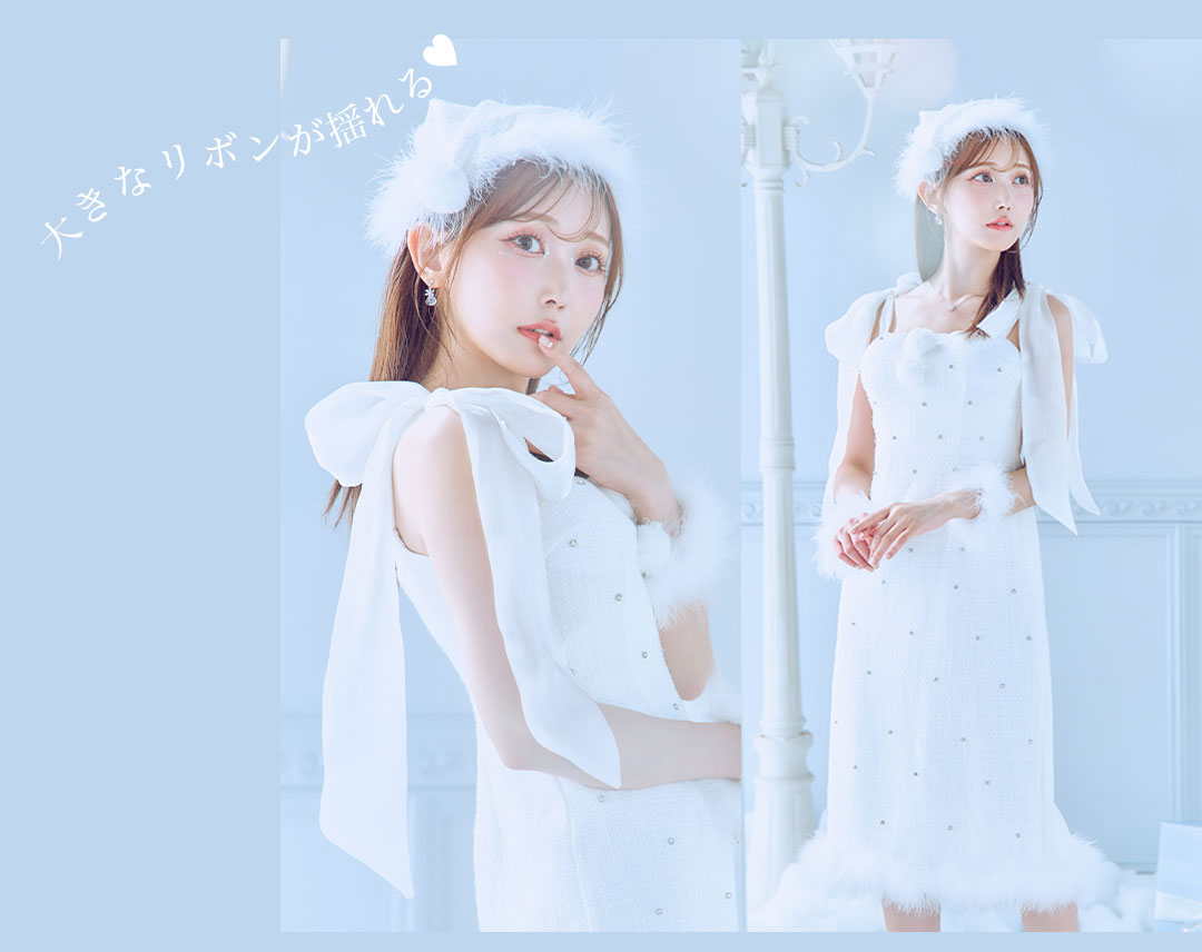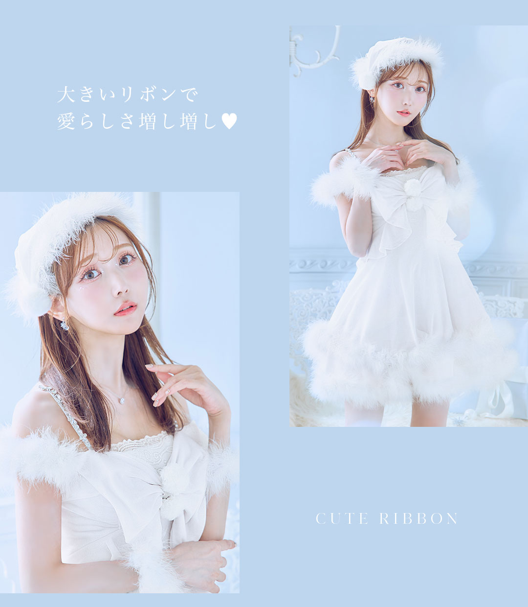 大きなリボンを胸元に、ボリュームのある2段フリルで美脚効果も。