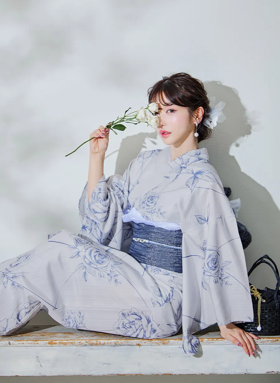 落ち着きのあるグレー地に上品なブルーローズが咲き誇る