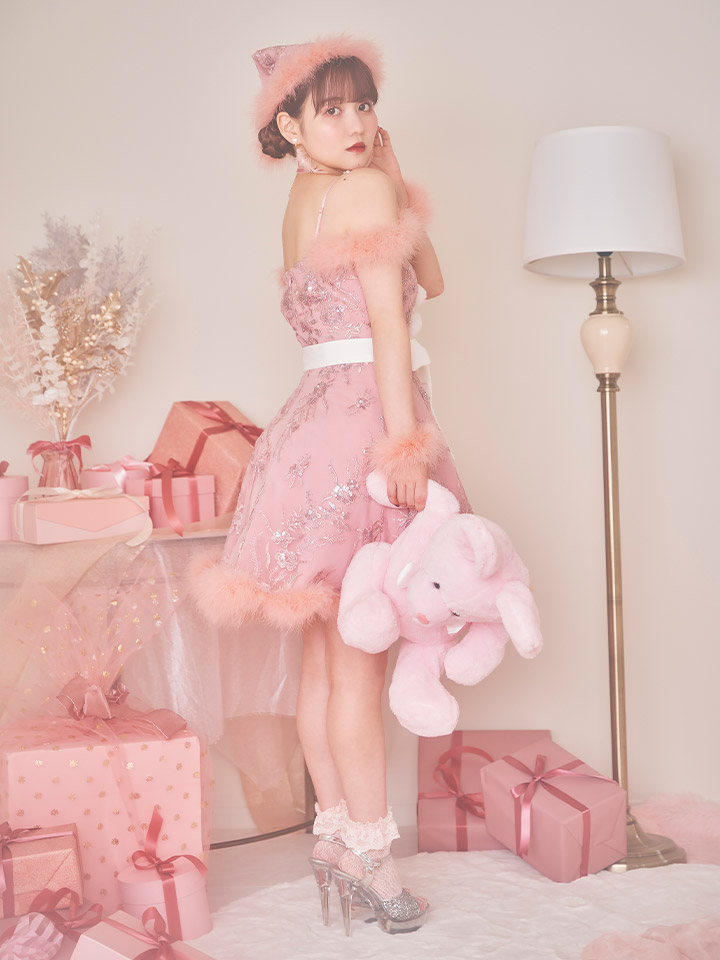 帽子/ワンピース/白リボンベルト/ファーブレス/ポンポンカラー