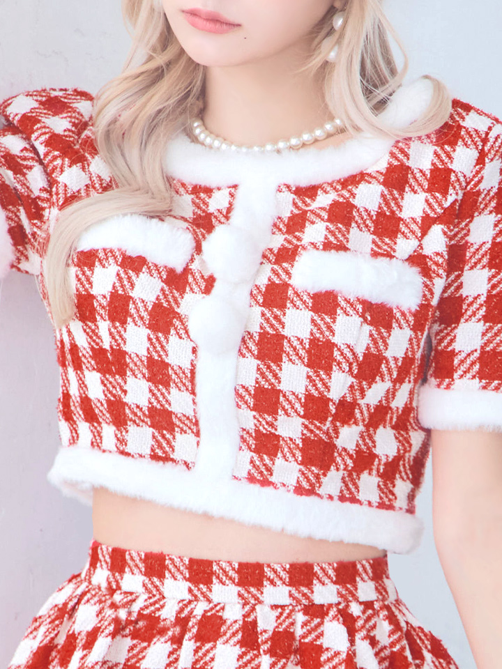 セットアップ フレアスカート 胸元隠し ツイード レッド ホワイト ミニ