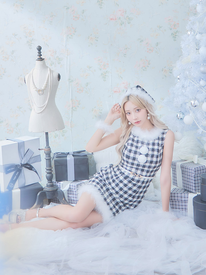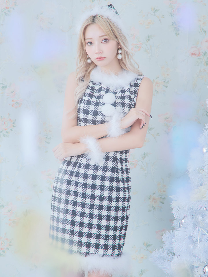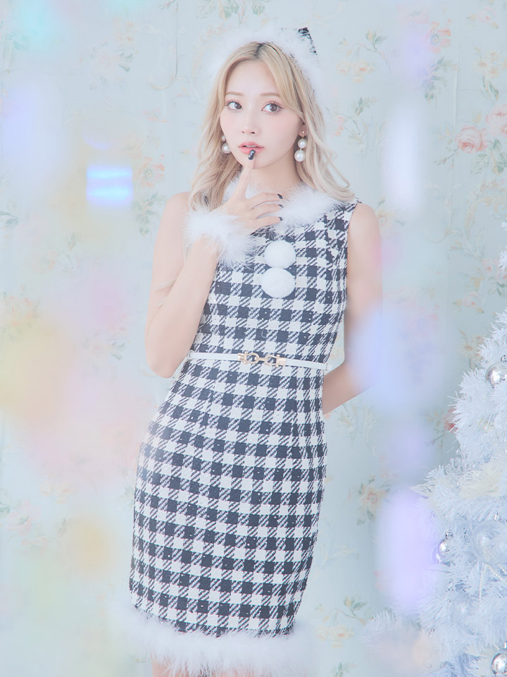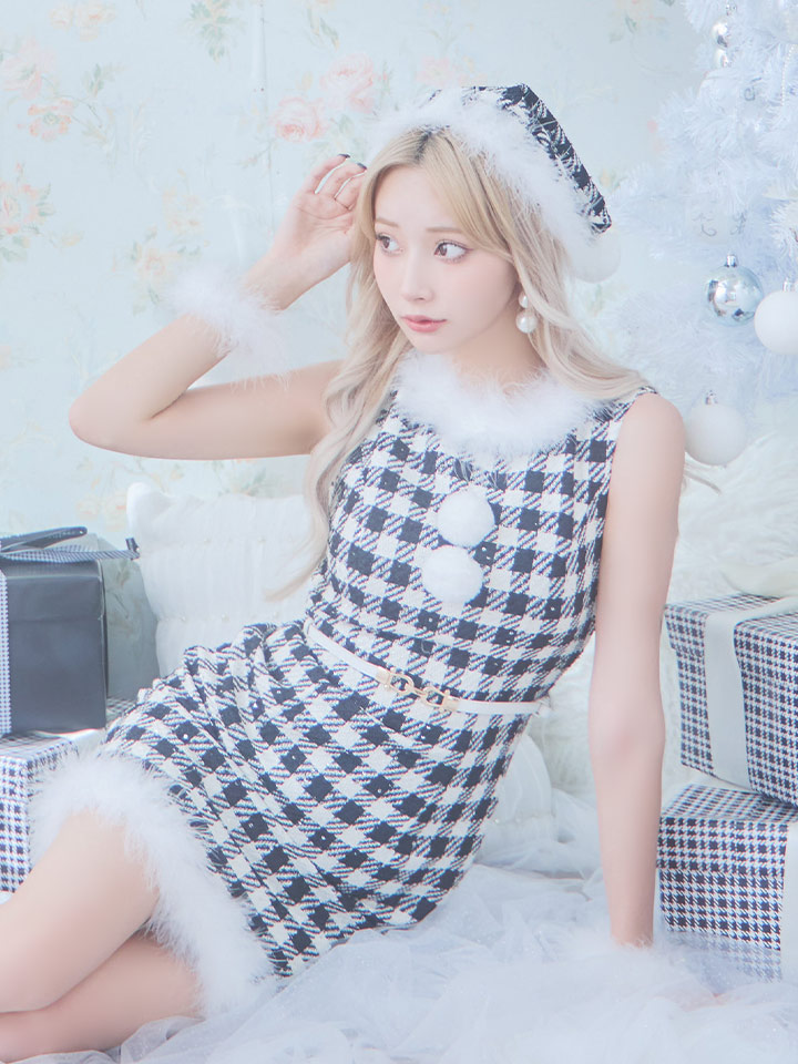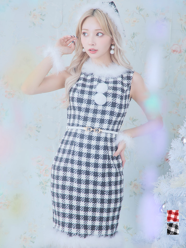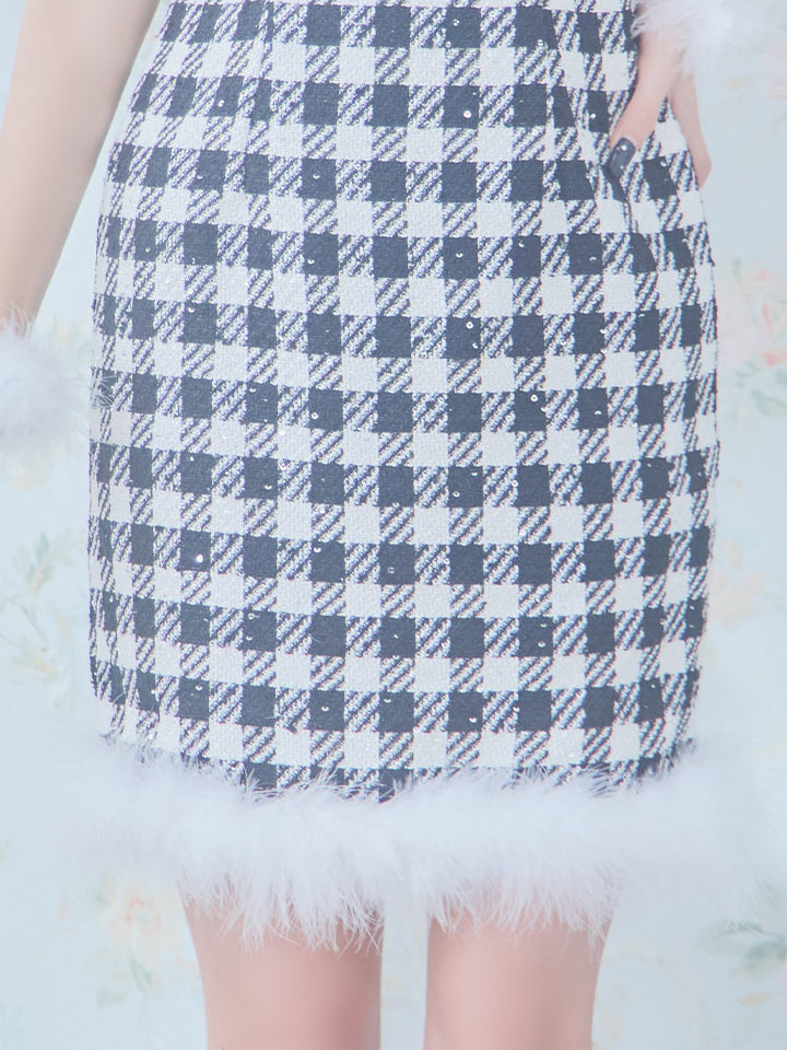 胸元隠し タイトスカート ファー ツイード チェック レッド ホワイト ミニ スカート