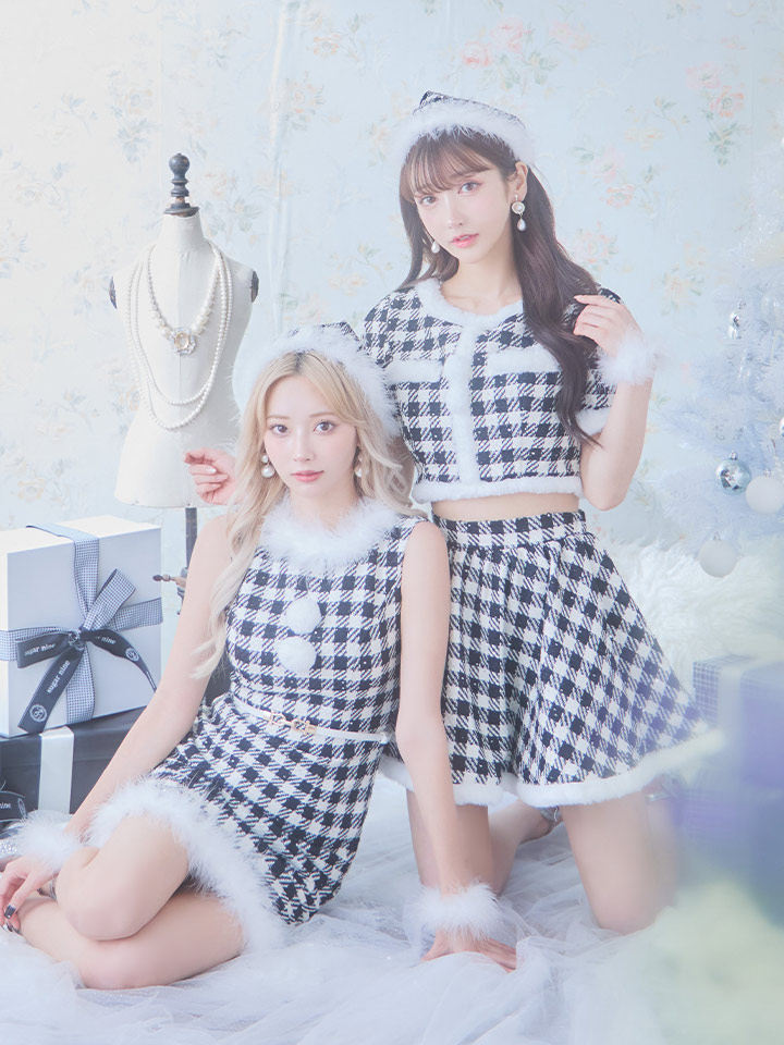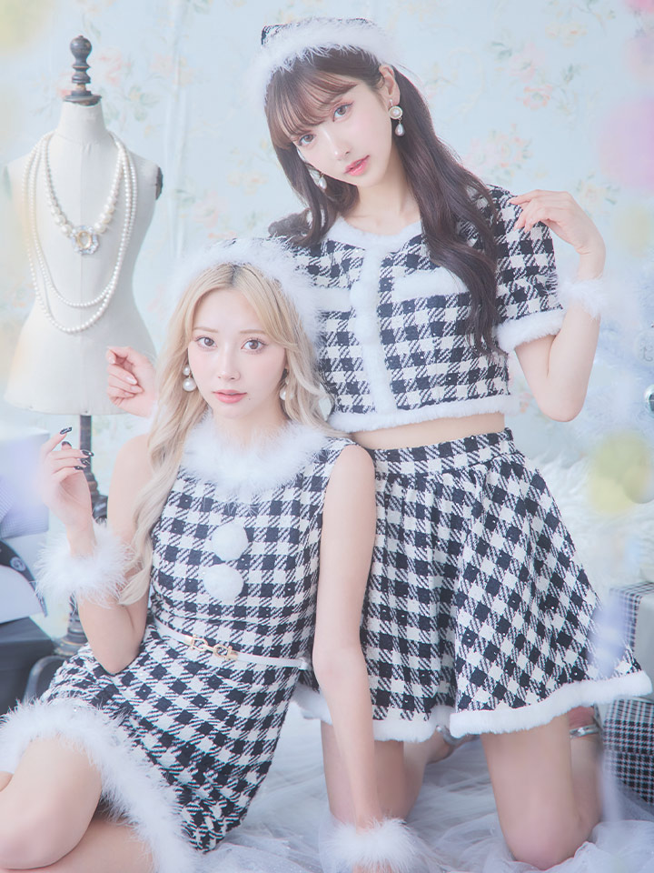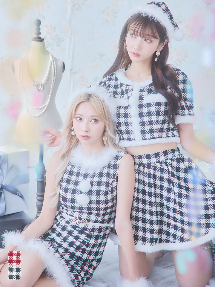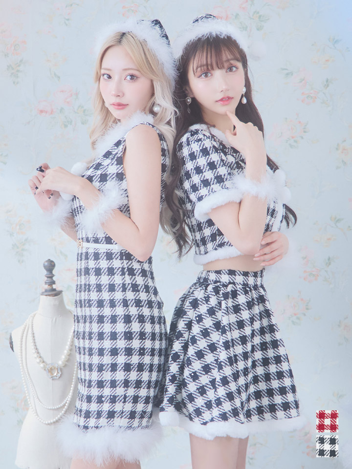 胸元隠し タイトスカート ファー ツイード チェック レッド ホワイト ミニ スカート
