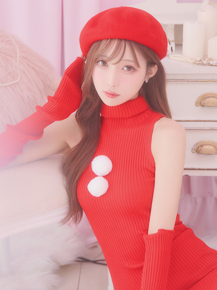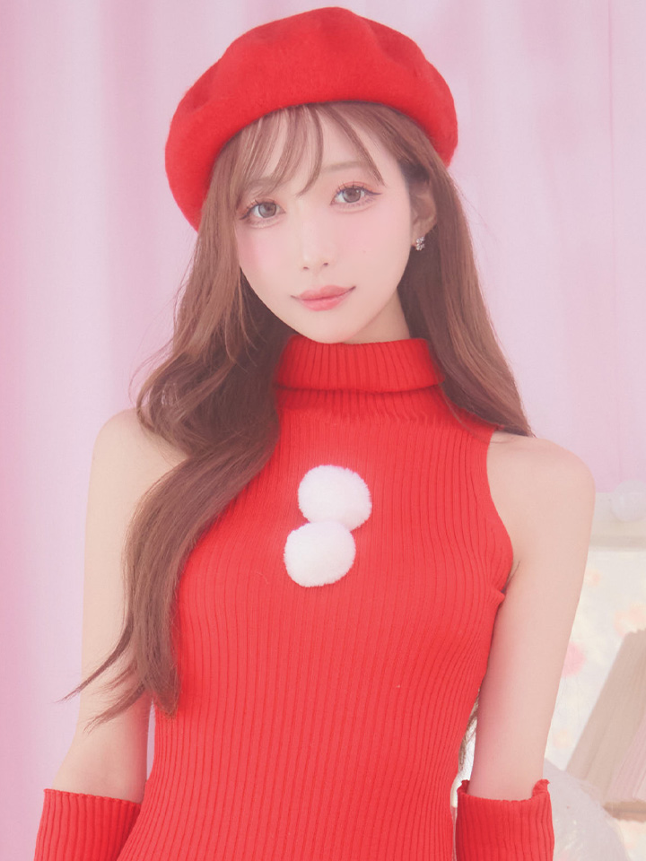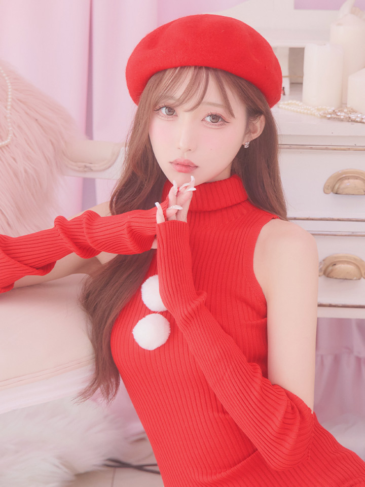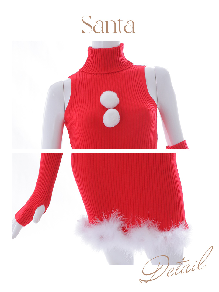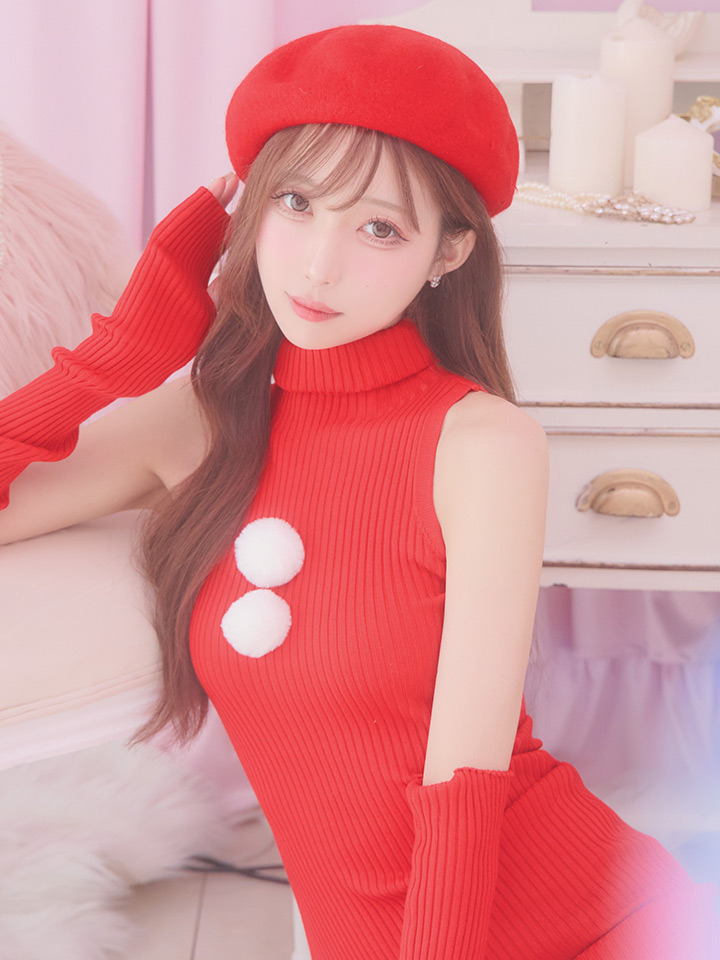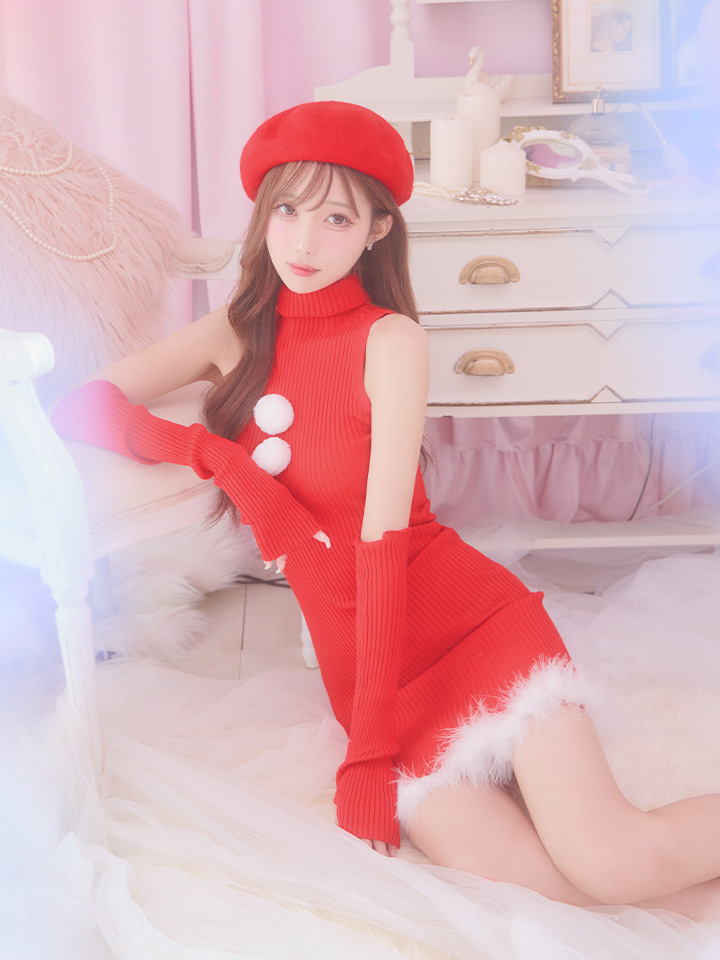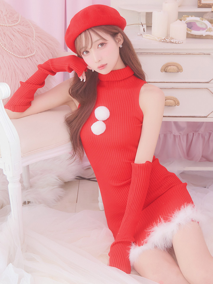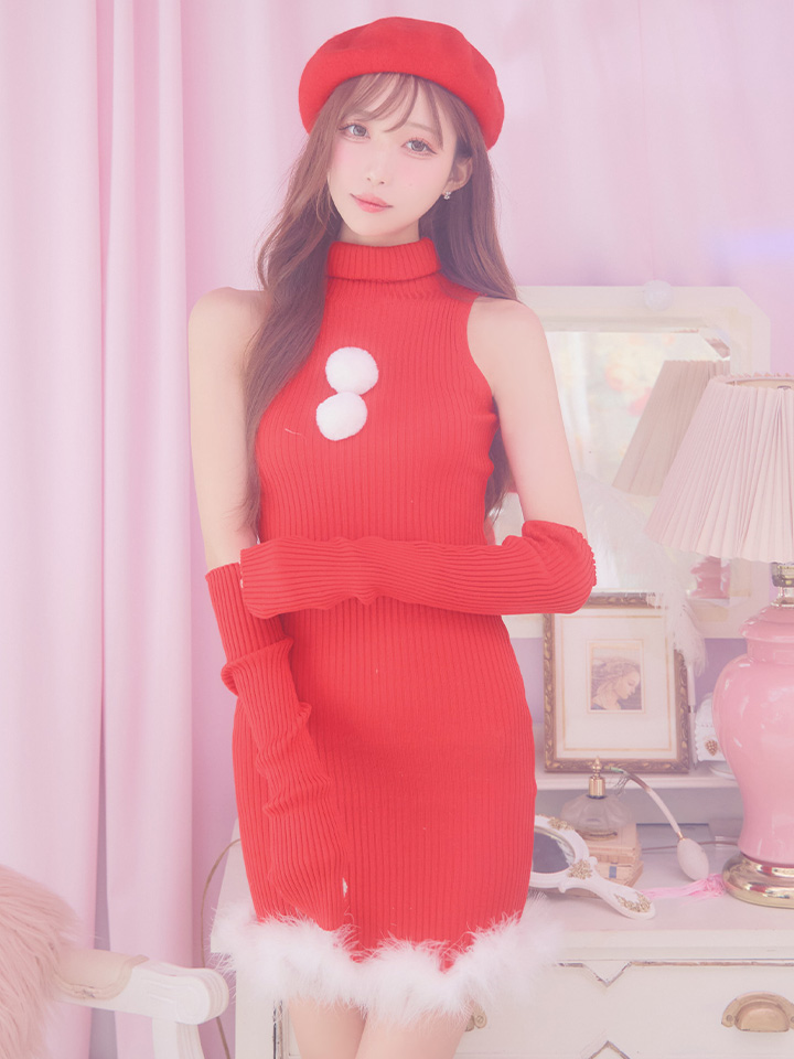 ワンピース タイトスカート 胸元隠し レッド ミニ ニット ファー