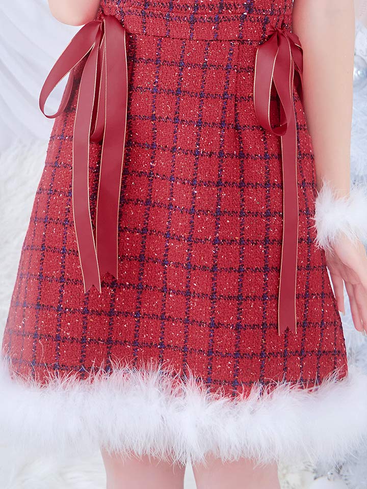 ワンピース ツイード チェック レッド ファー 胸元隠し リボン