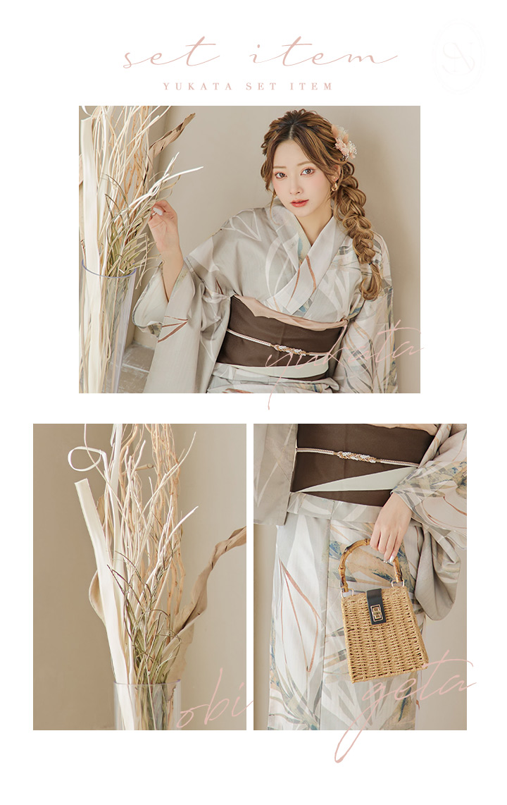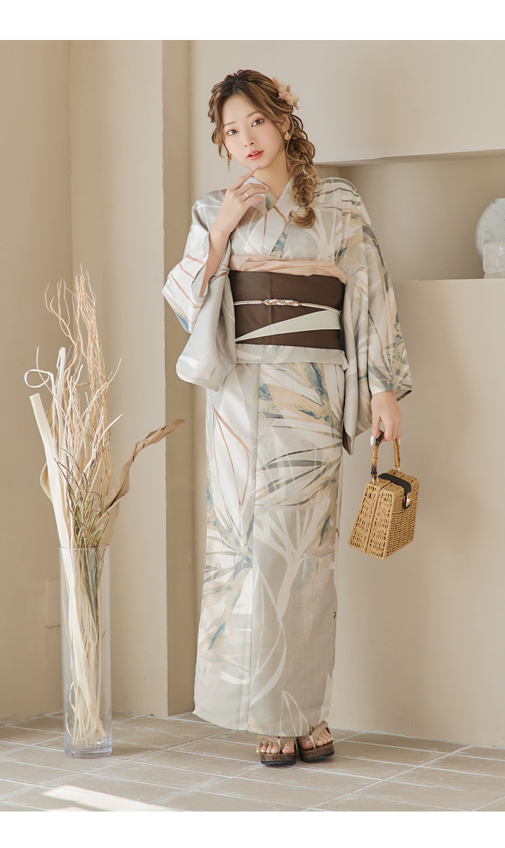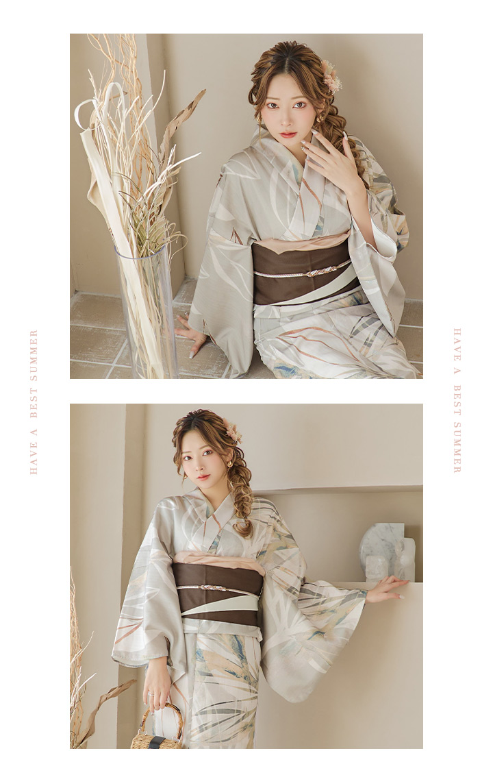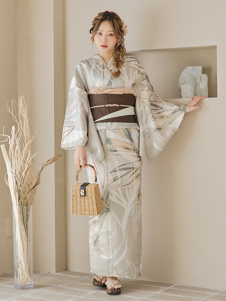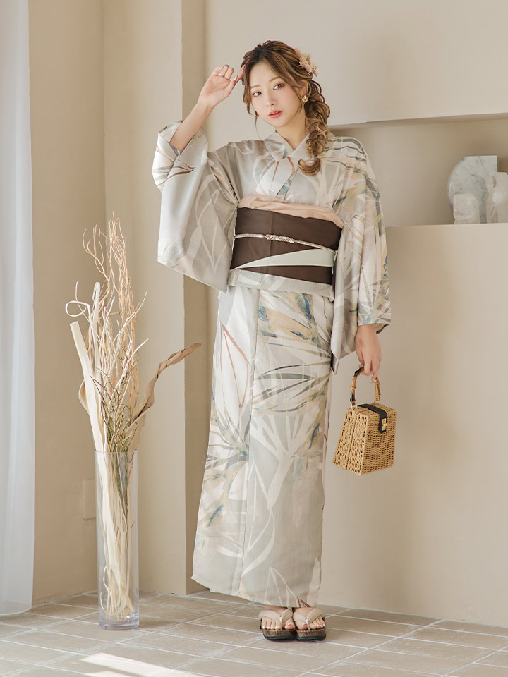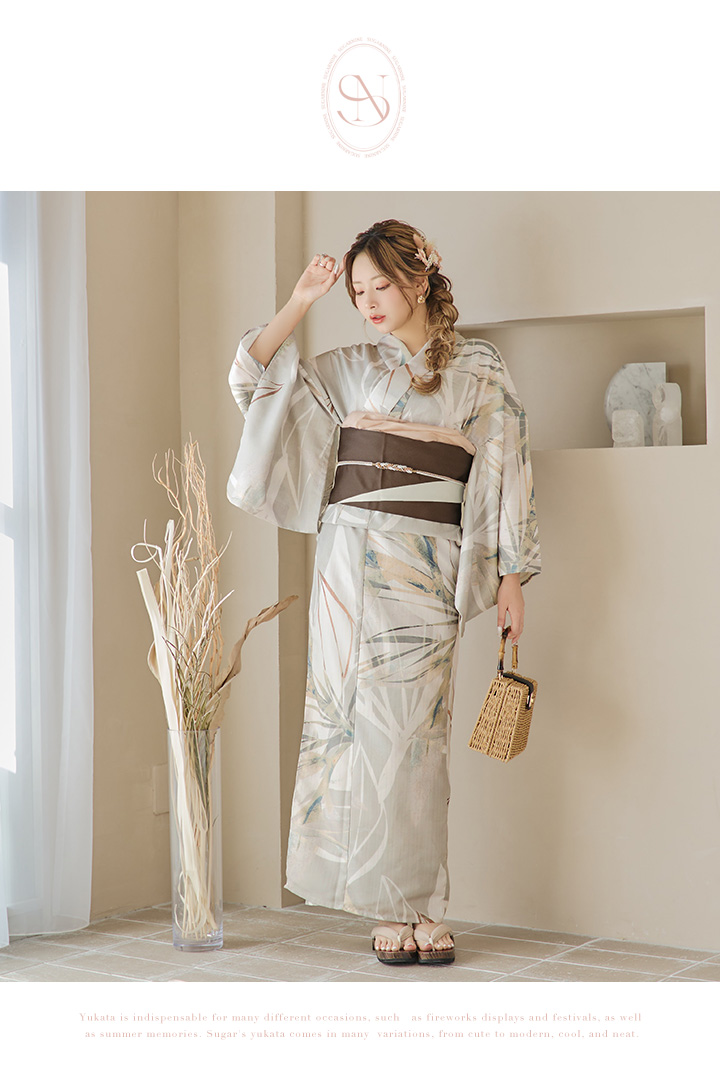 【即日発送】【浴衣セール!】ヘルシーリーフ柄ベージュ浴衣 【浴衣3点セット 浴衣/帯/下駄】 [YMT] [OY8032nz-24PY-dzh]