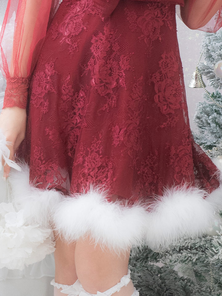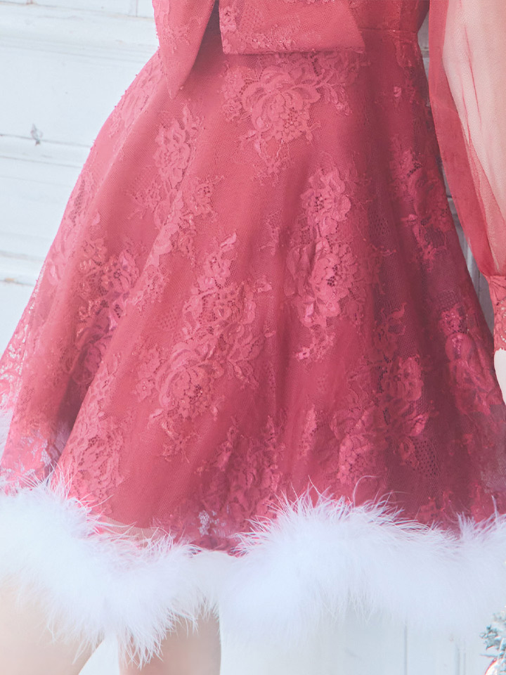 ワンピース 長袖 リボン レース レッド ファー セクシー