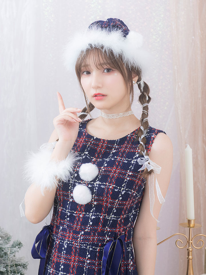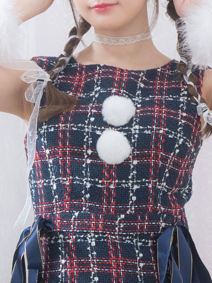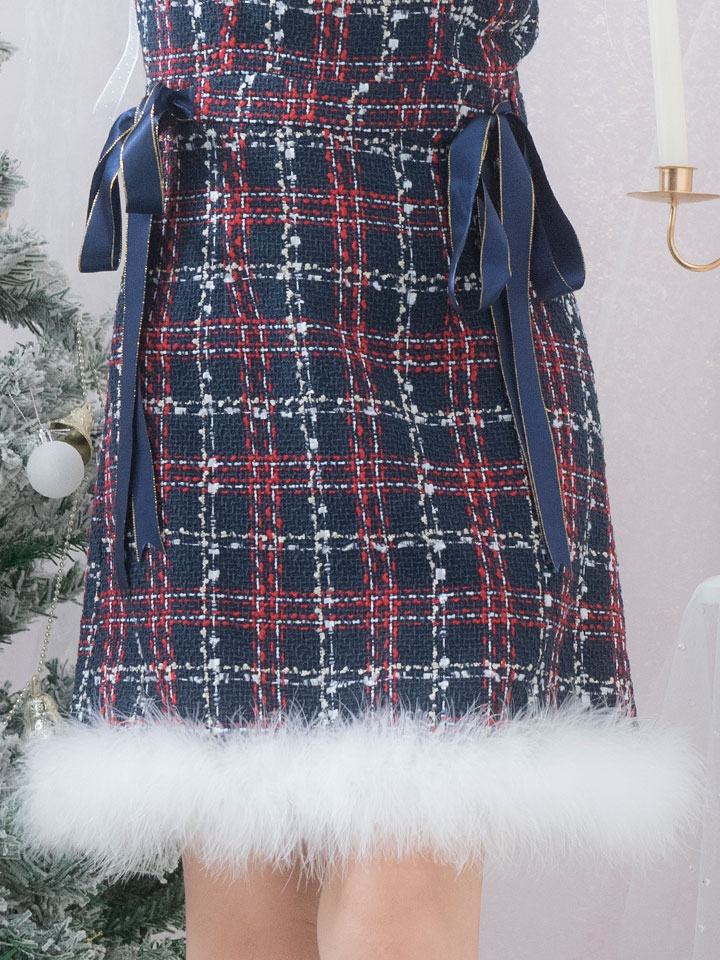 ワンピース ツイード チェック レッド ネイビー 赤 紺 ファー 胸元隠し リボン