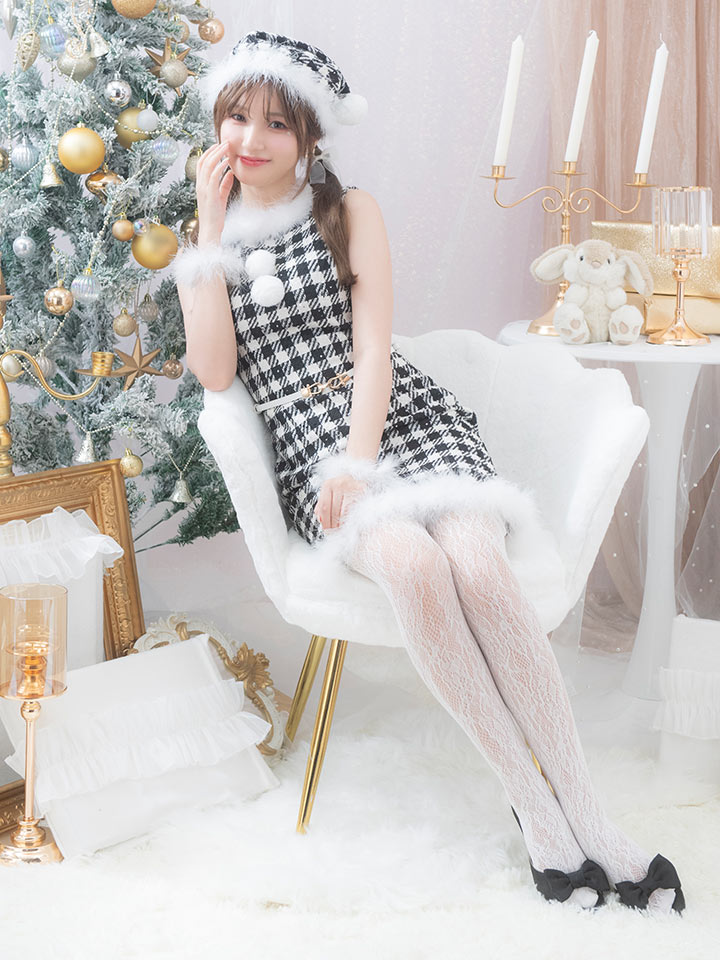 胸元隠し タイトスカート ファー ツイード チェック レッド ホワイト ミニ スカート