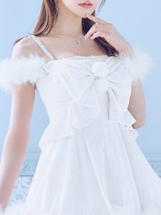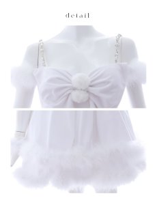 大きなリボンを胸元に、ボリュームのある2段フリルで美脚効果も。