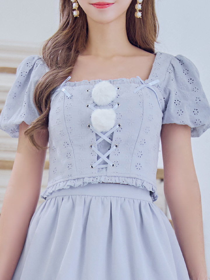 可愛らしいトップスに編み上げのレースアップをミックスしてトレンドをON!