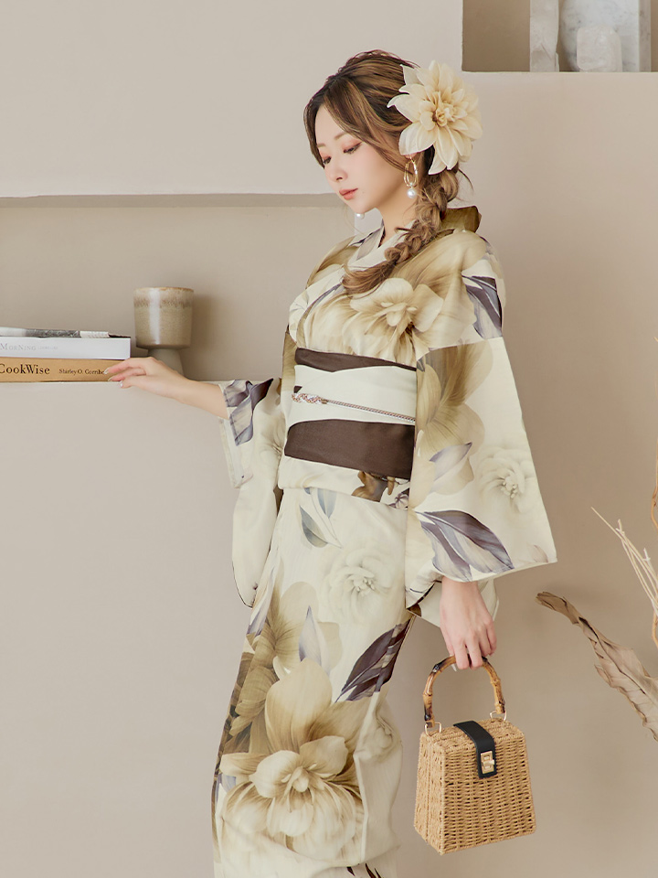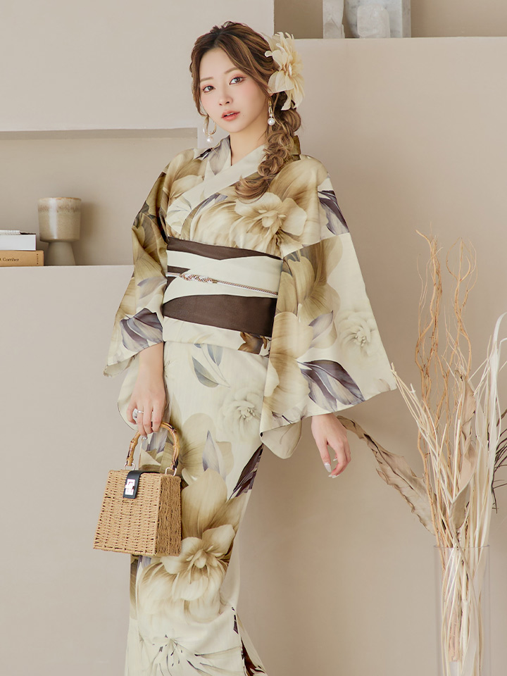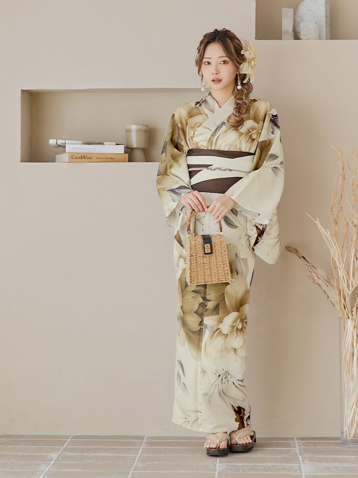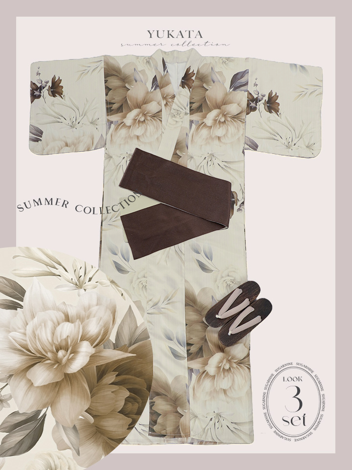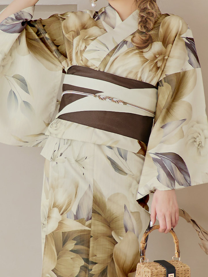 【即日発送!】ブラウンベージュクラシックフラワー浴衣 【浴衣3点セット 浴衣/帯/下駄】 [YMT] [Y-8052-nz-dzh-BE-F-24PY]