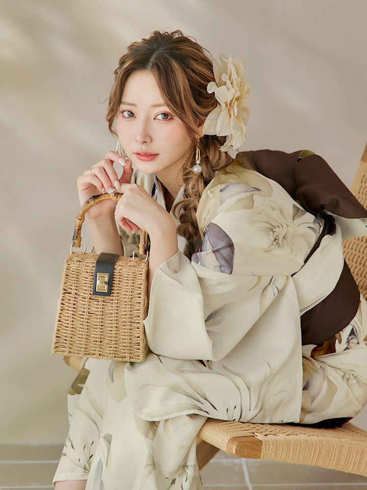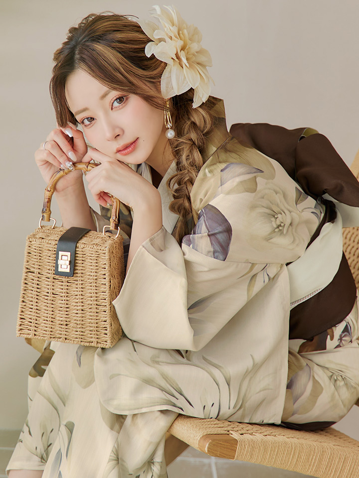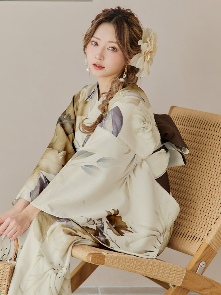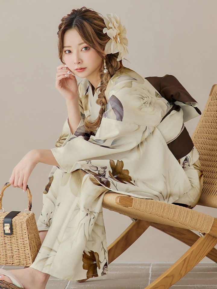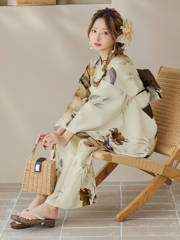 【即日発送!】ブラウンベージュクラシックフラワー浴衣 【浴衣3点セット 浴衣/帯/下駄】 [YMT] [Y-8052-nz-dzh-BE-F-24PY]