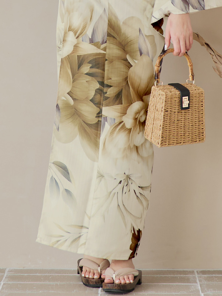ベージュ地に咲く大ぶりな牡丹がインパクトのある浴衣。
