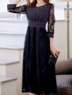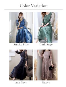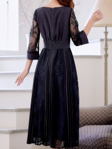オケージョンドレス/ パーティードレス/ お呼ばれドレス/ プリーツ/ Aライン/ 総レース/ 袖あり/ 七分袖/ ミモレ丈/ ワンピース[OF05] [G9819HL-SmoBL-S2210]