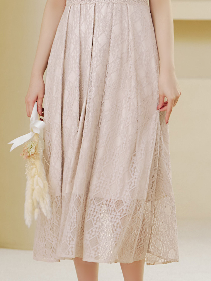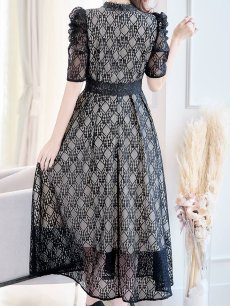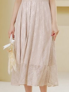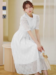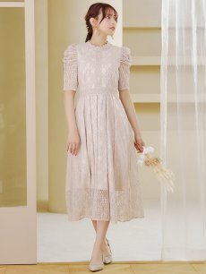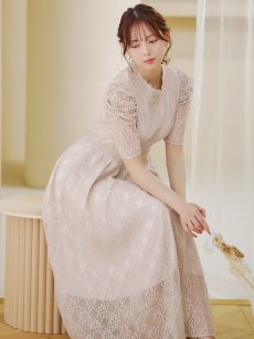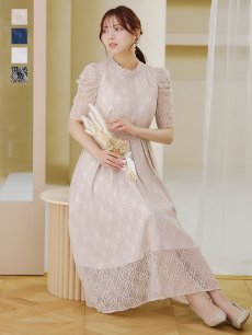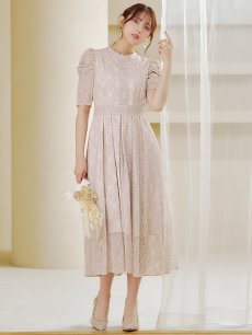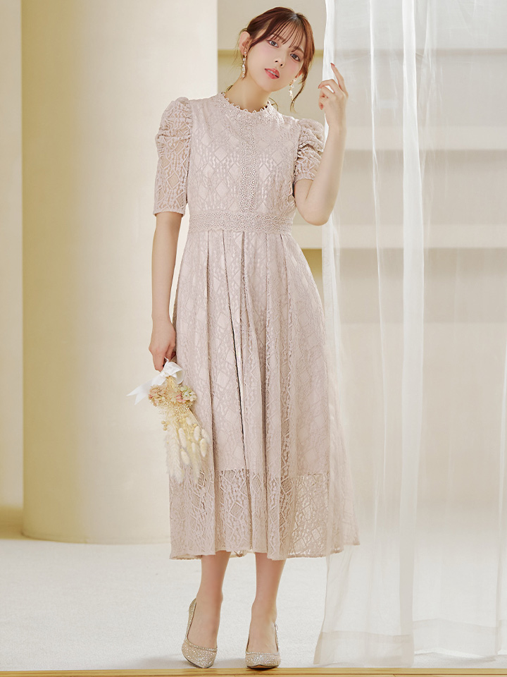 程よい透け感とやや首の詰まったデザインがクラシカルな総レースミモレ丈ドレス