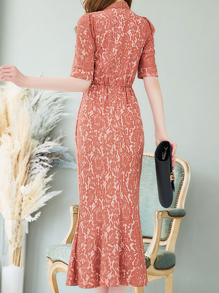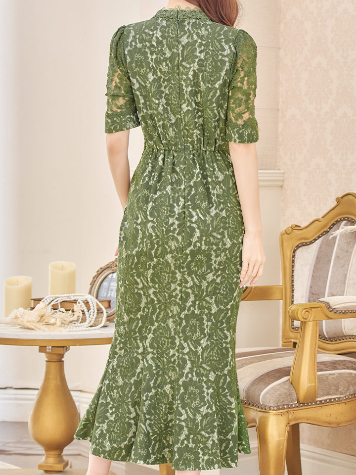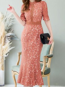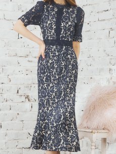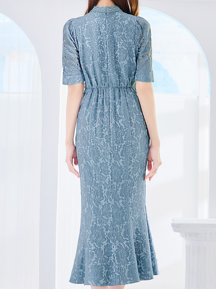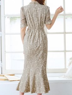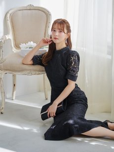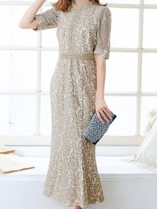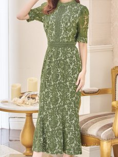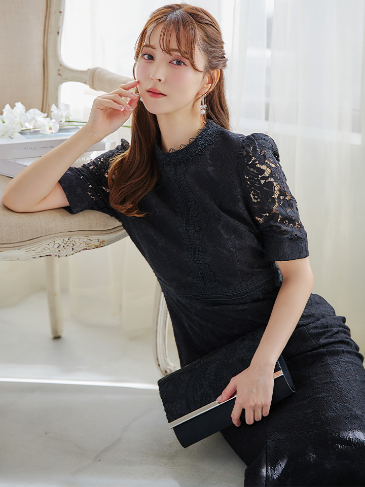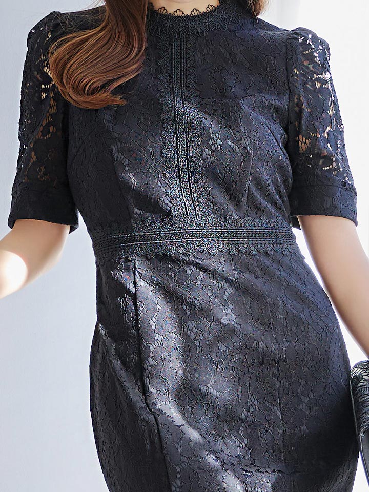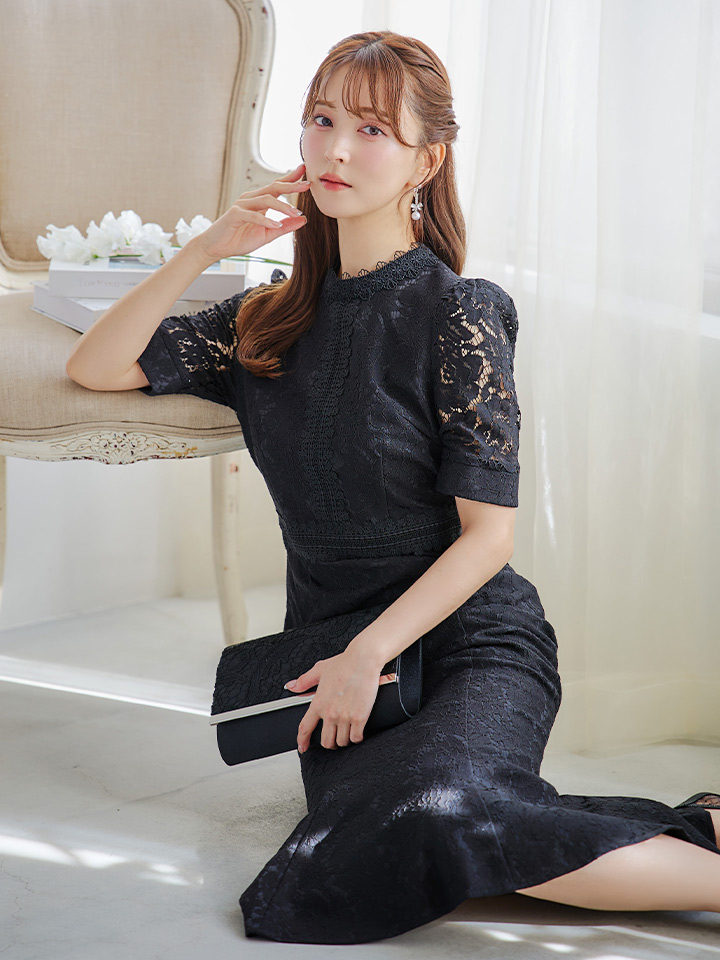 程よい透け感とやや首の詰まったデザインがクラシカルな総レースミモレ丈ドレス