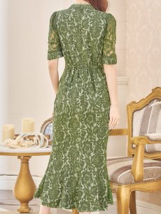 オケージョンドレス/ パーティードレス/ お呼ばれドレス/ 総レース/ パフスリーブ/ 袖あり/ 五分袖/ ミモレ丈/ マーメイド/ ワンピース[OF05]
