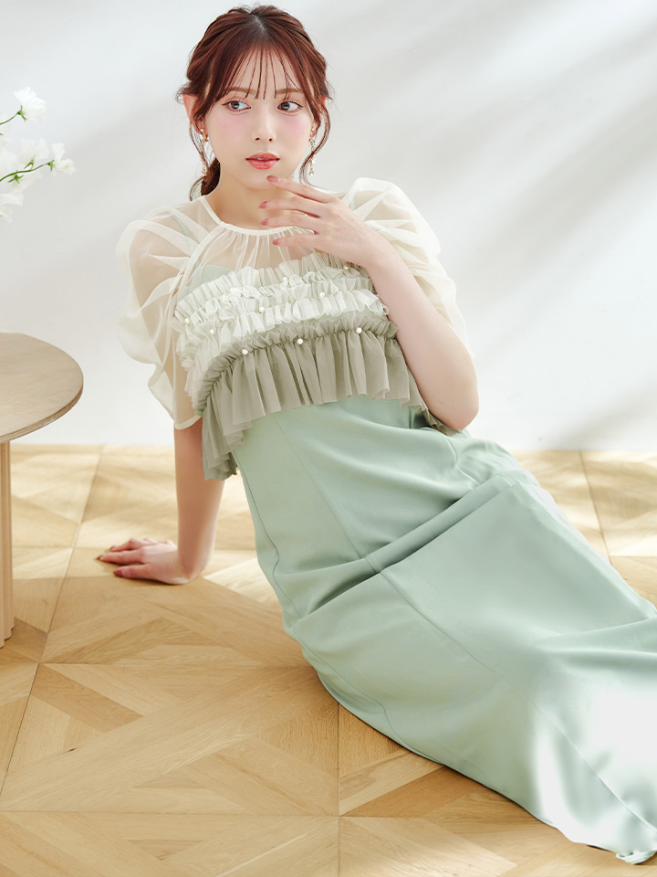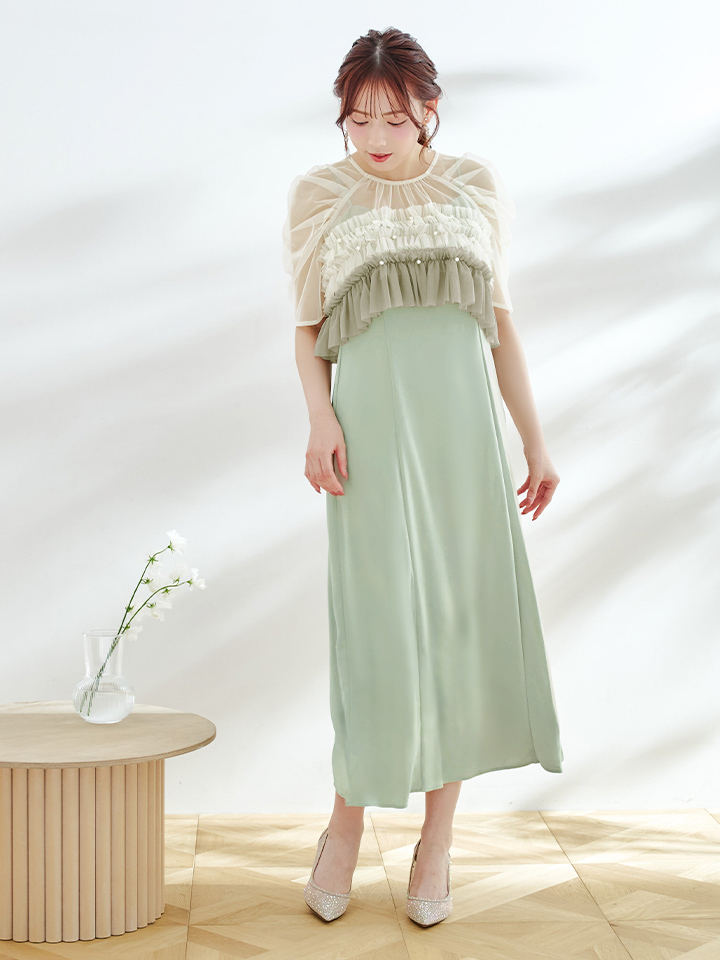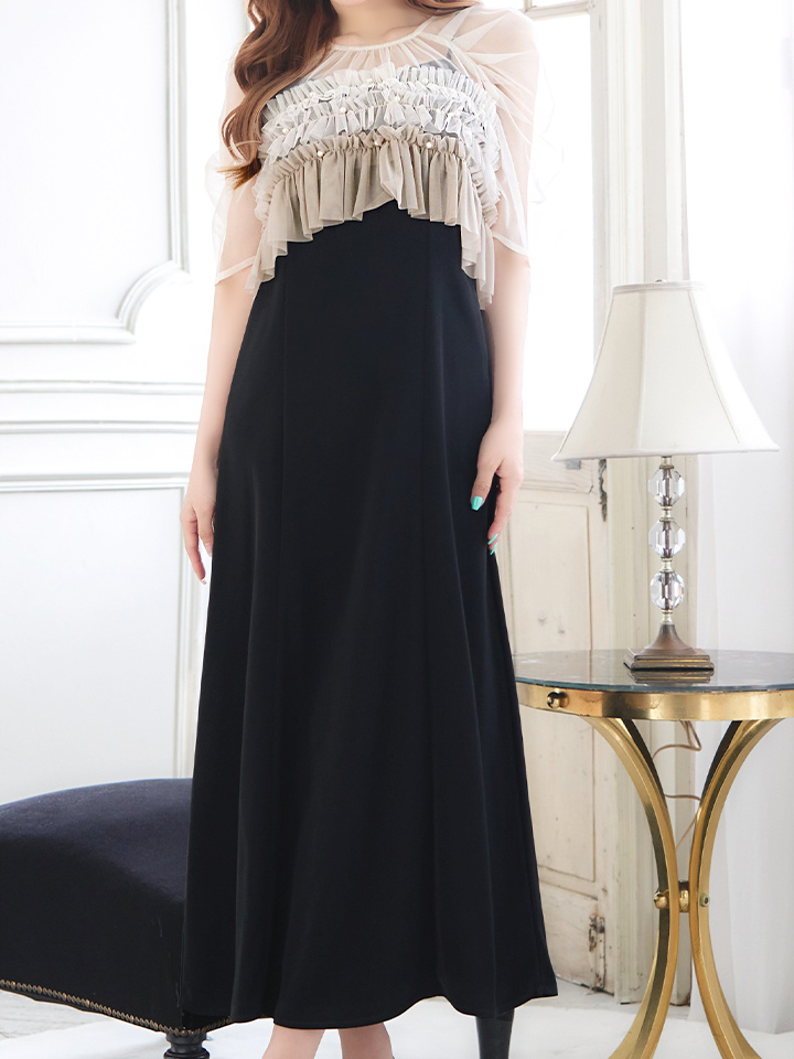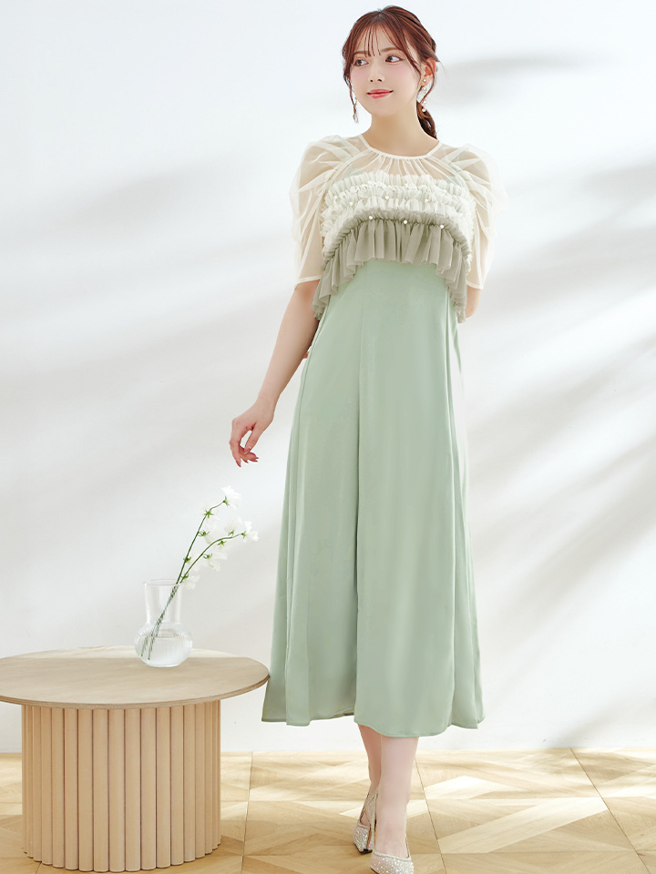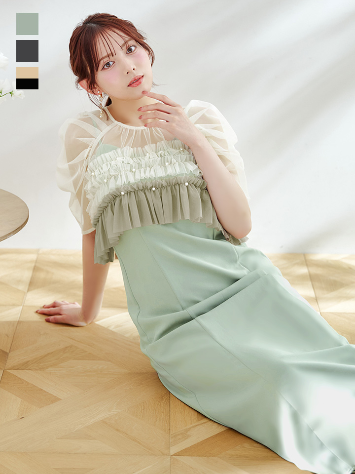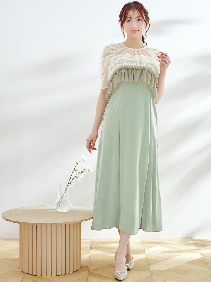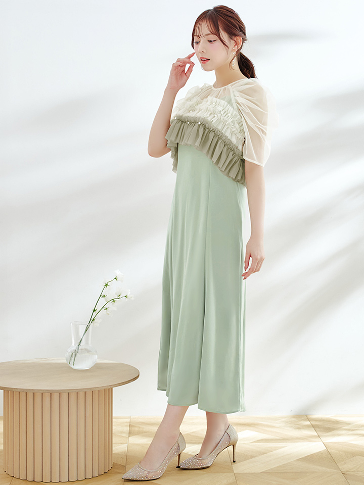 パール付きグラデーションフリルが上品かつ、存在感あるミモレ丈ワンピースドレス♡