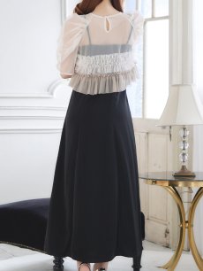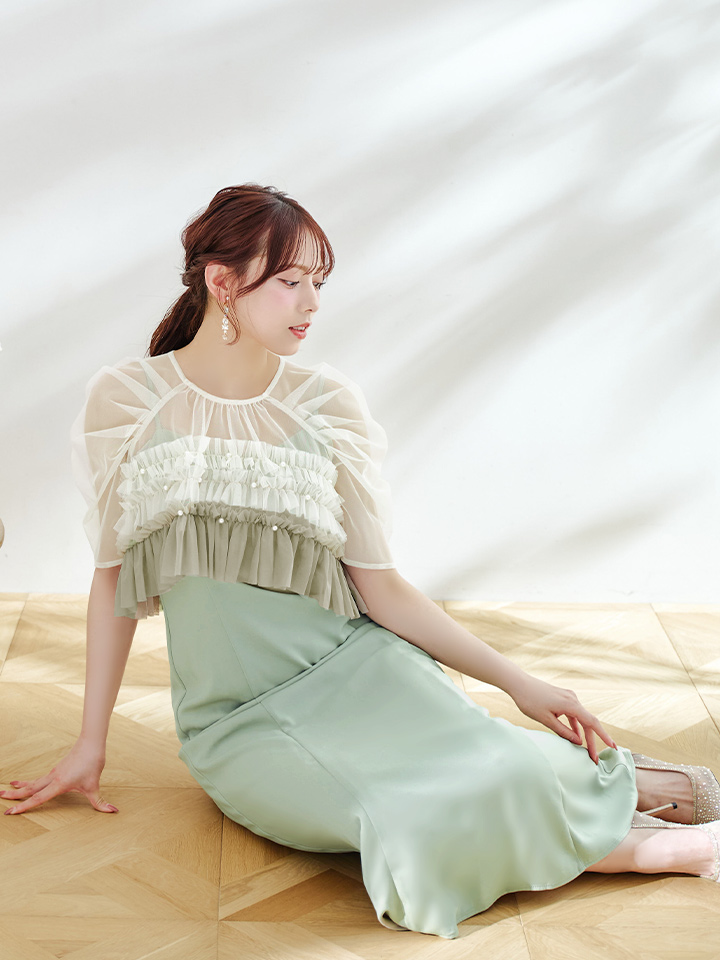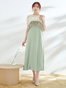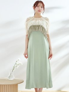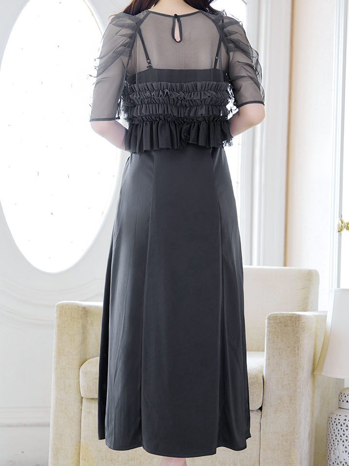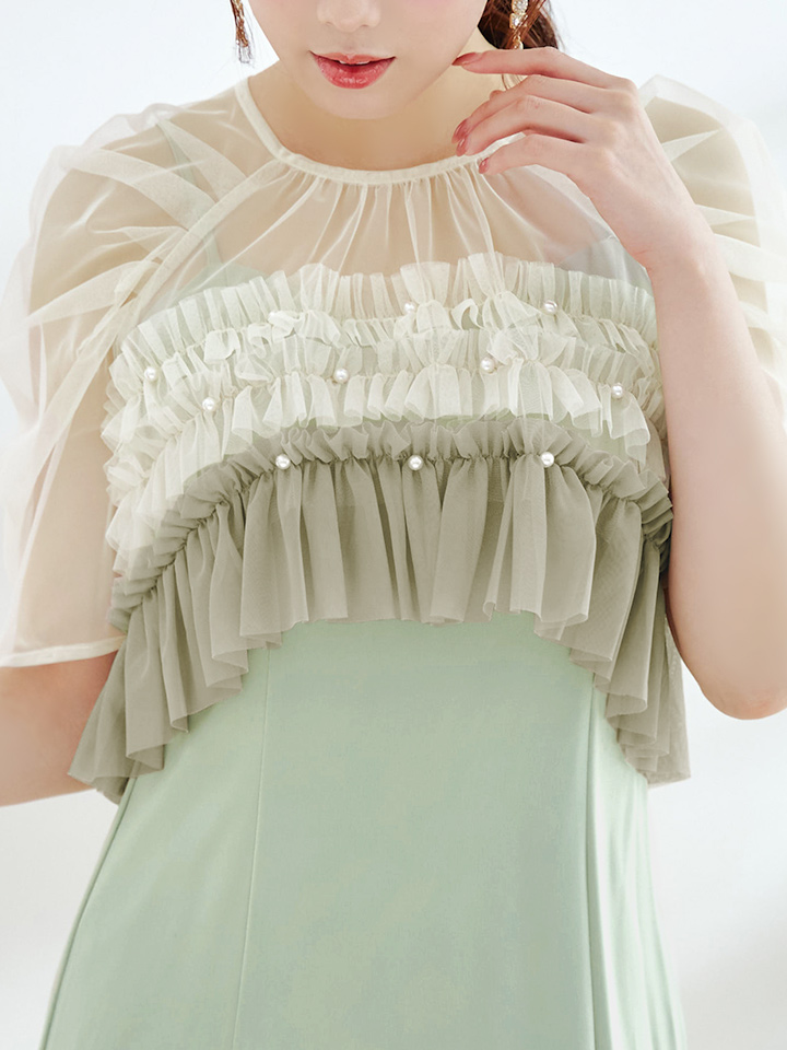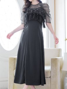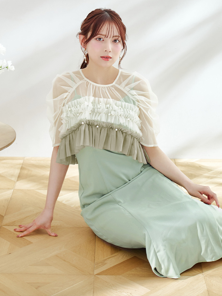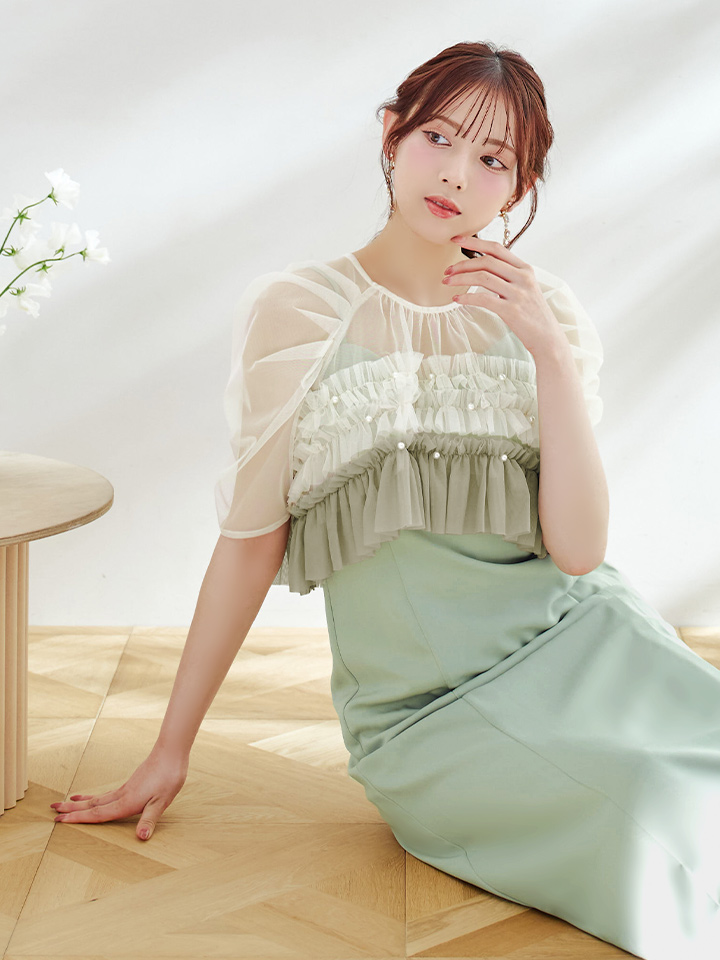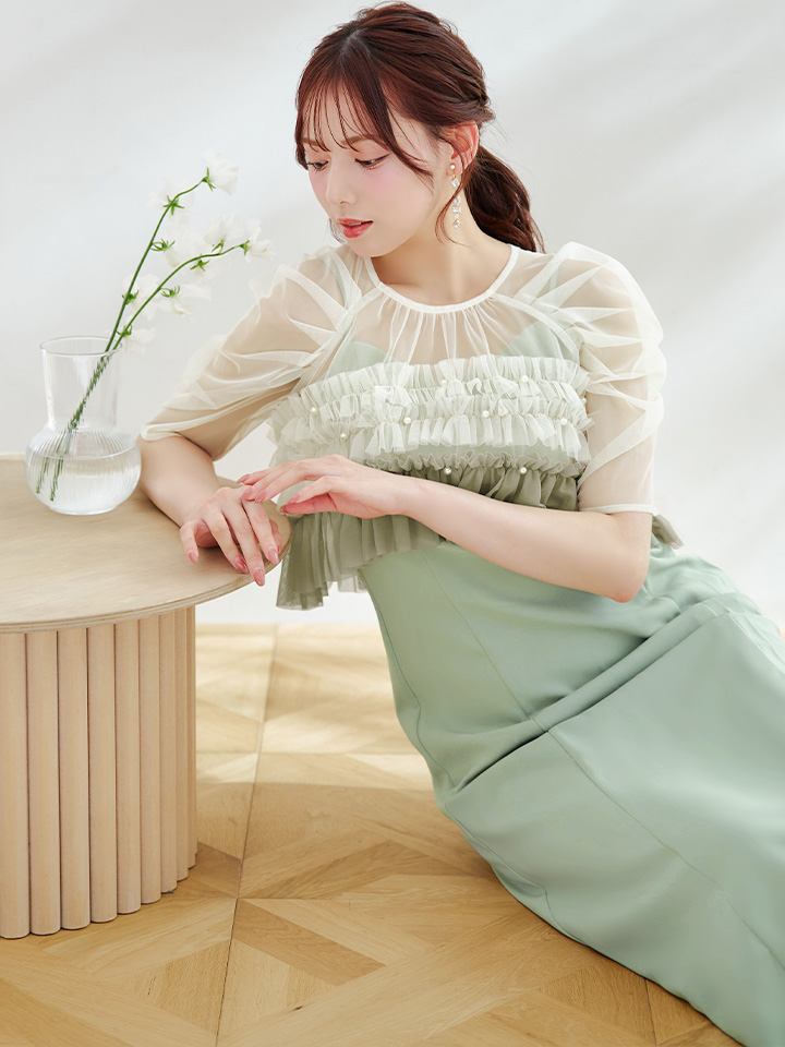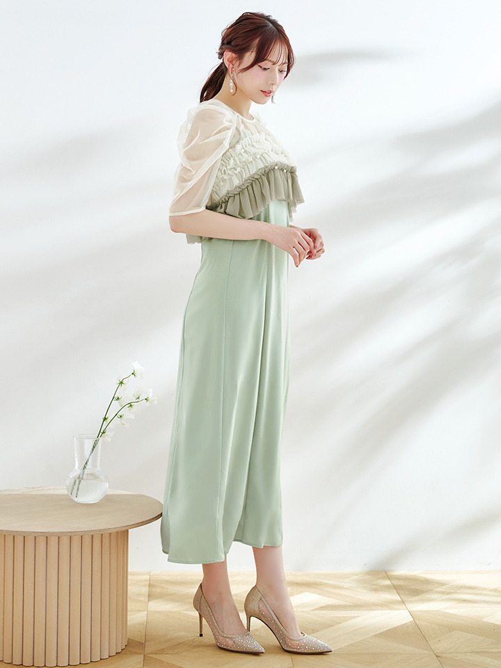 パール付きグラデーションフリルが上品かつ、存在感あるミモレ丈ワンピースドレス♡