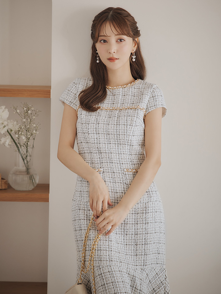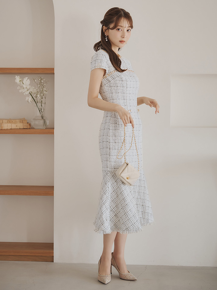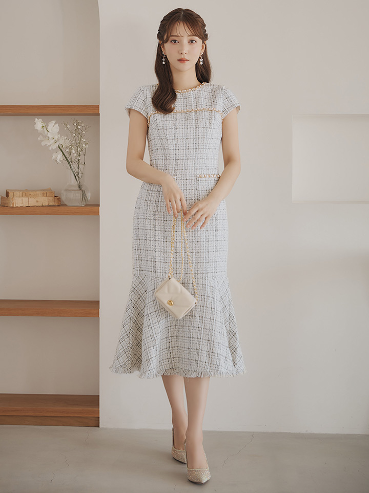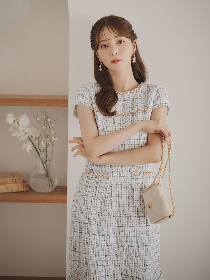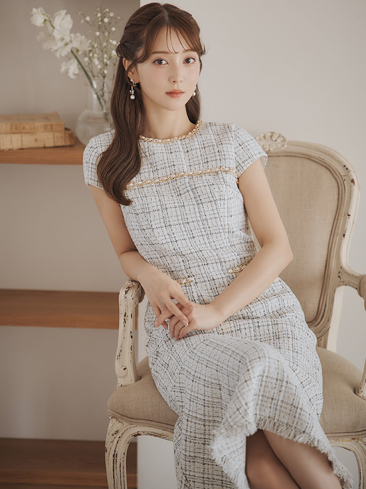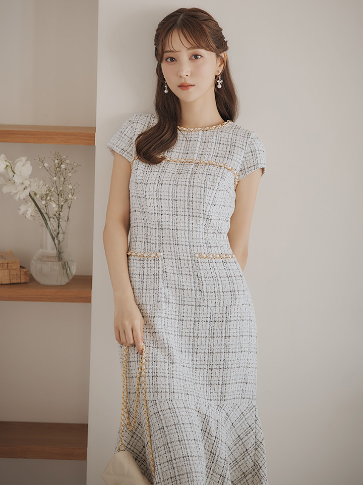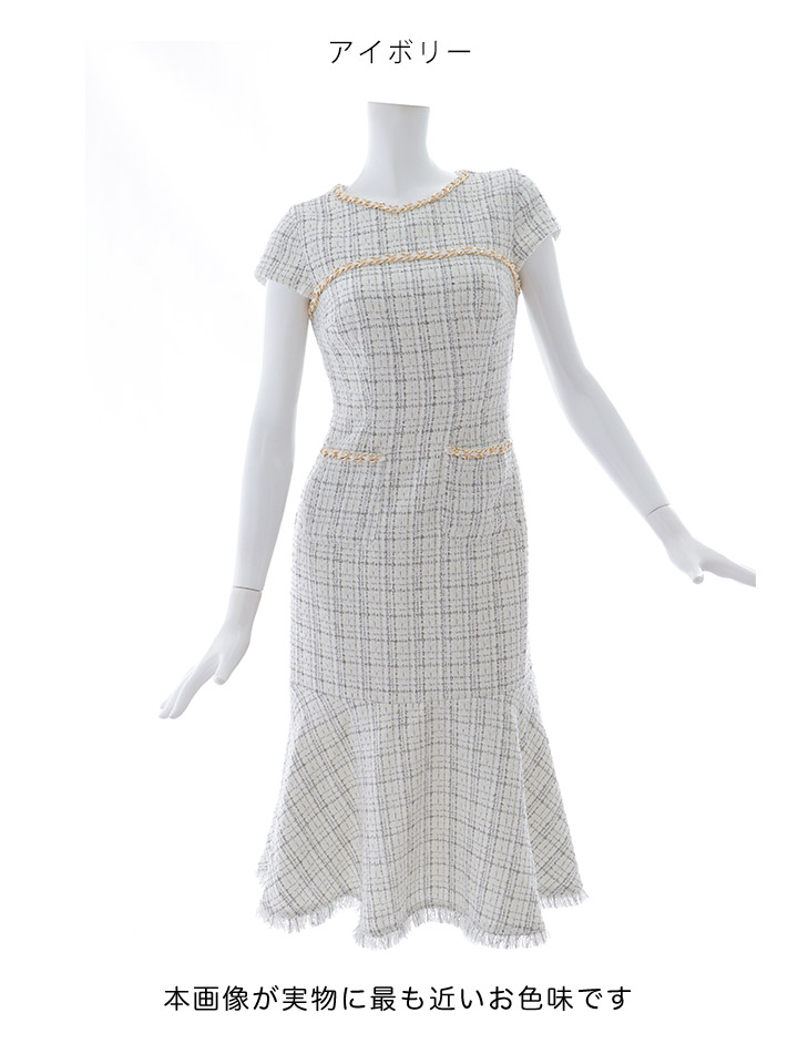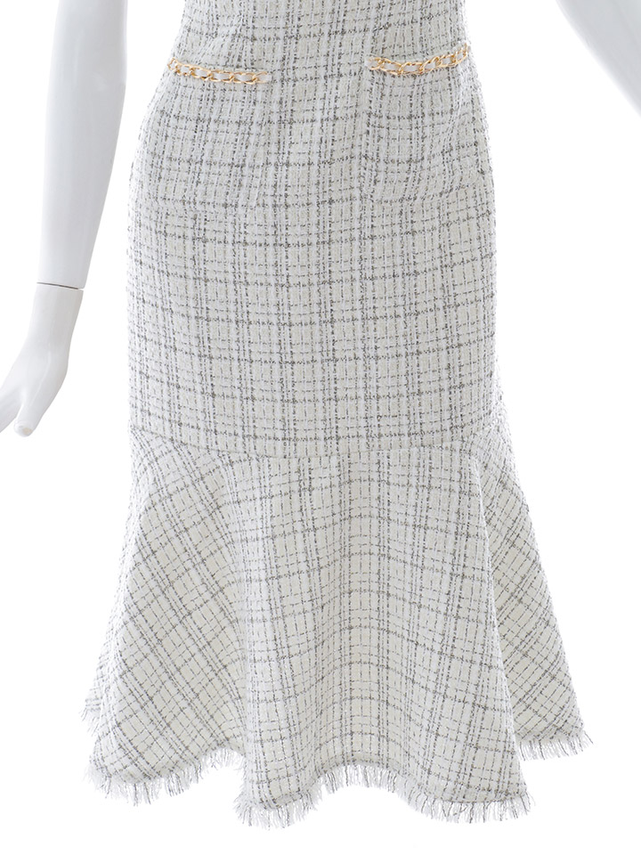 ツイードマーメイドドレス/ノースリーブ/チェーン/谷間隠し/ミディアムドレス【S-Lサイズ/1カラー】[OF03] 【YN】dzw [5195YNdzw-240828-1]