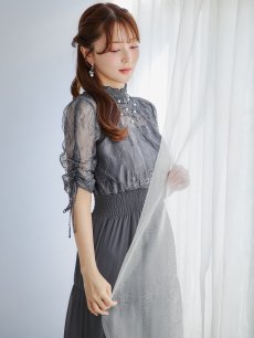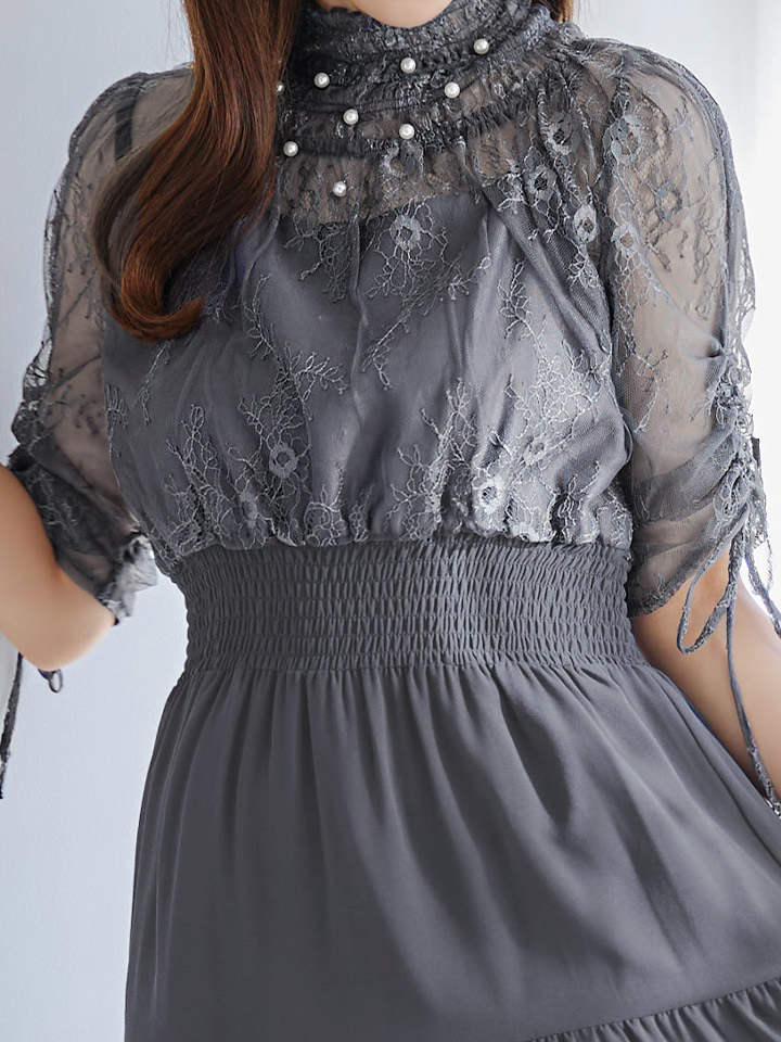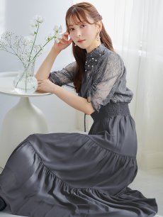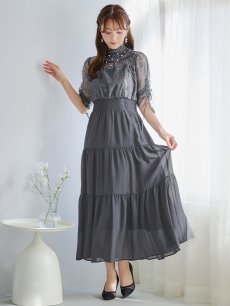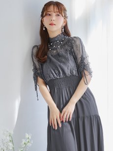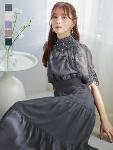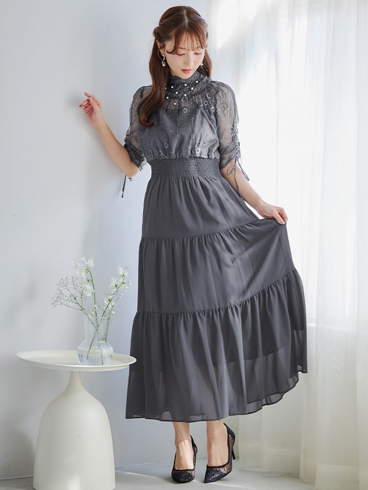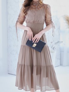 ハイネックに上品なパールがあしらわれたクラシカルなワンピースドレス♡
