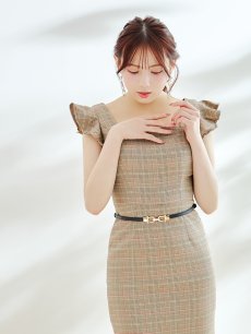 チェック柄マーメイドドレス/ショートスリーブ/フリル袖/谷間隠し/背中隠し/ベルト/ミディアムドレス/キャバドレス 【S-Lサイズ/1カラー】[OF04-X] 【SB】dzk [8105SBdzk-230809-1]