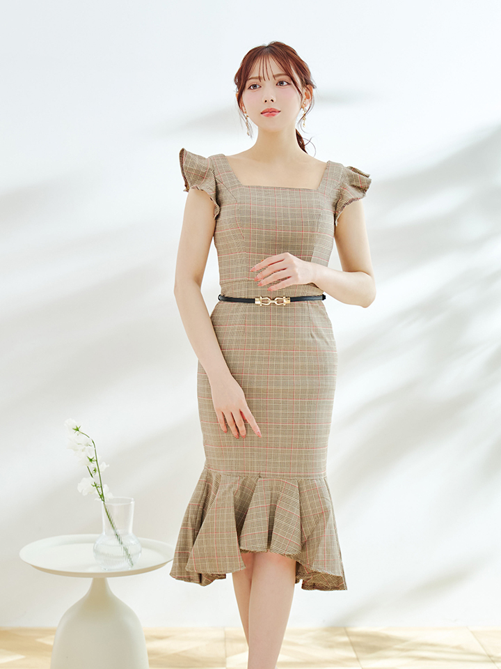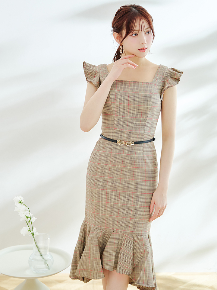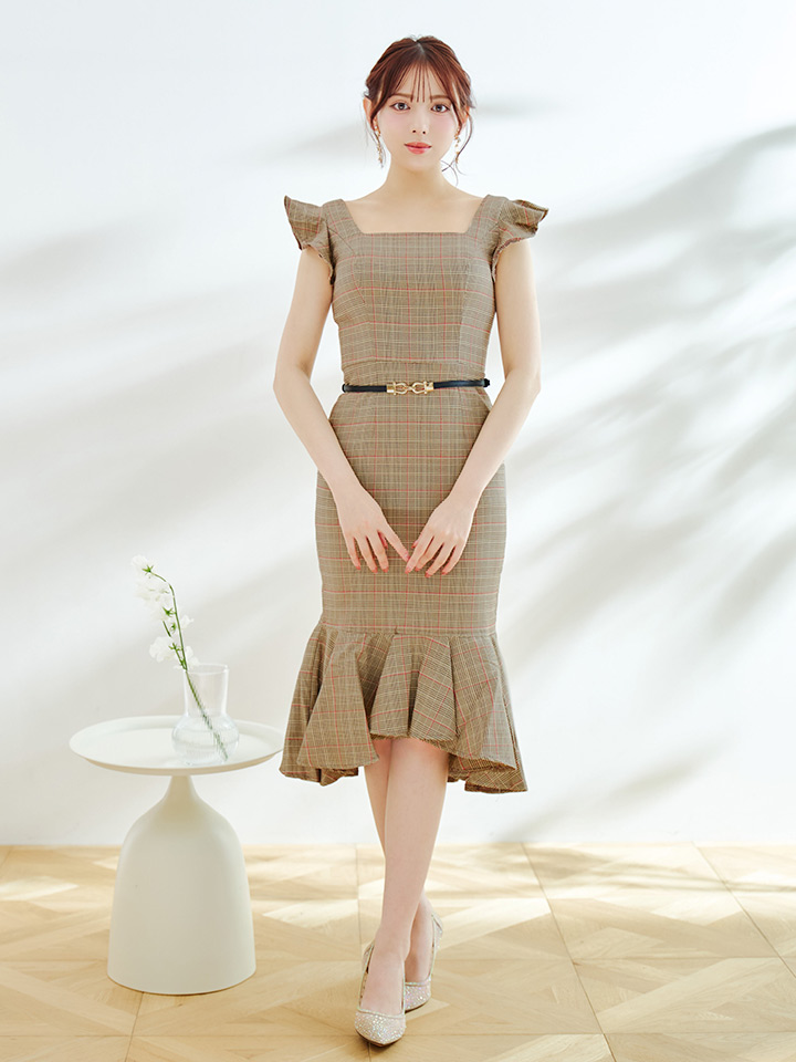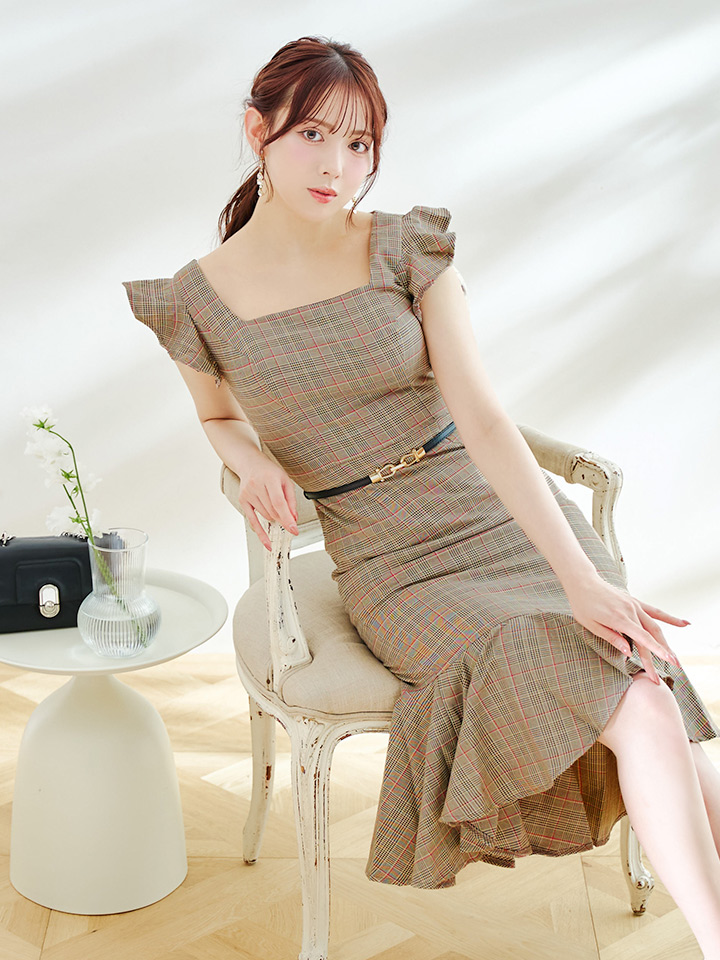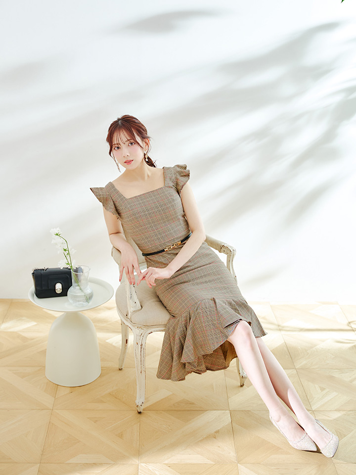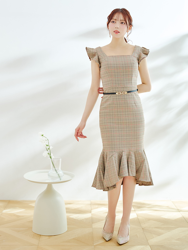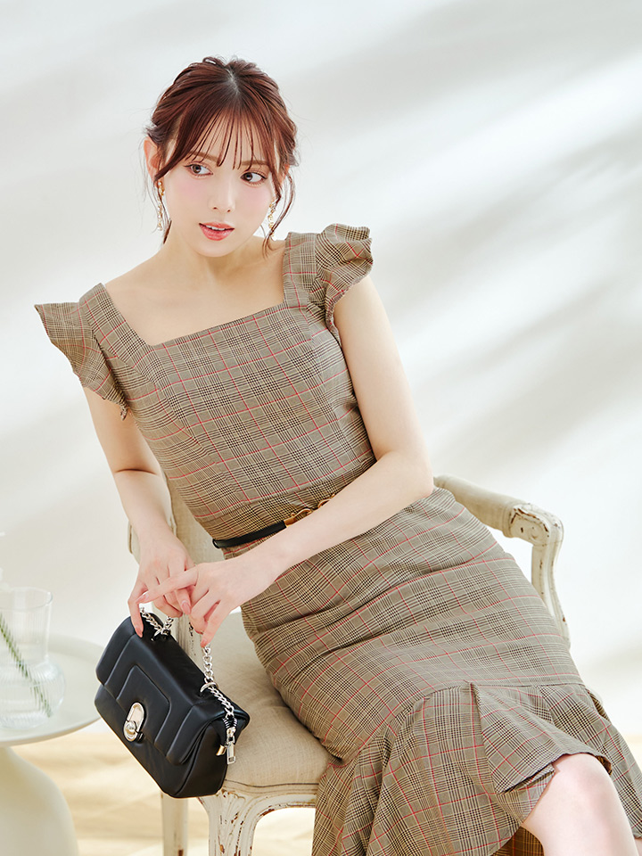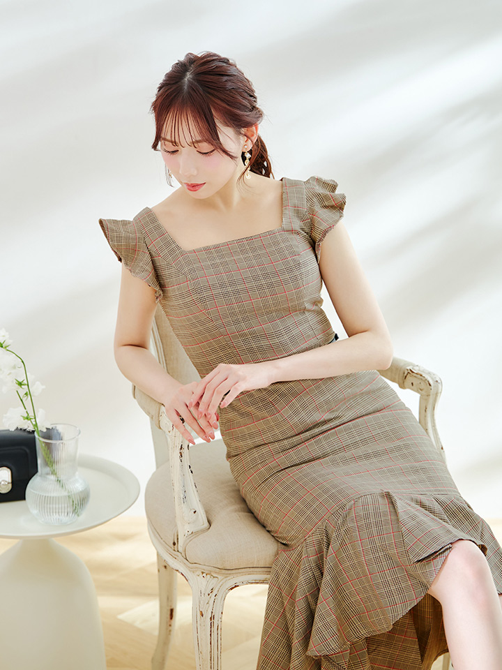 フリル袖×チェック柄がクラシカルなマーメイドミディアムドレスマーメイドシルエットが歩く度にひらひらと揺れ動く上品な1着