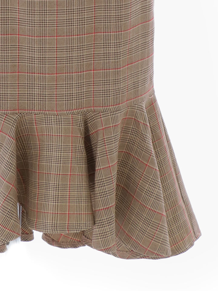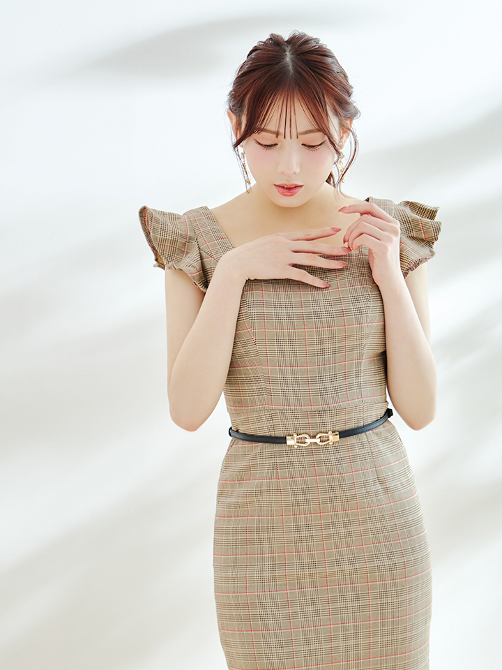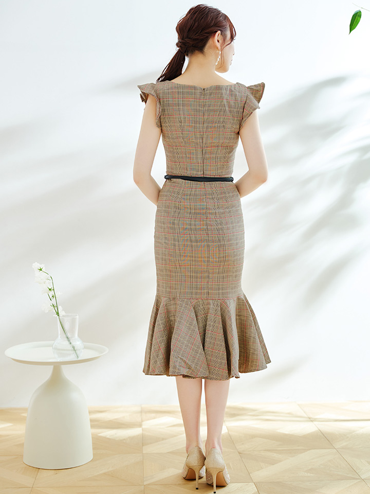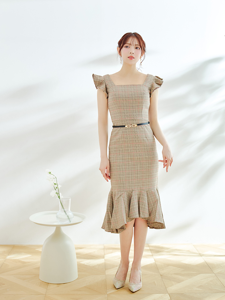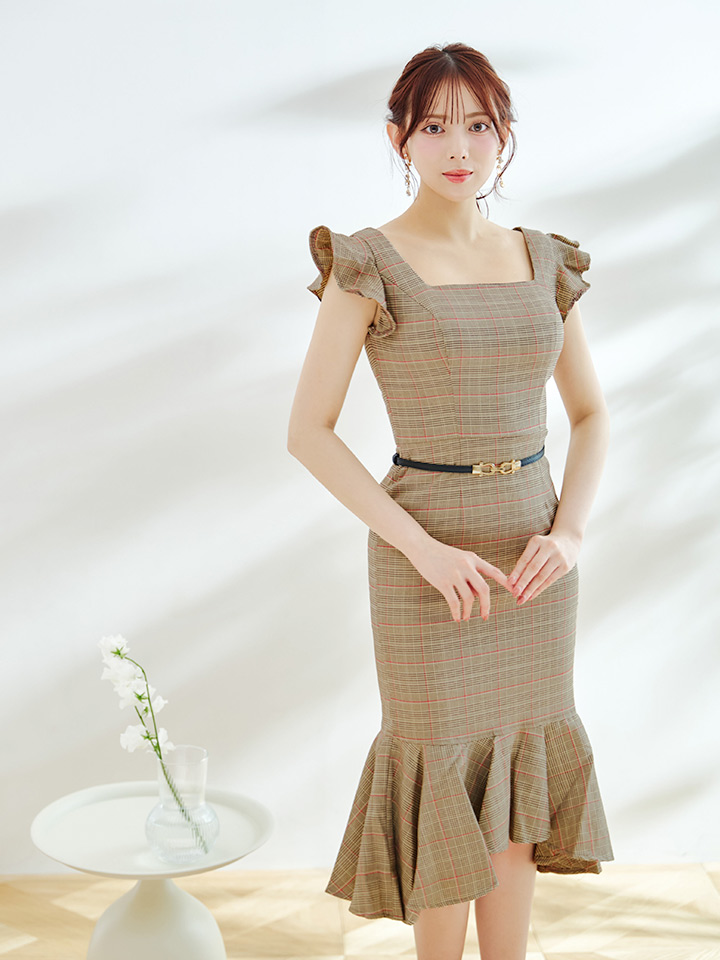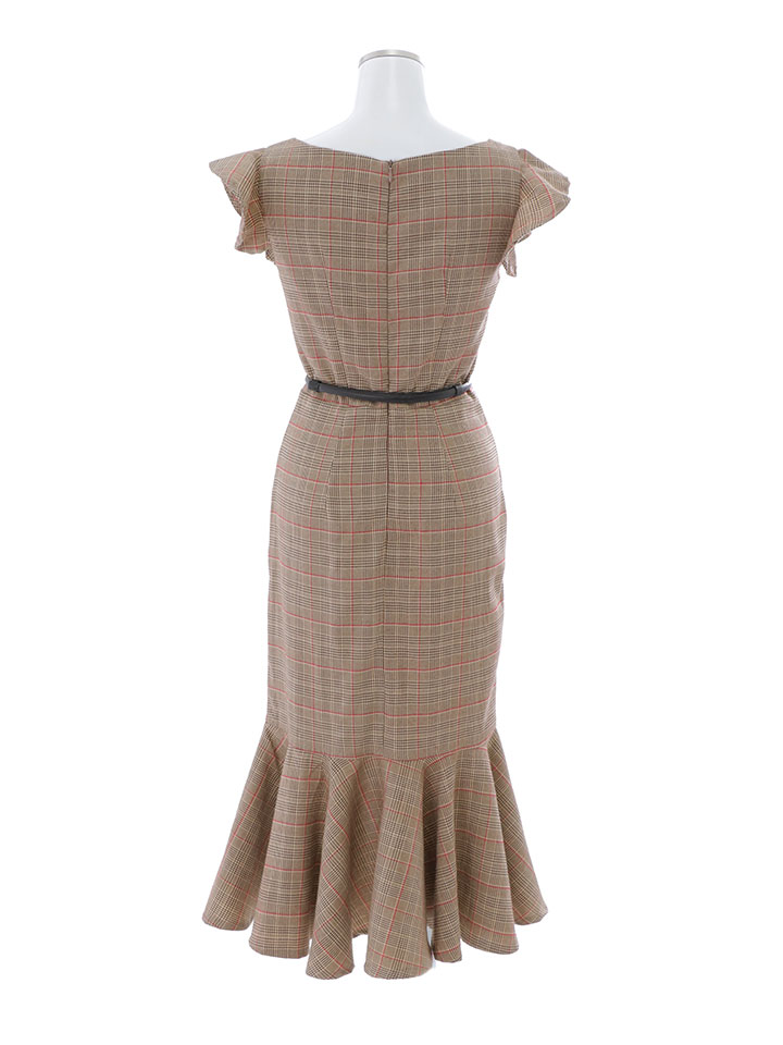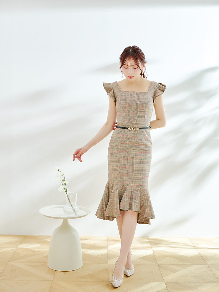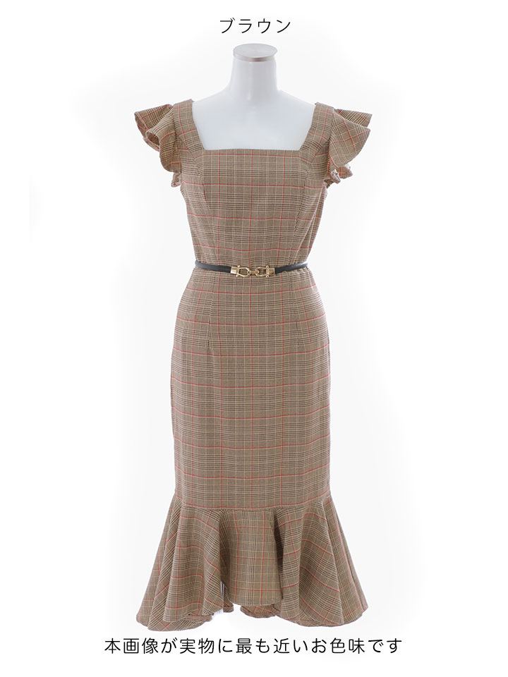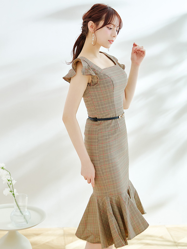 フリル袖×チェック柄がクラシカルなマーメイドミディアムドレスマーメイドシルエットが歩く度にひらひらと揺れ動く上品な1着