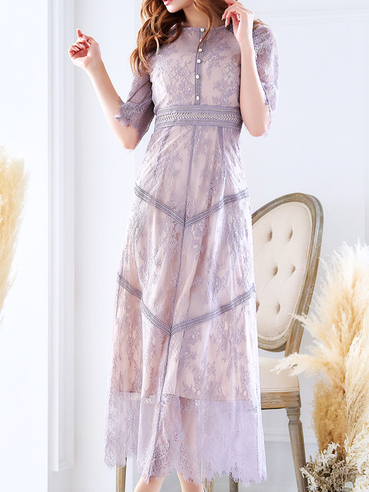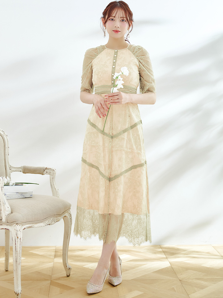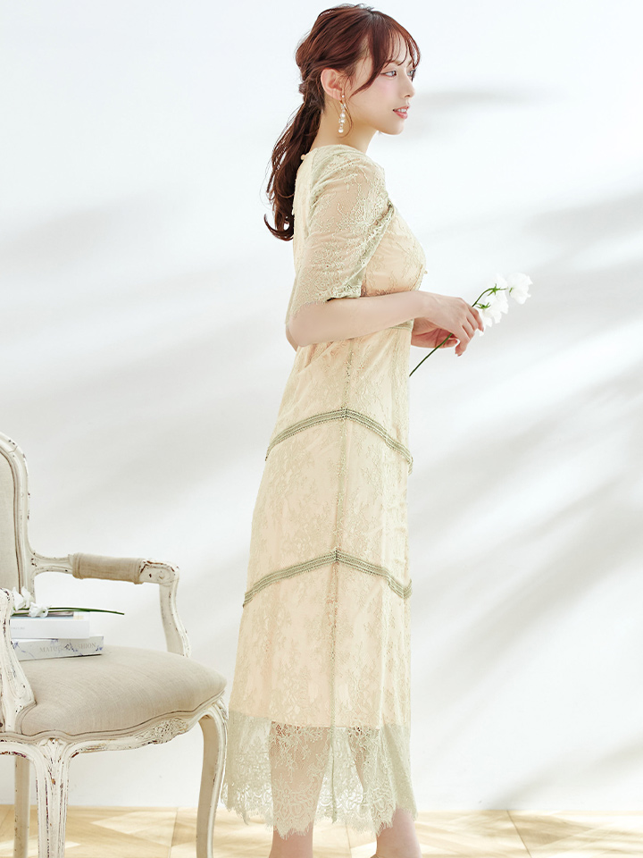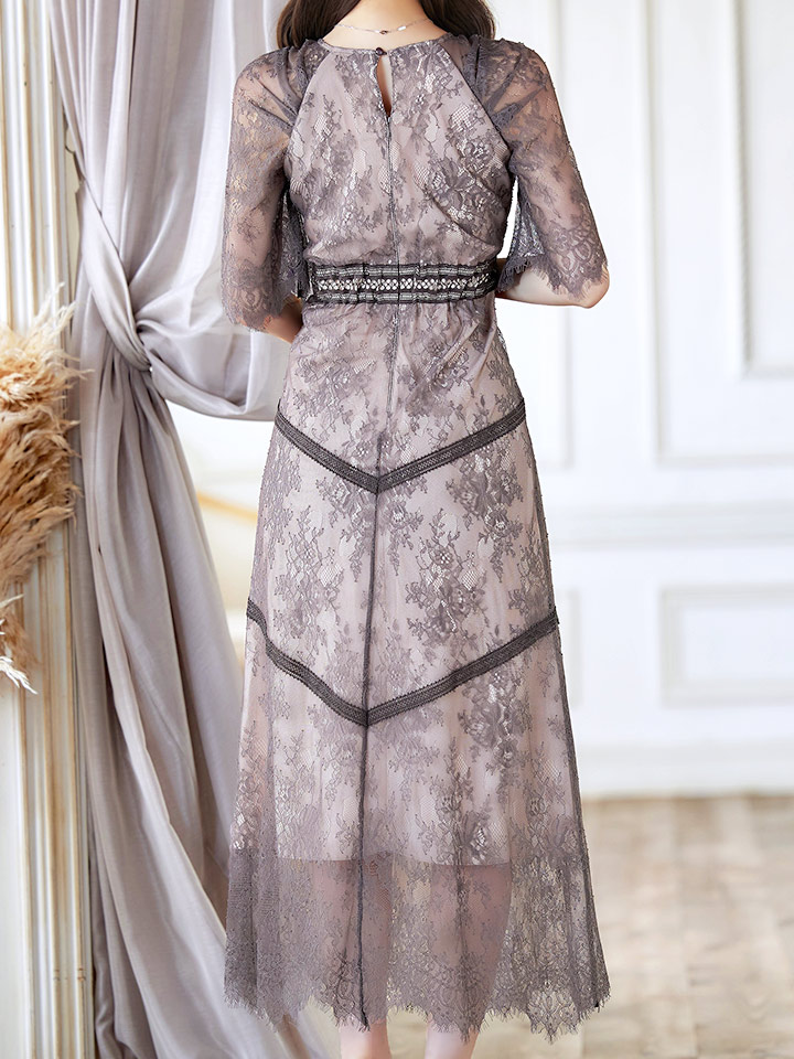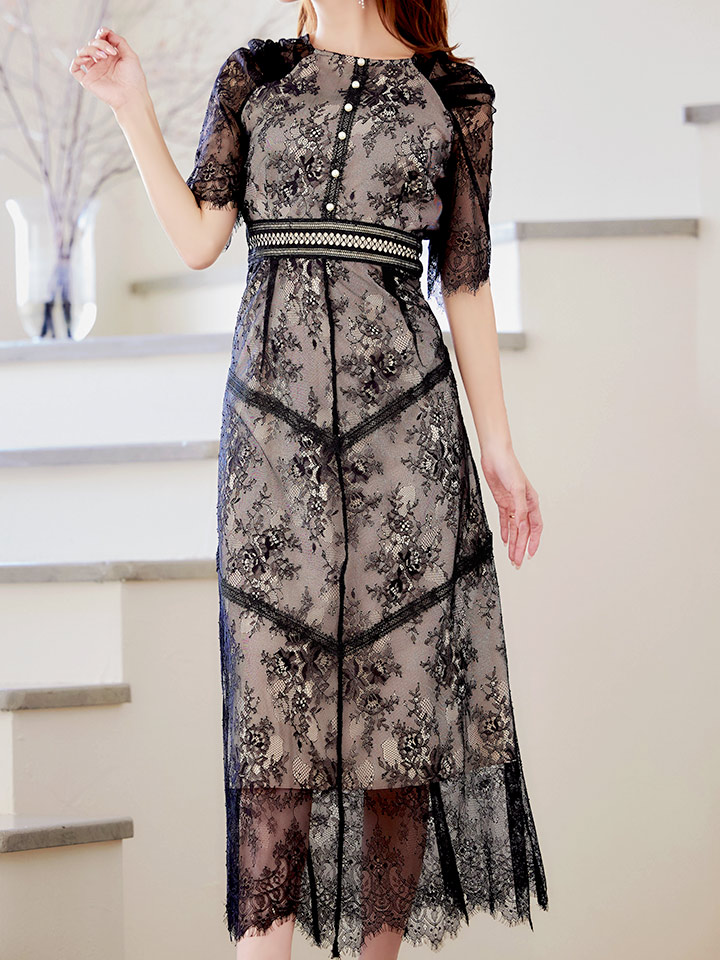 さりげない透け感が上品な総レースワンピースドレス