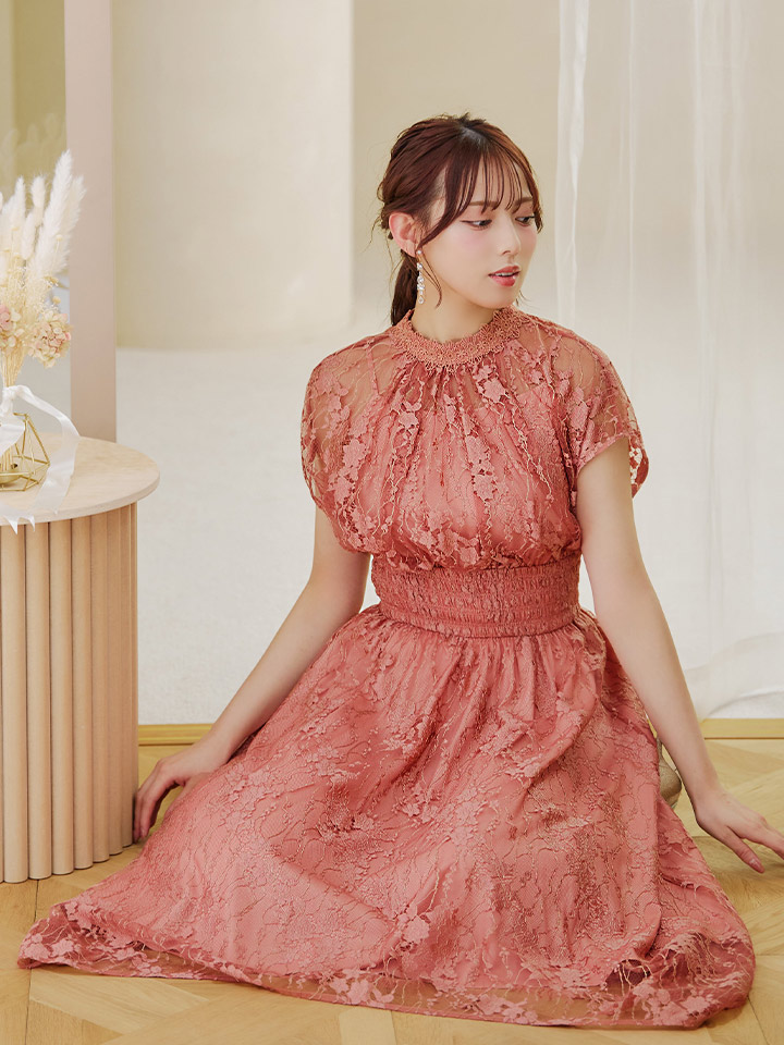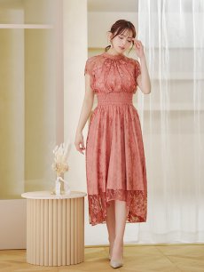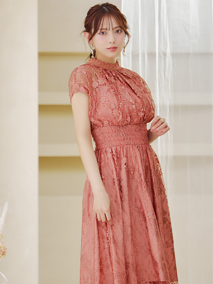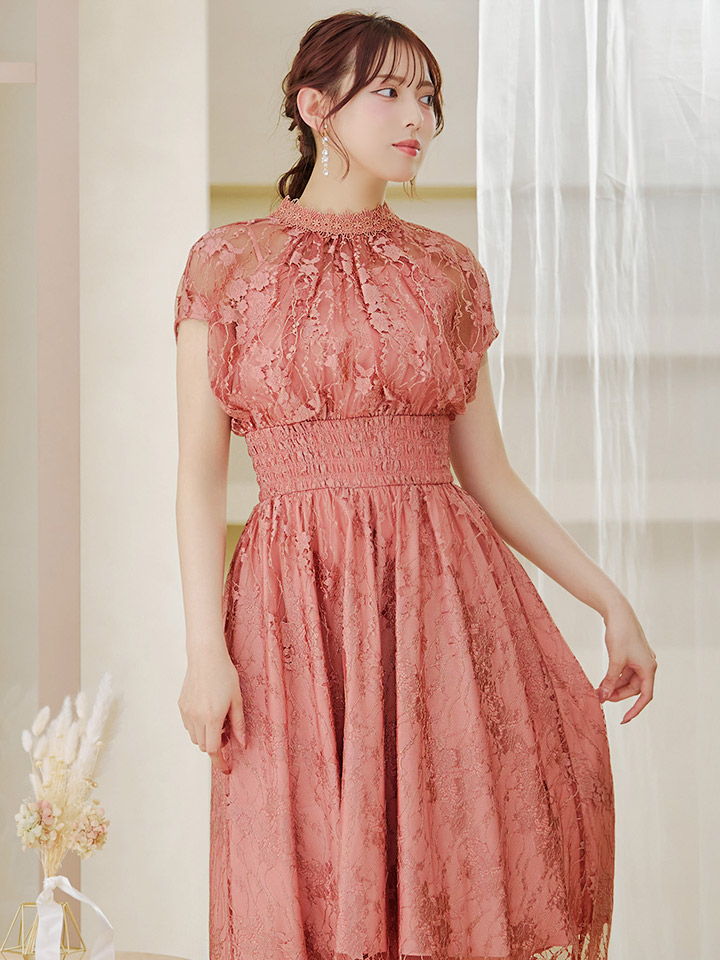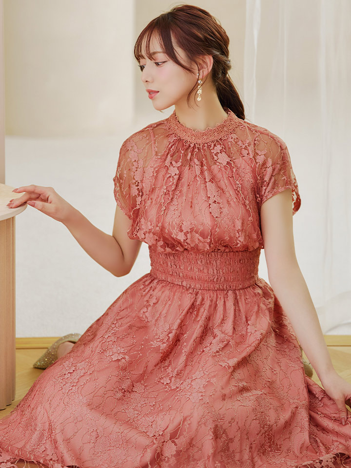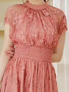 オケージョンドレス/ パーティードレス/ お呼ばれドレス/ 半袖/ 袖あり/ 総レース/ ハイネック/ タック/ ミディアム丈/ 膝丈/ ワンピース/ [OF05]