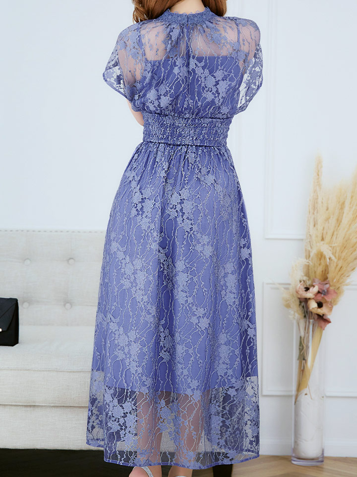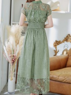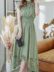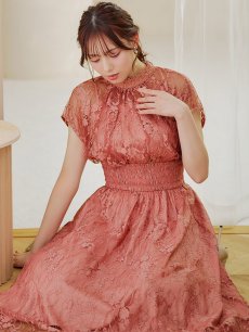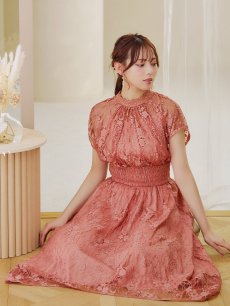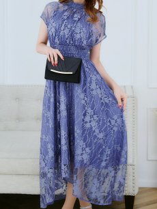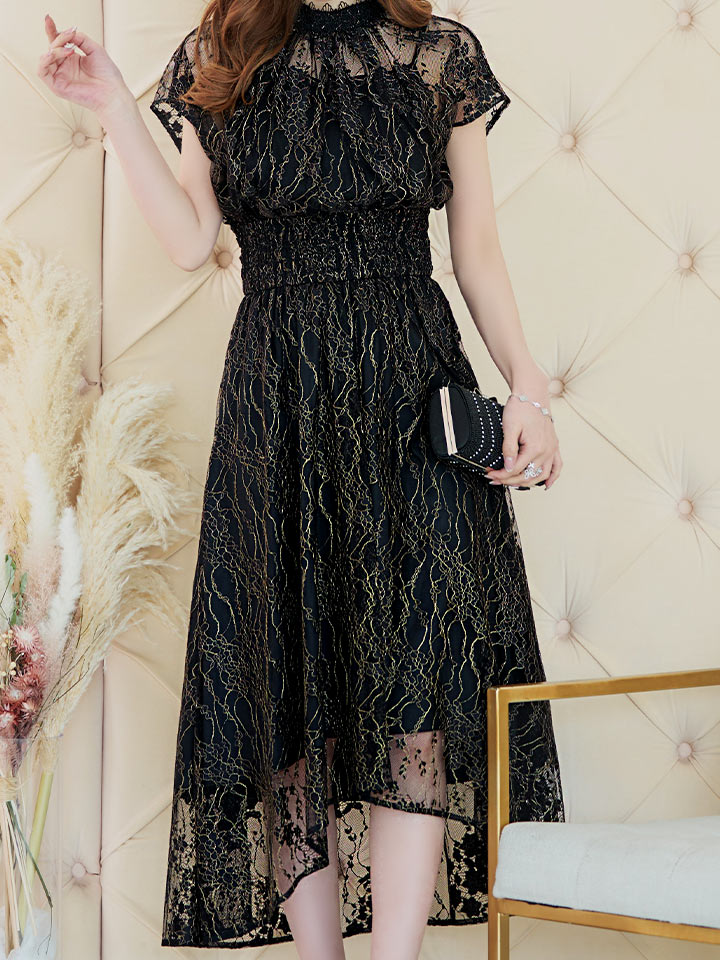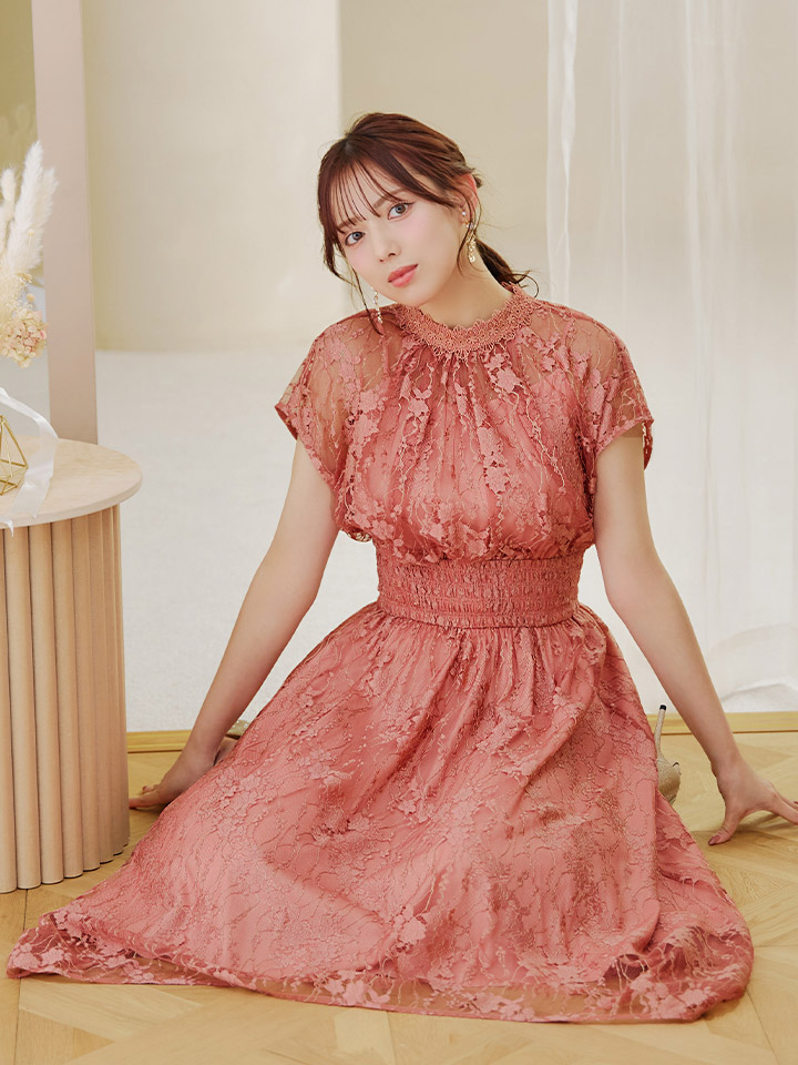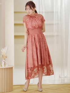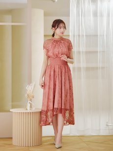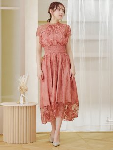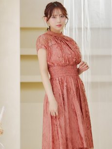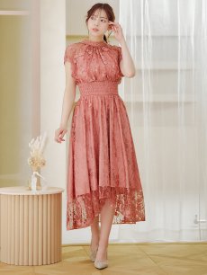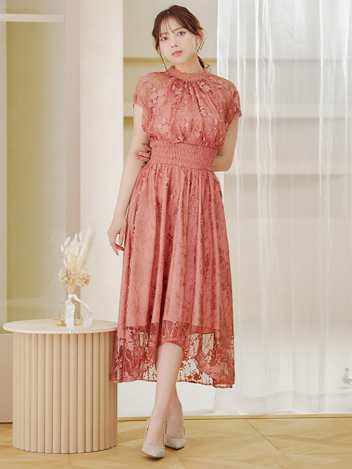 オケージョンドレス/ パーティードレス/ お呼ばれドレス/ 半袖/ 袖あり/ 総レース/ ハイネック/ タック/ ミディアム丈/ 膝丈/ ワンピース/ [OF05]