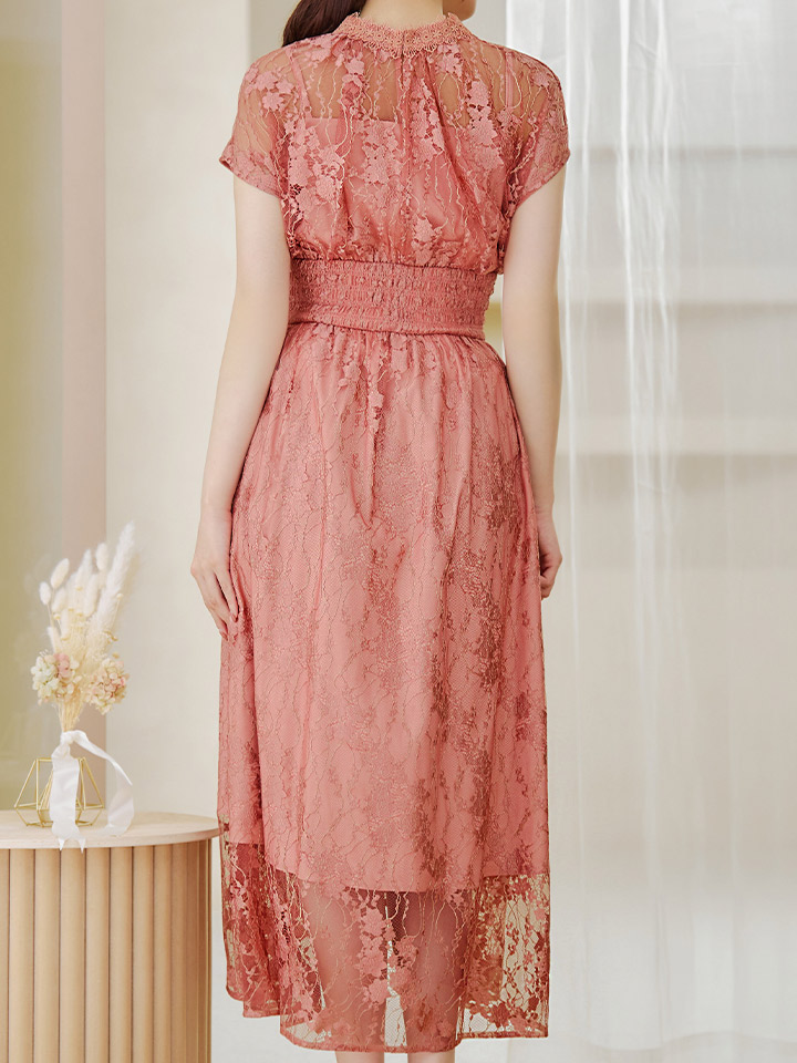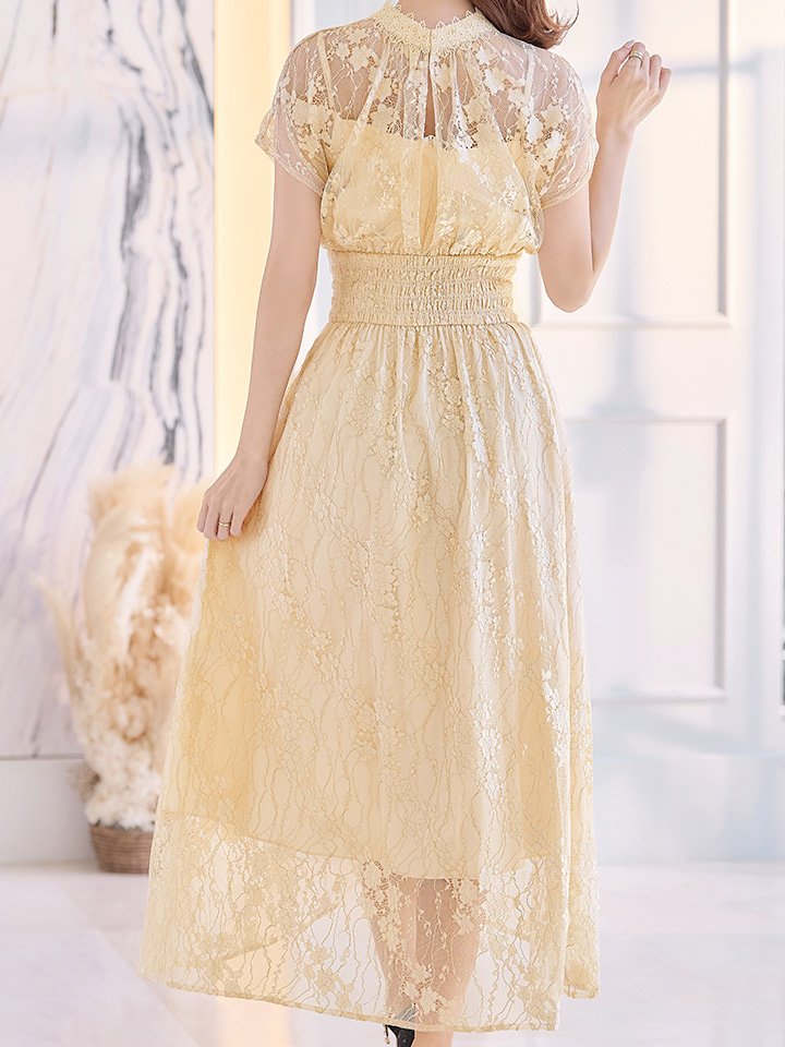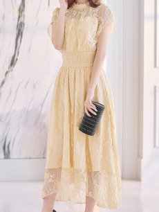 オケージョンドレス/ パーティードレス/ お呼ばれドレス/ 半袖/ 袖あり/ 総レース/ ハイネック/ タック/ ミディアム丈/ 膝丈/ ワンピース/ [OF05] [G32983HL-Apricot-S2302]