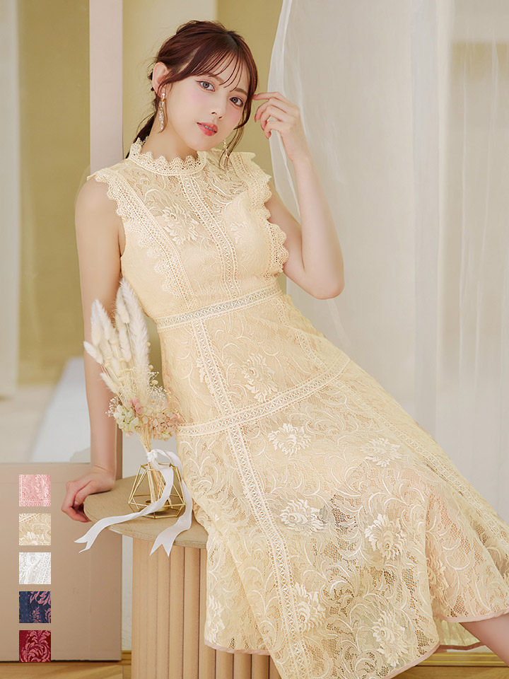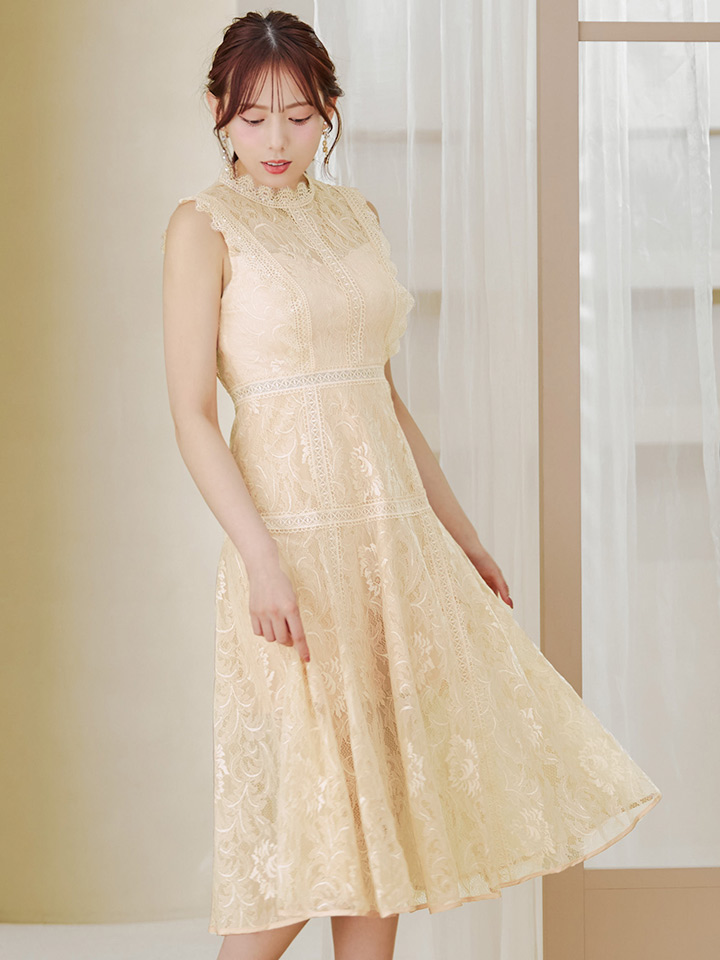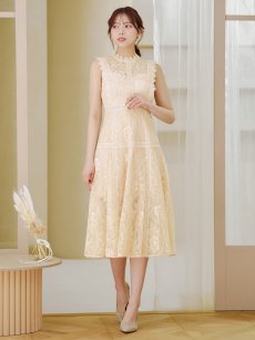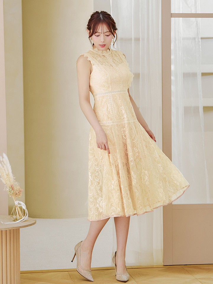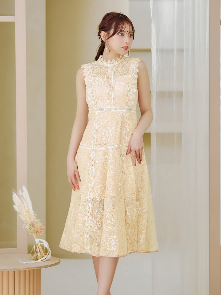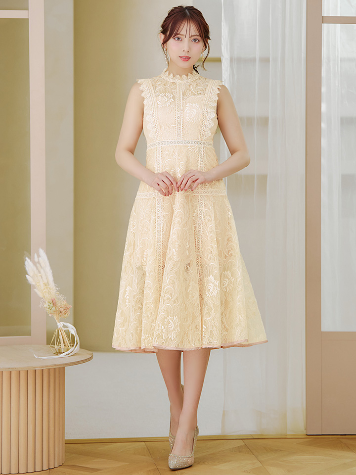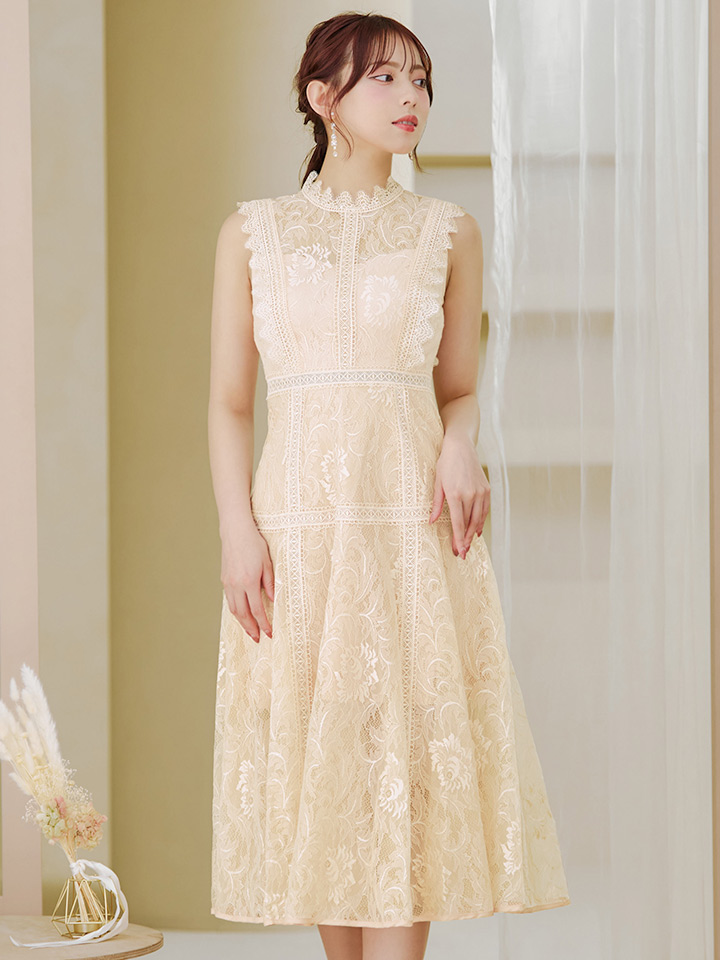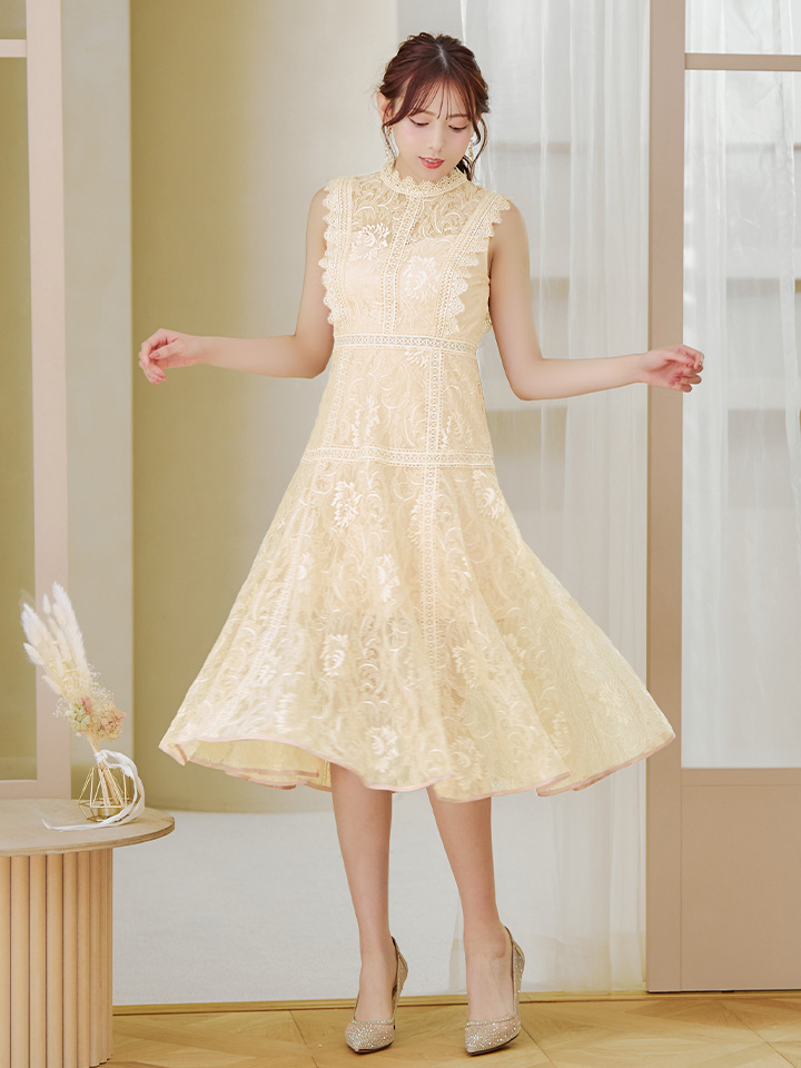 フラワーレース/ Aライン/ ミモレ丈/ ノースリーブ/ ワンピース/ ミディアムドレス/ [OF2] [LKE2603-BE-S2303]