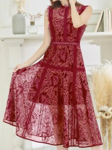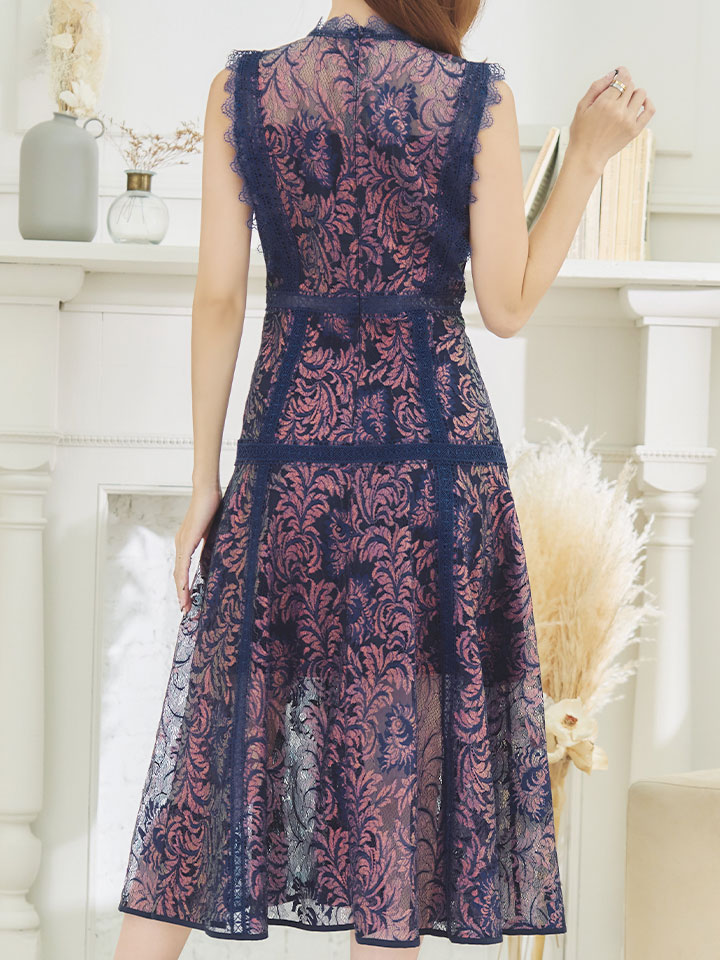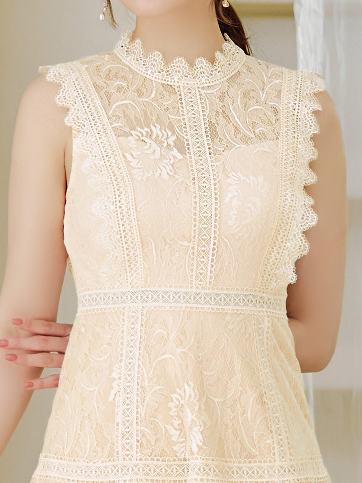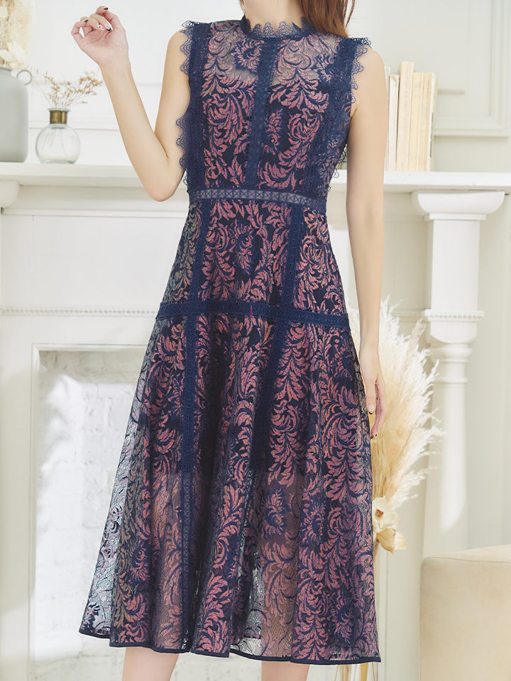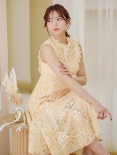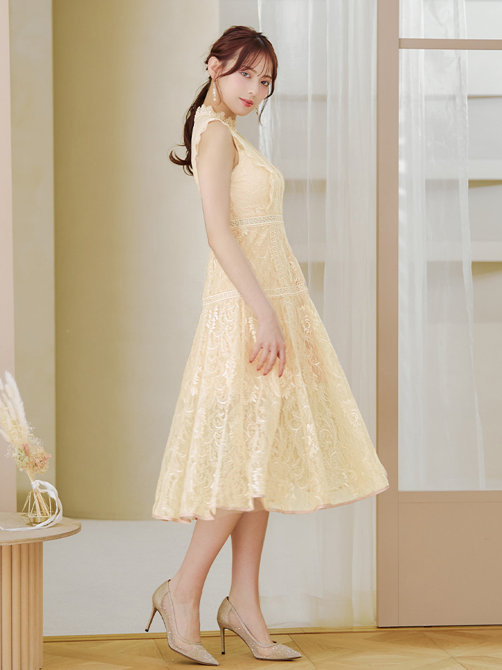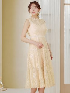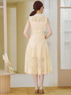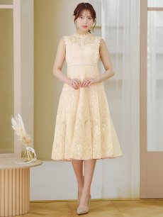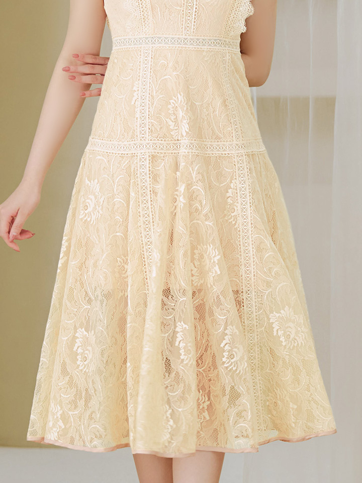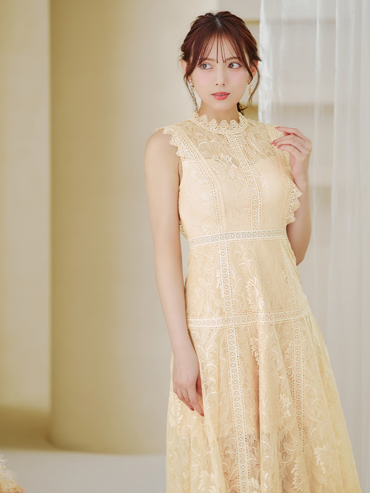 フラワーレース/ Aライン/ ミモレ丈/ ノースリーブ/ ワンピース/ ミディアムドレス/ [OF2] [LKE2603-BE-S2303]