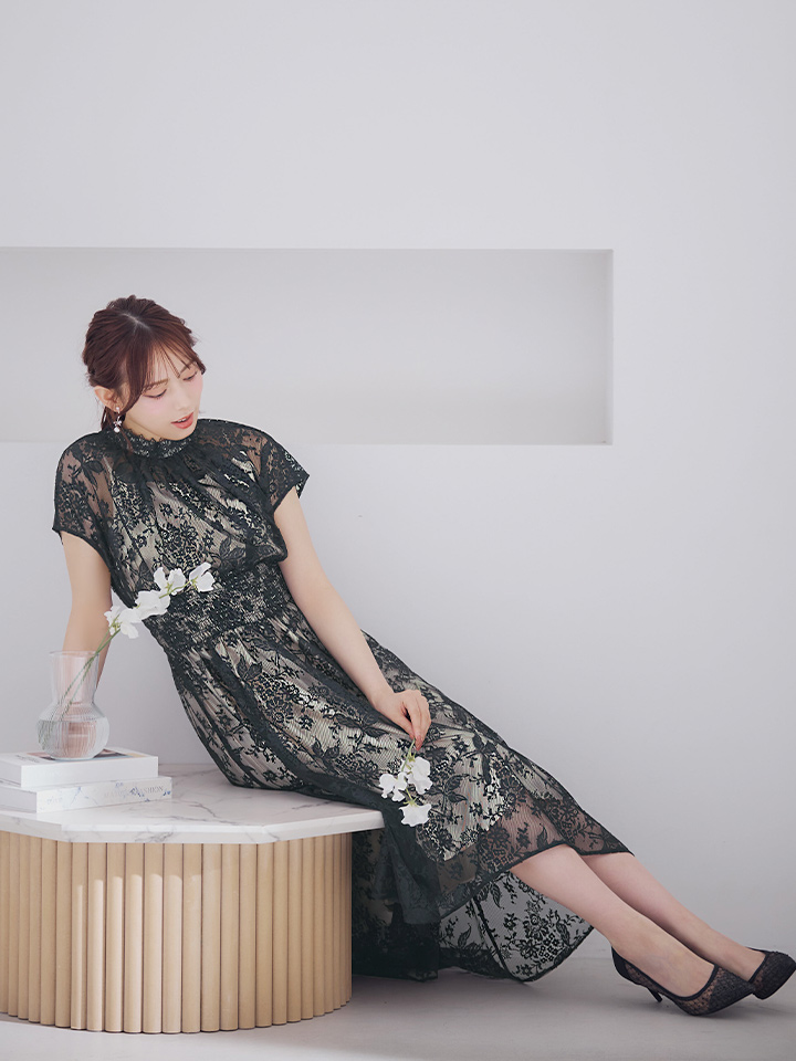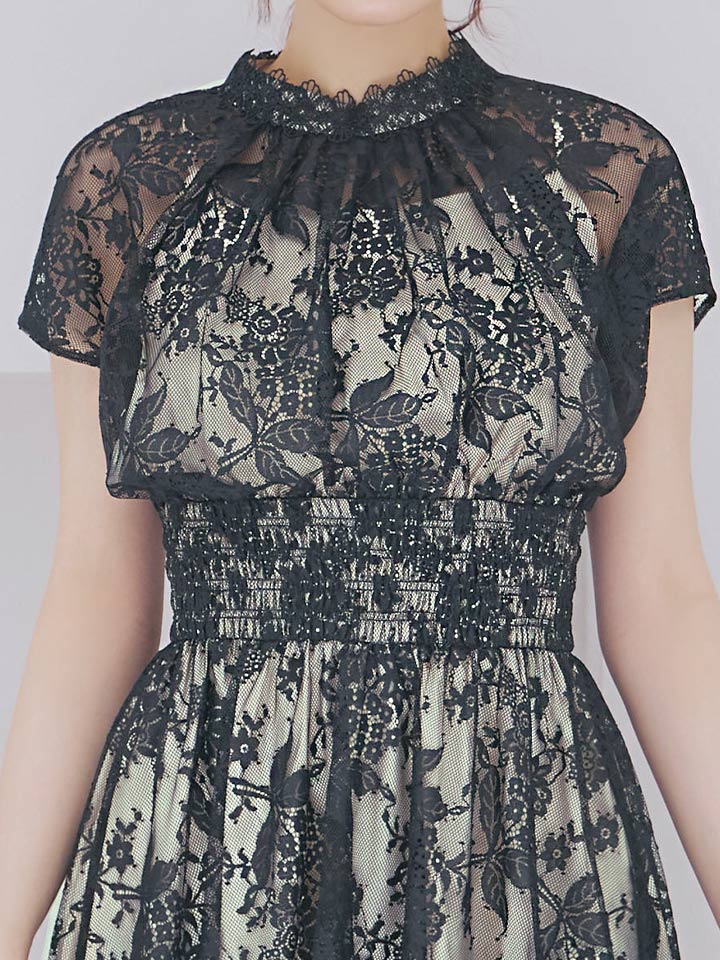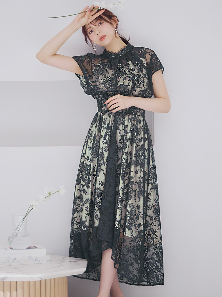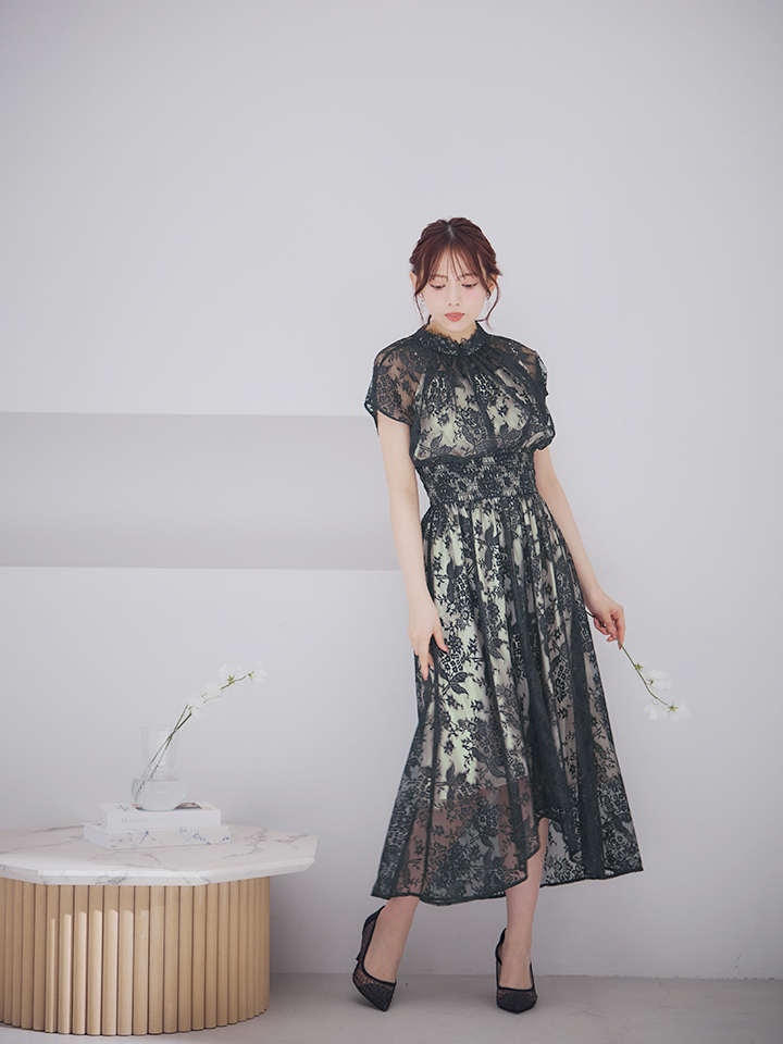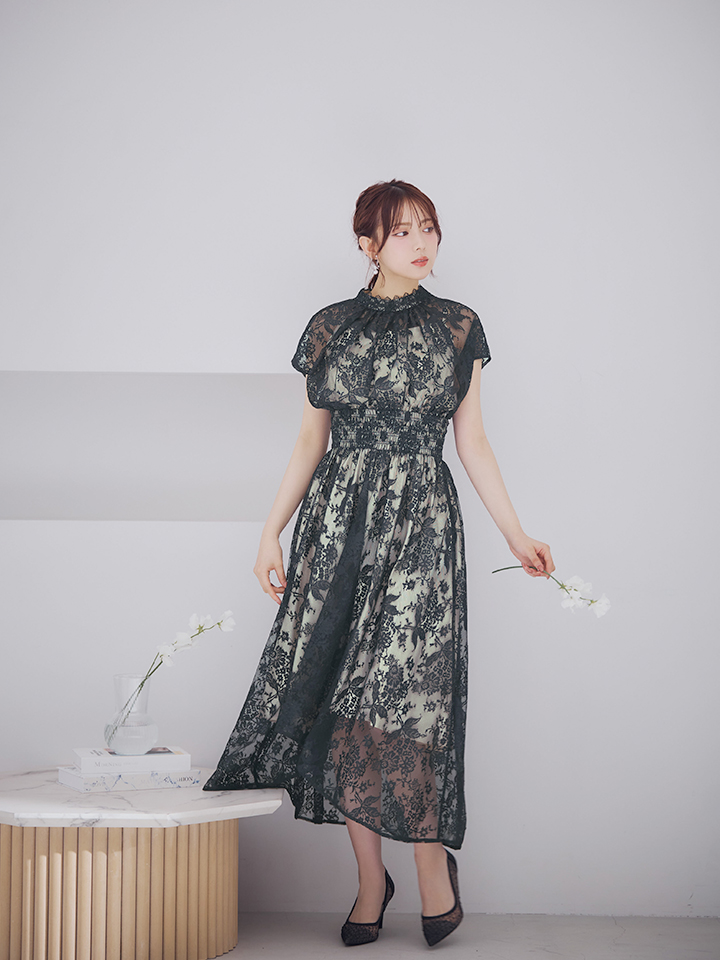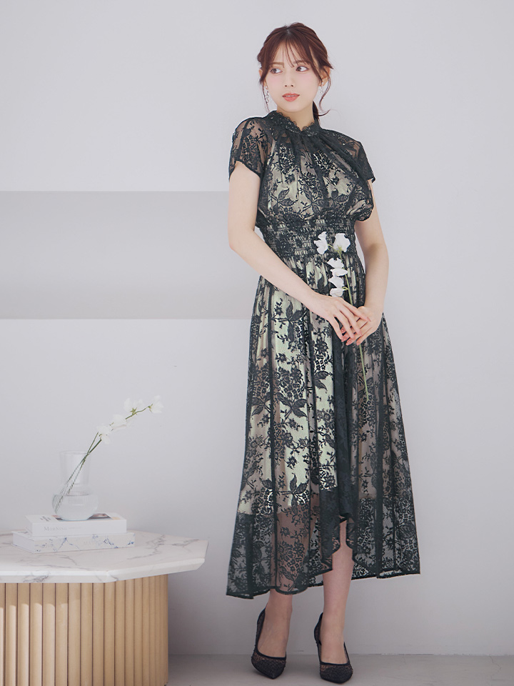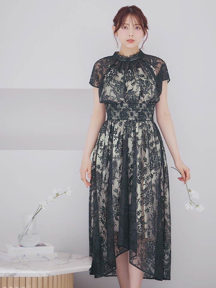 オケージョンドレス/ パーティードレス/ お呼ばれドレス/ 総レース/ タック/ ハイネック/ ミモレ丈/ テールカット/ ワンピース/ [OF05]