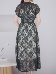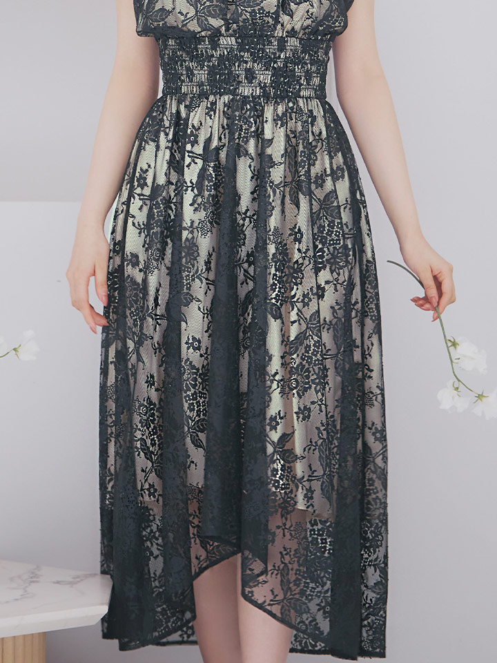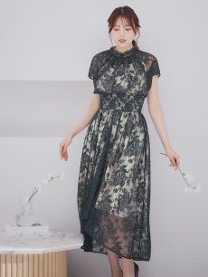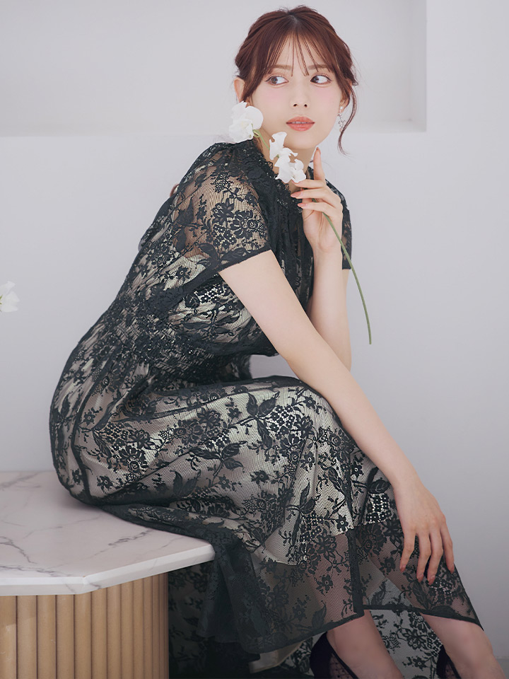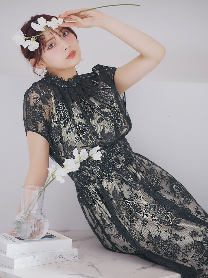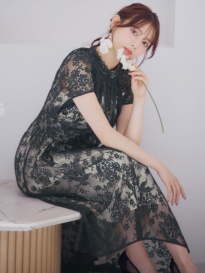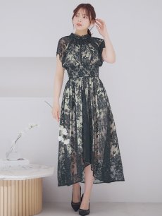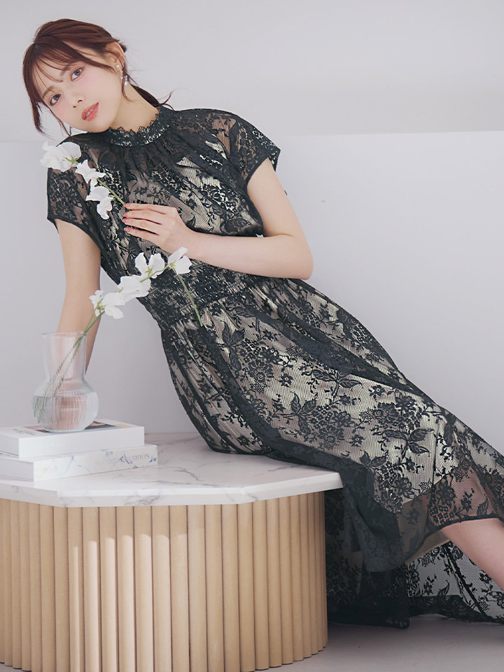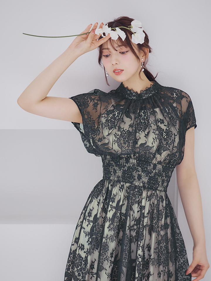 オケージョンドレス/ パーティードレス/ お呼ばれドレス/ 総レース/ タック/ ハイネック/ ミモレ丈/ テールカット/ ワンピース/ [OF05]