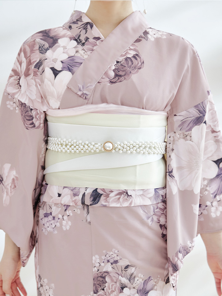 ※オプションのパール帯飾りはそのまま帯の上から結び、後ろの余った部分を帯の中にしまって着付けしております。