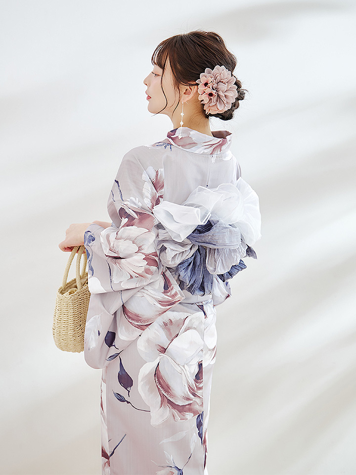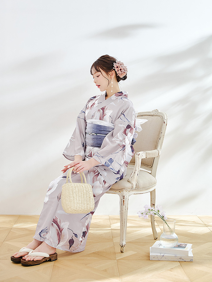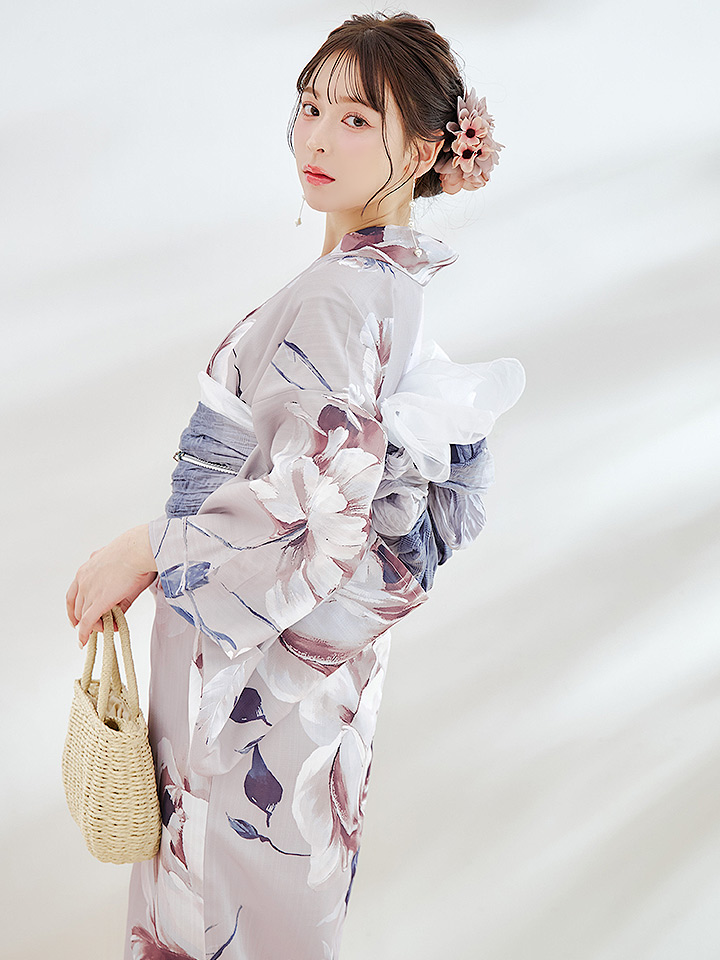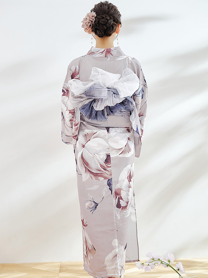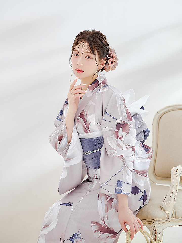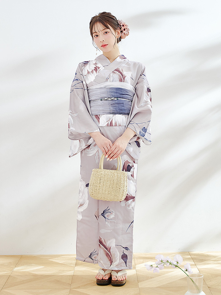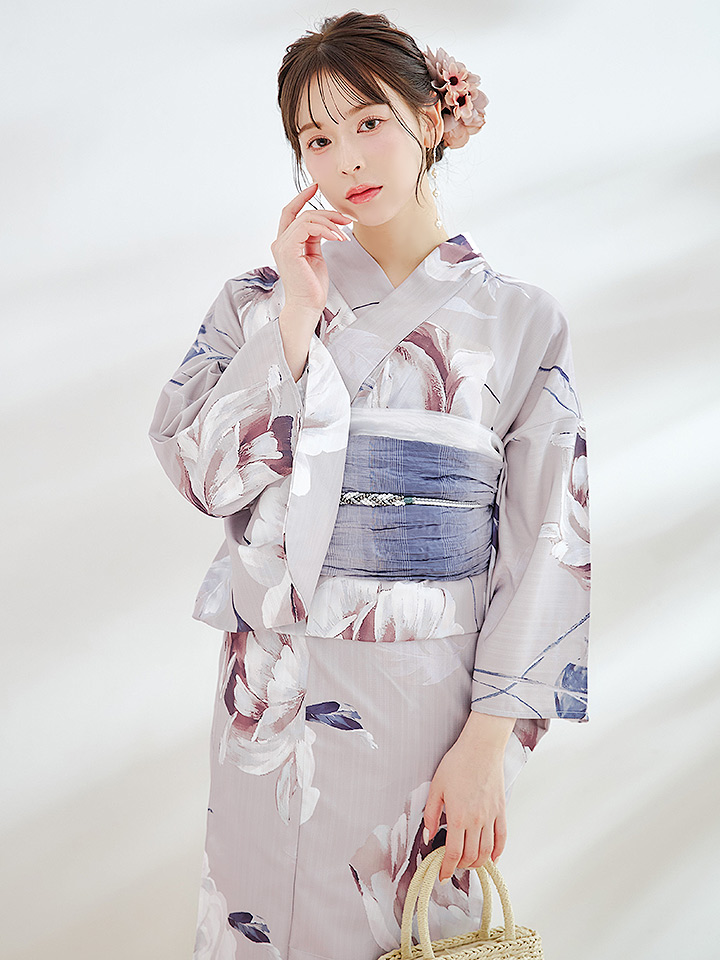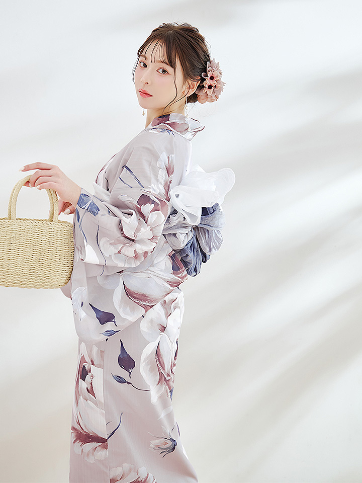 くすんだピンクベージュ地に咲くロマンティックな牡丹が可愛い大人浴衣。