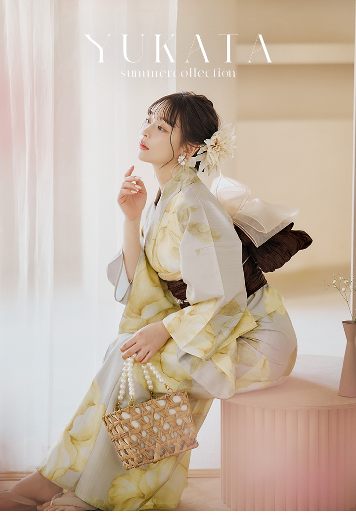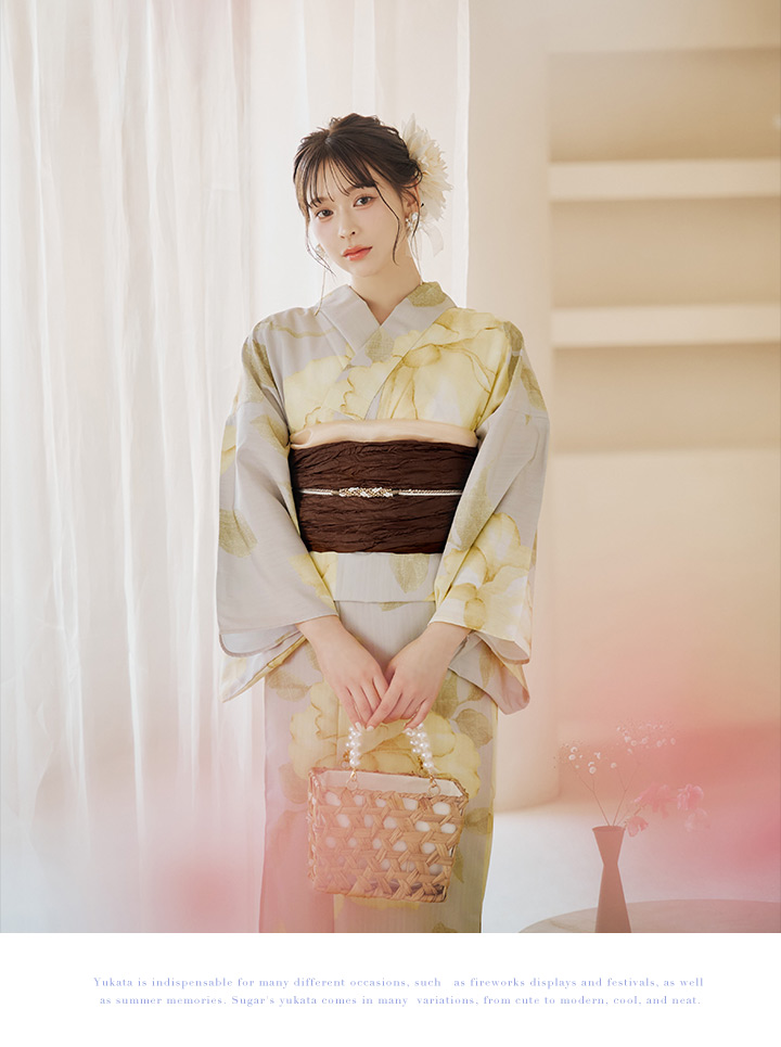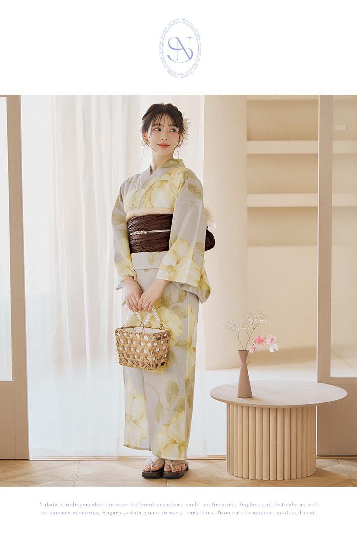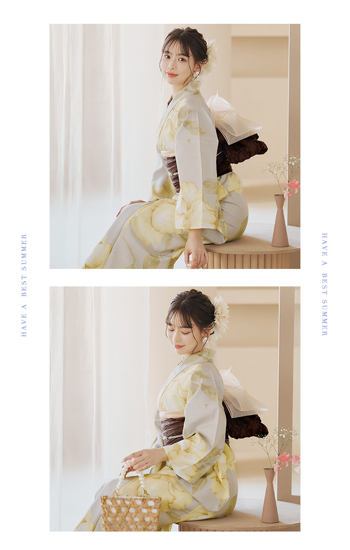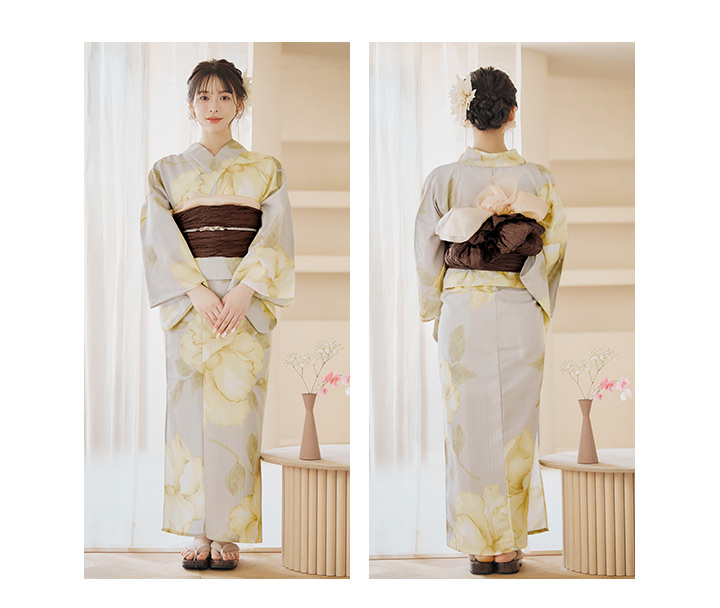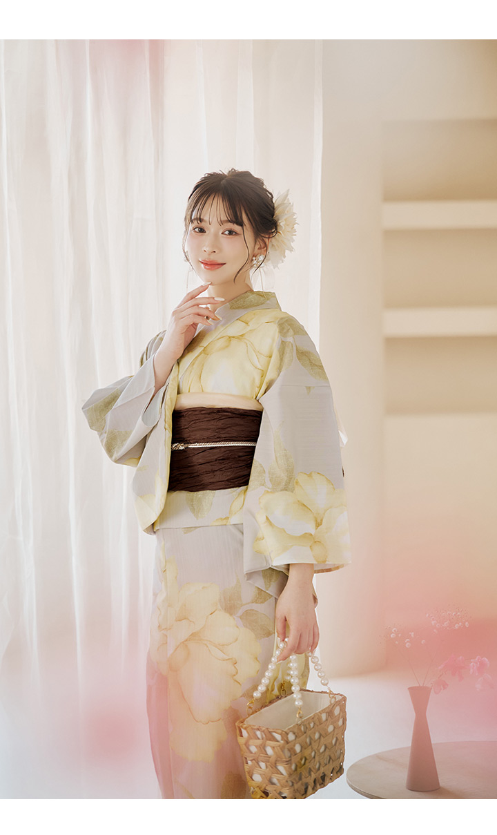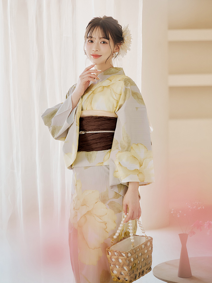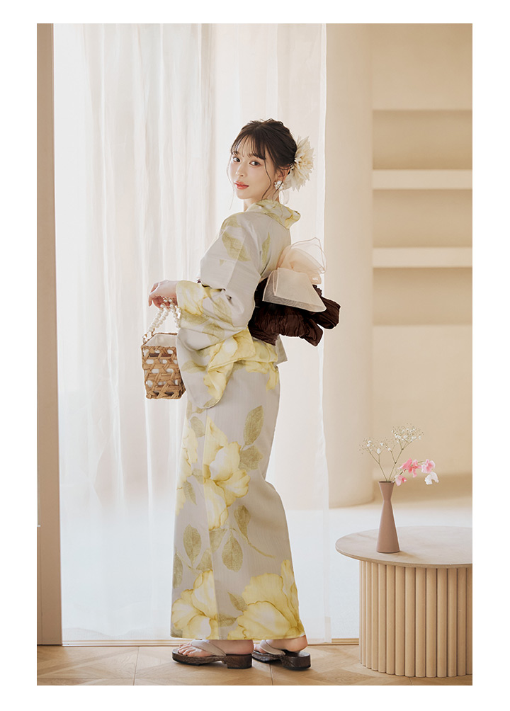 グレージュ地にイエローのラナンキュラスが可愛い大人浴衣。