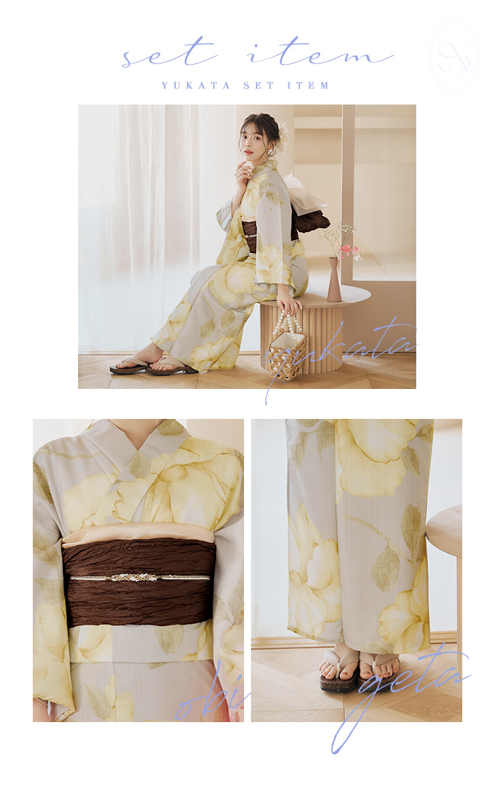 【即日発送】【浴衣セール】グレージュ×イエローフラワー浴衣 【浴衣3点セット 浴衣/帯/下駄】 [YMT] [Y-8037-nz-dzh-BE-F-24IE]
