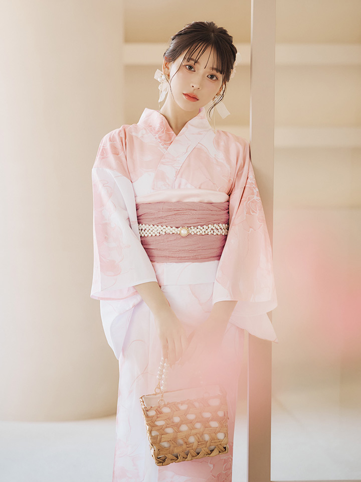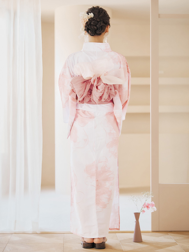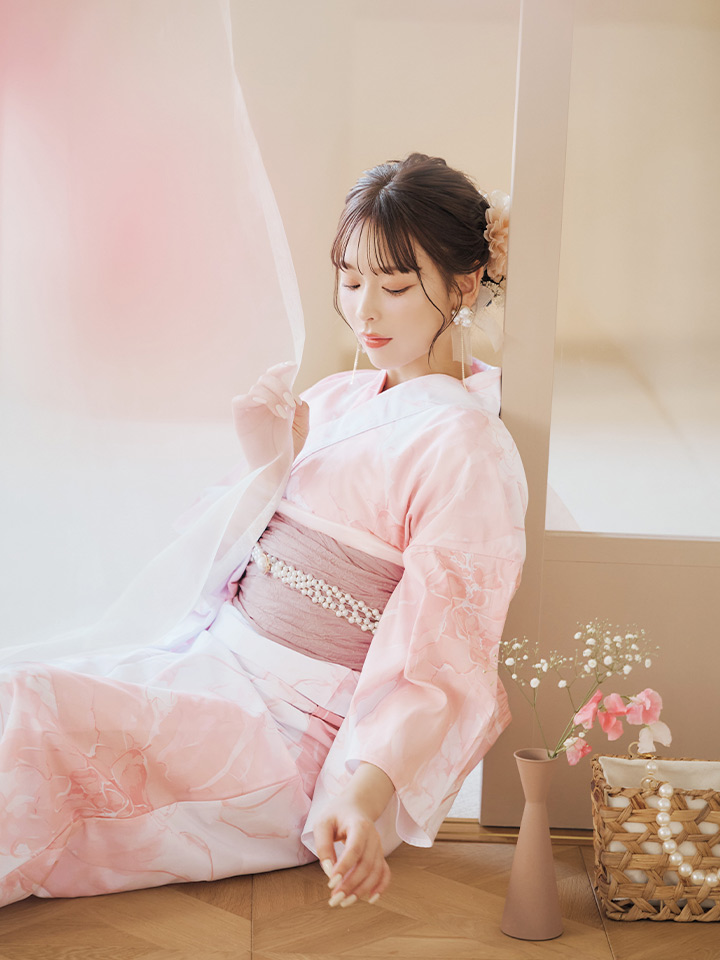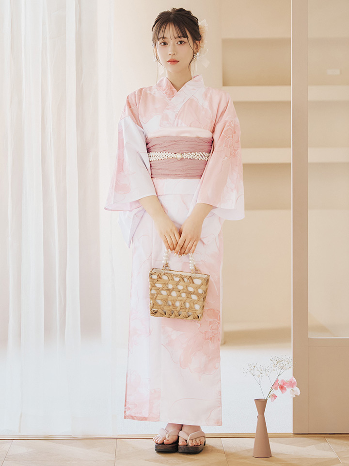 白地にピンクの組み合わせでほんのり甘さをプラスしたニュアンスフラワー浴衣♥