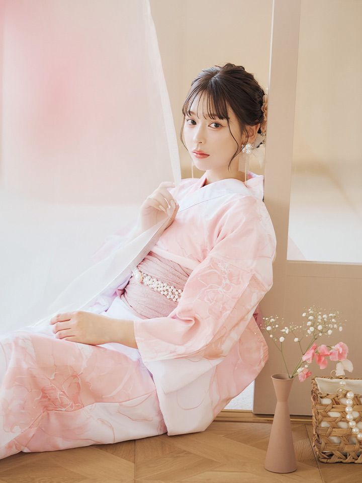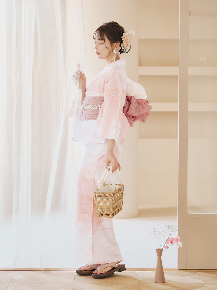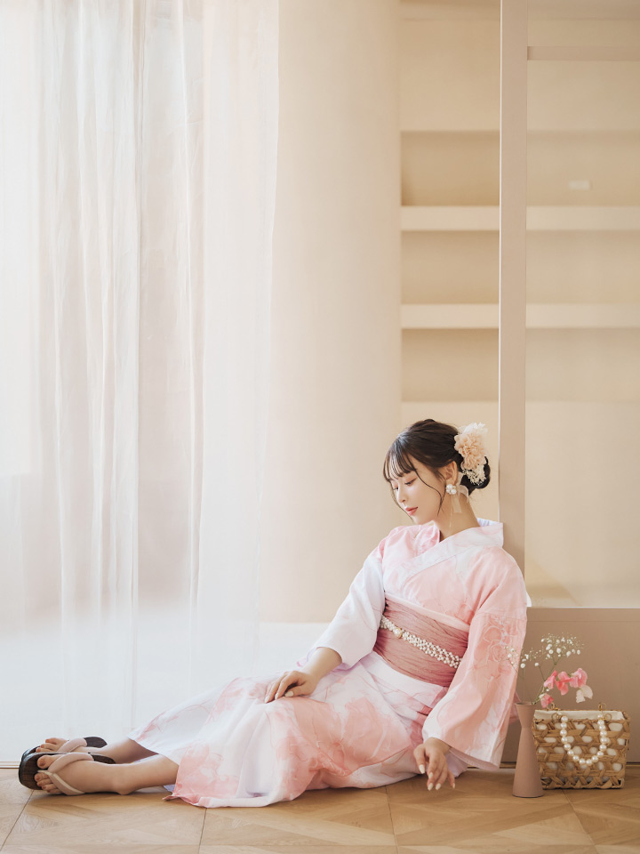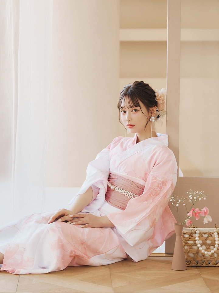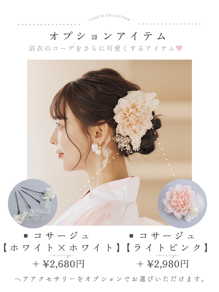 白地にピンクの組み合わせでほんのり甘さをプラスしたニュアンスフラワー浴衣♥