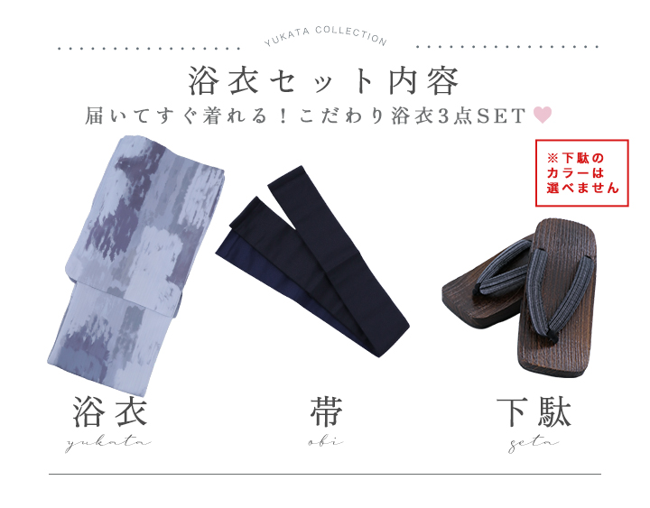 届いてすぐに着れる浴衣+帯+下駄の3点SETアイテムです。