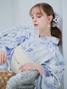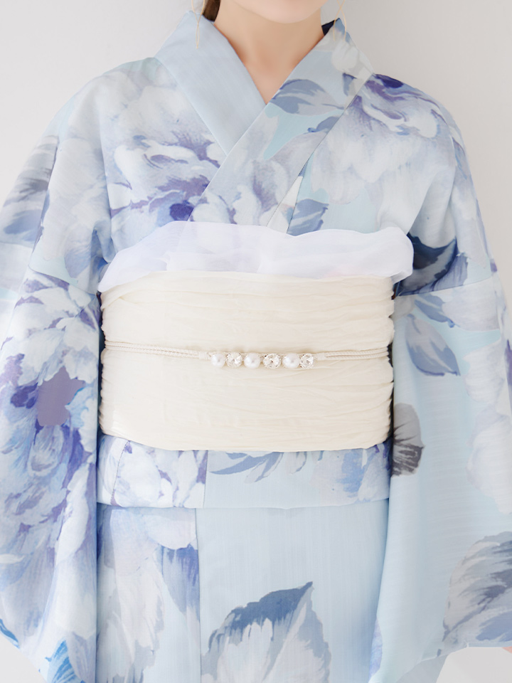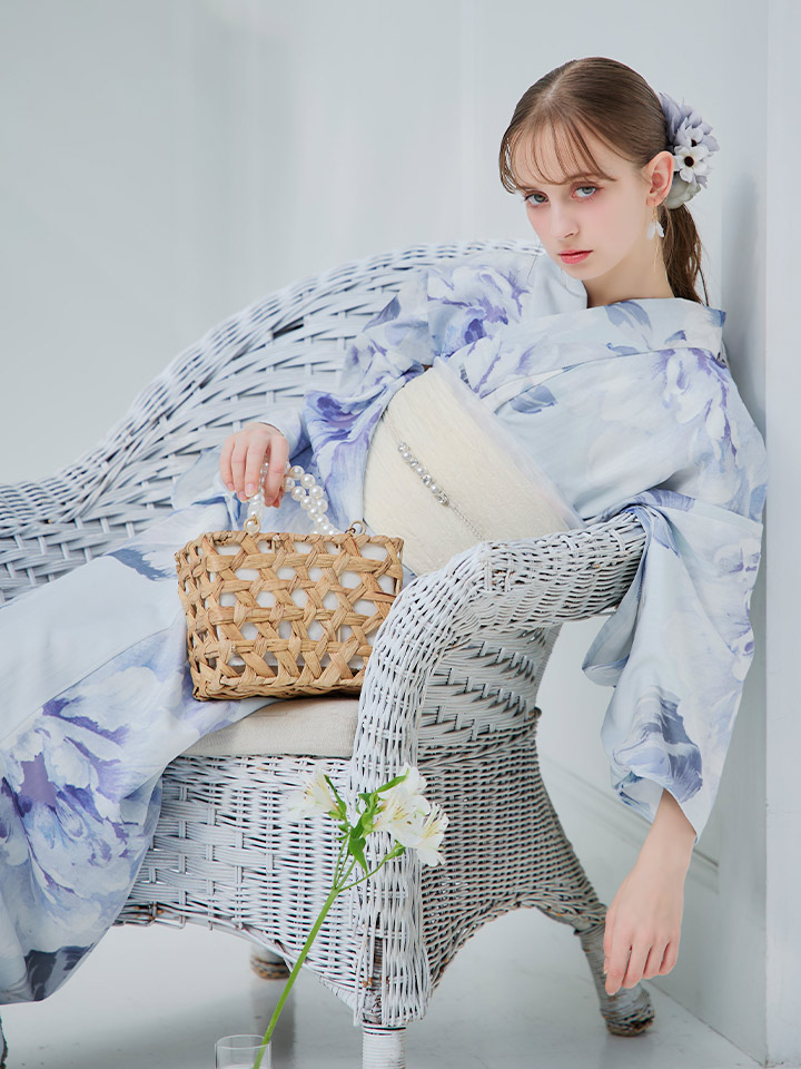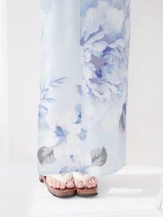 ライトブルーに咲くリッチな牡丹は気品高まる1着で周り魅了すること間違いなし。