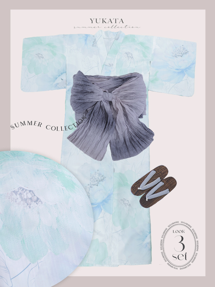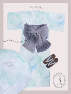【即日発送】【浴衣セール!】大柄アイシーミントフラワー浴衣 【浴衣3点セット 浴衣/帯/下駄】 [YMT] [Y-9109-nz-dzc-BL-F-25PO]