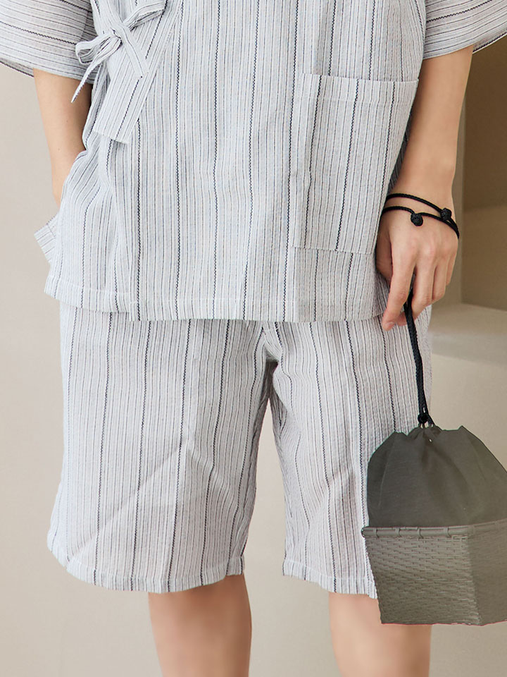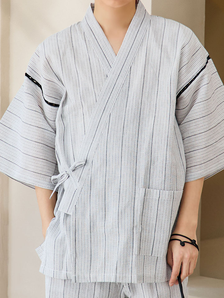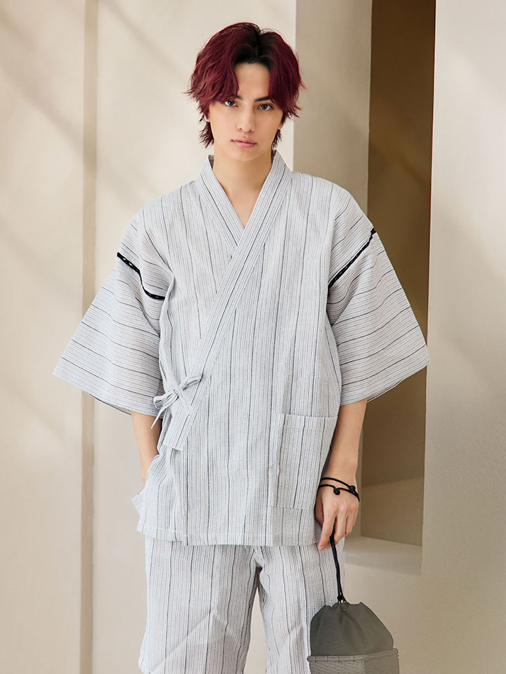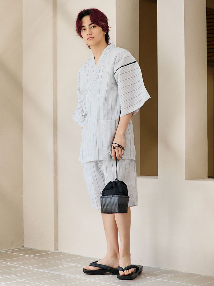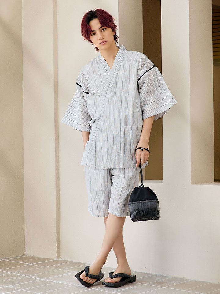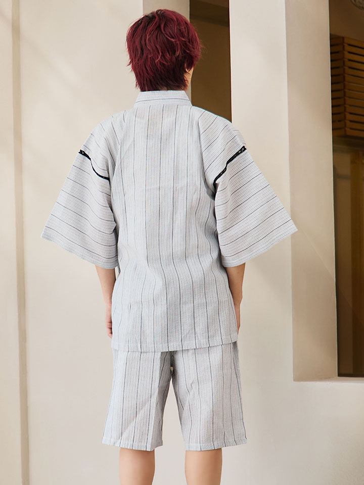 【即日発送】【メンズ甚平】白地に黒縞模様甚平【甚平・帯・下駄セット】 [YMT]