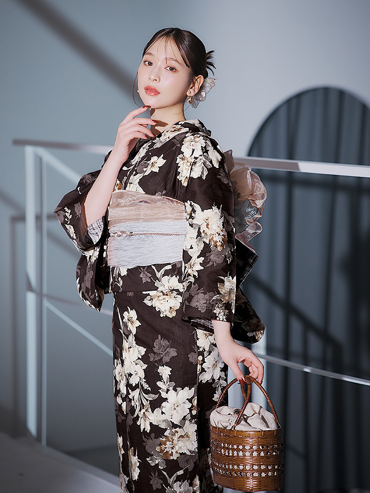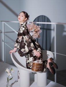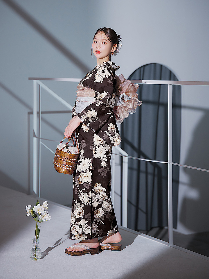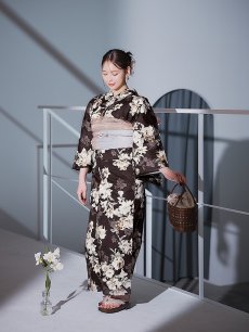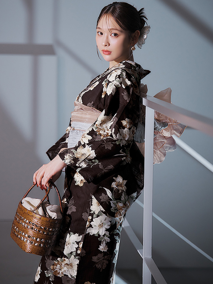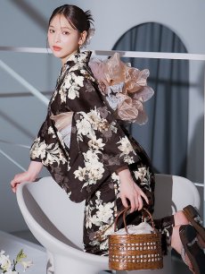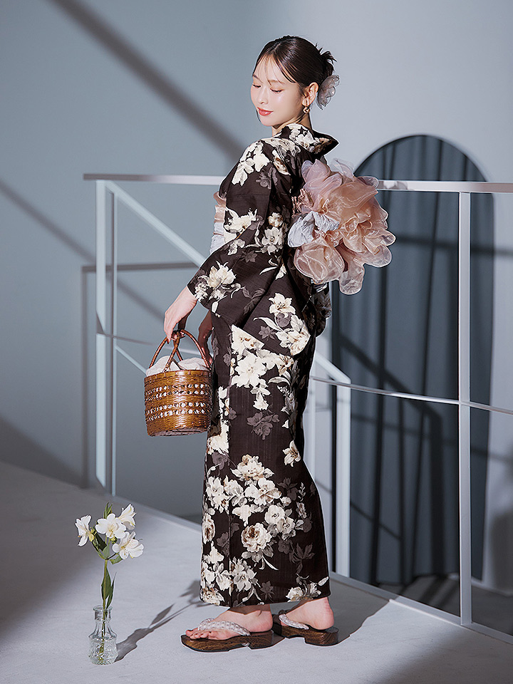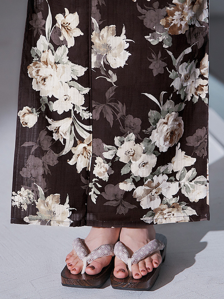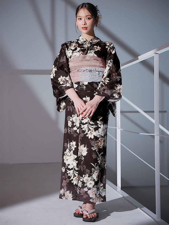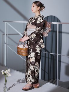 【即日発送】ブラウン地の宵染牡丹浴衣 【浴衣3点セット 浴衣/帯/下駄】 [YMT] [Y-9163-ok-BR-F-25IE]