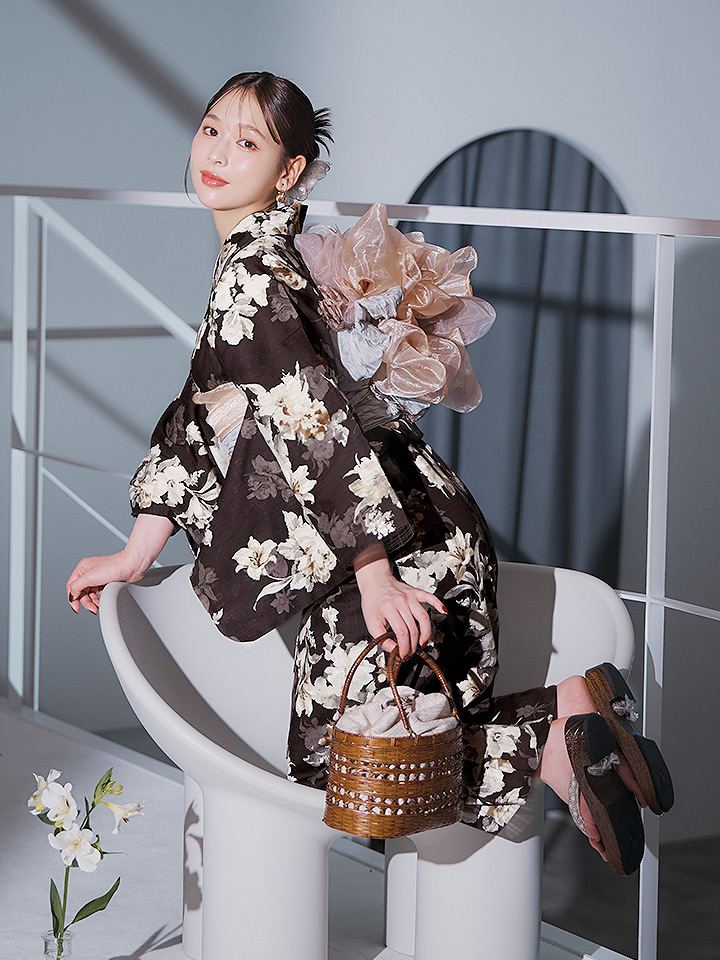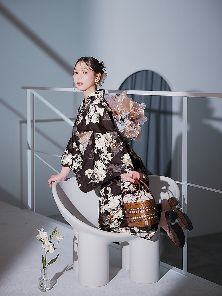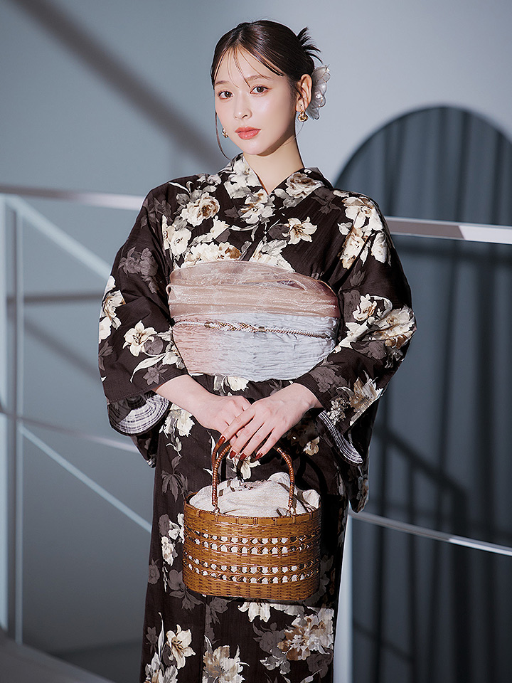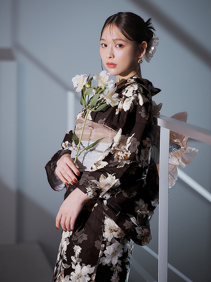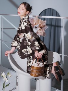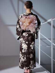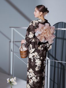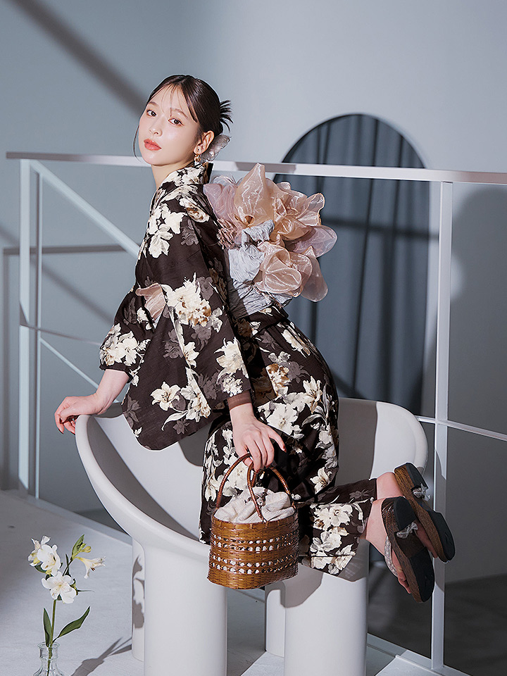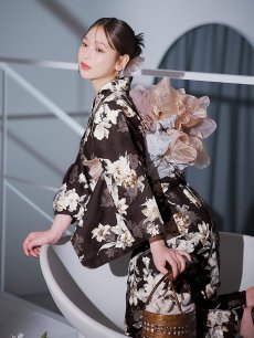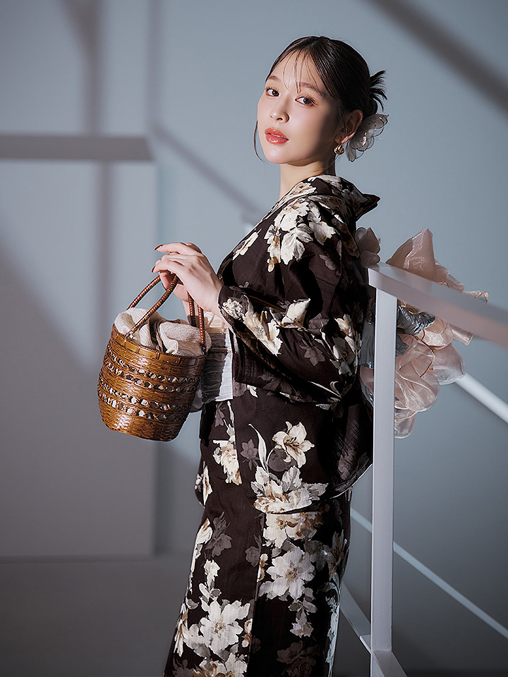 【即日発送】ブラウン地の宵染牡丹浴衣 【浴衣3点セット 浴衣/帯/下駄】 [YMT] [Y-9163-ok-BR-F-25IE]