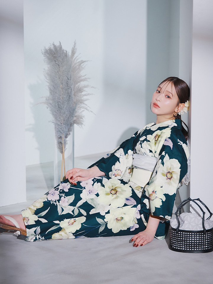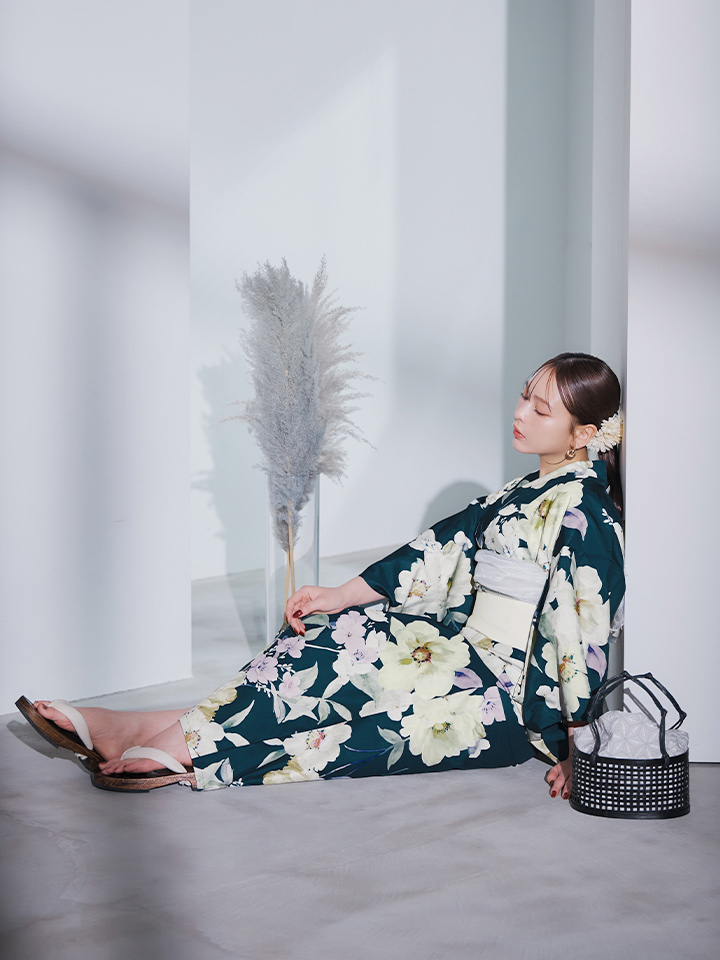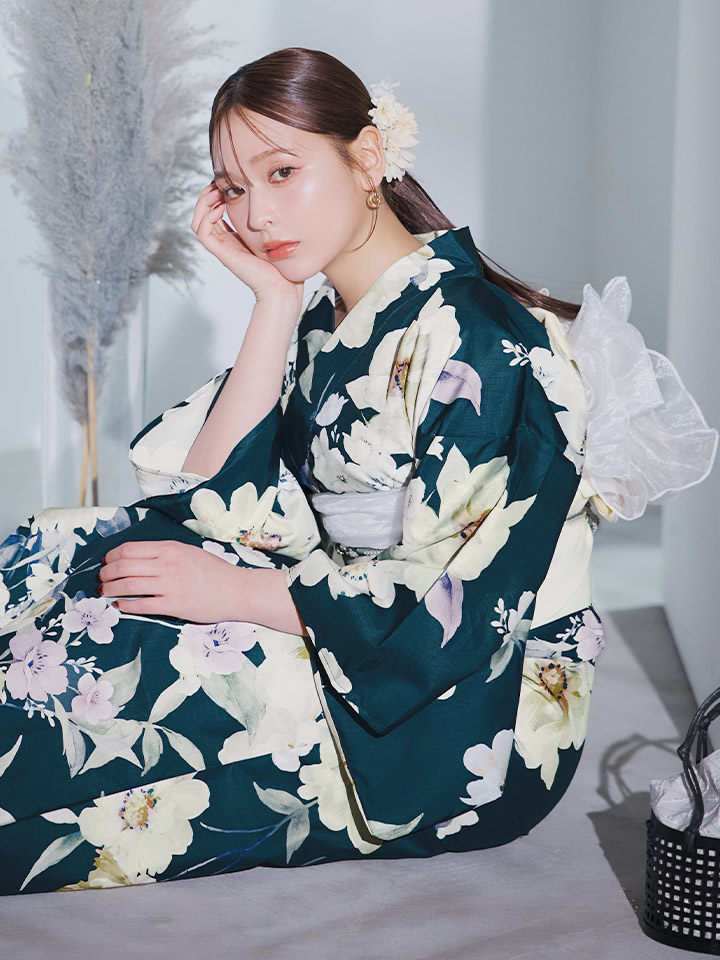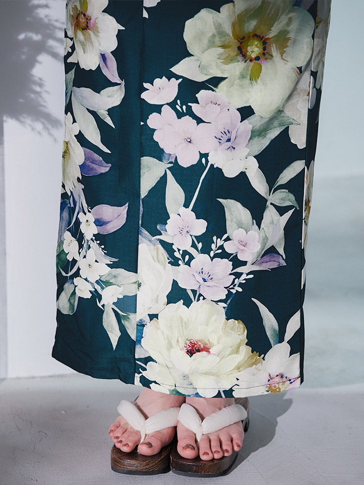 オシャレなダークグリーンカラーが魅力を放つ一目で視線を集める大人レトロモダン浴衣