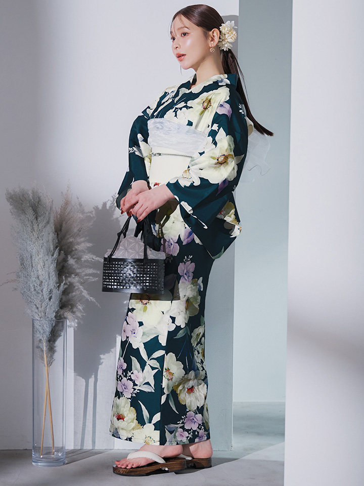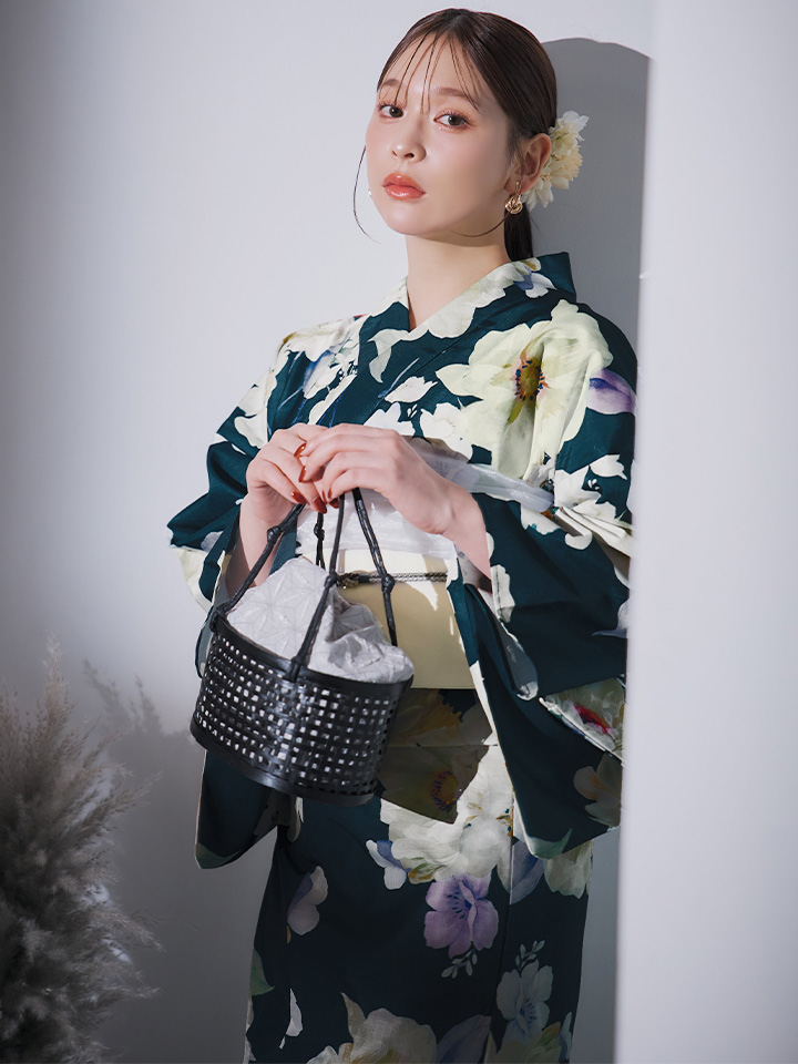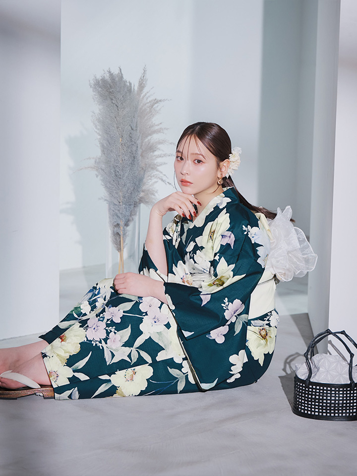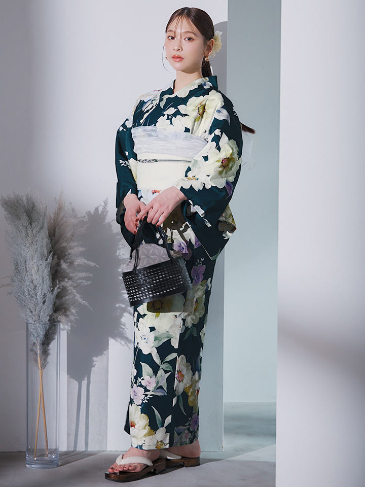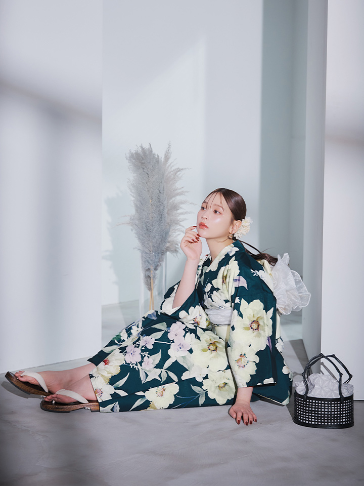 オシャレなダークグリーンカラーが魅力を放つ一目で視線を集める大人レトロモダン浴衣